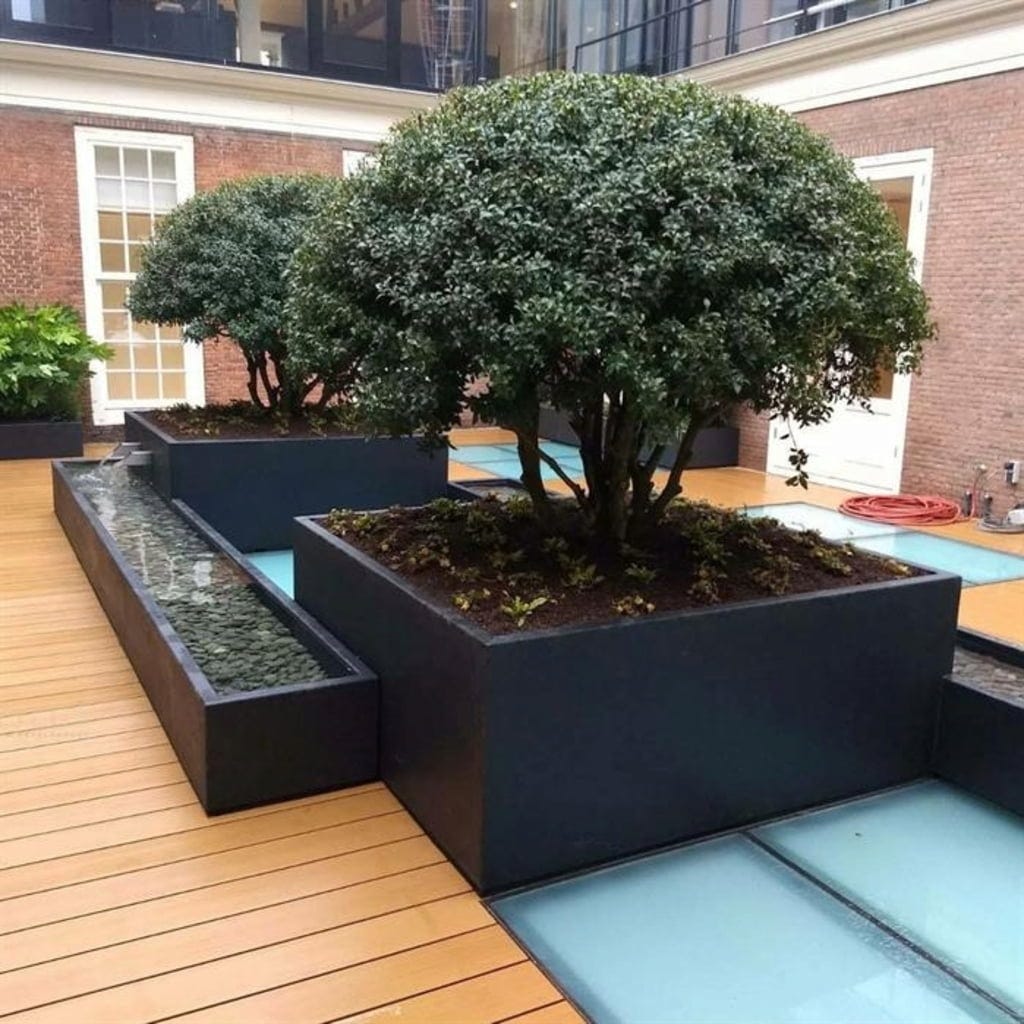 Das Pflanzgefäß Carrez setzt mit seiner rechteckigen Form ein klares Statement und eignet sich besonders gut für moderne Gärten oder als gezielter Stilbruch. Mit den passenden Pflanzen bestückt, kannst du es auch als eleganten Raumtrenner oder Sicht- und Windschutz nutzen und schaffst gleichzeitig eine gemütliche Atmosphäre.