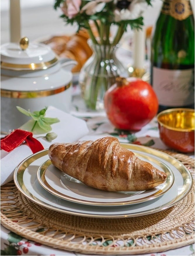 Die Marke Augarten schafft es, das Croissant zu einer schönen Dekoration für das Heim umzufunktionieren. Die Porzellandose ist naturalistisch bemalt und sieht dem echten Leckerbissen unfassbar ähnlich. Die 18 cm große Dose ist optimal als Tischdeko oder Geschenk geeignet und wird mit zwei schmackhaften Konfitüren geliefert.