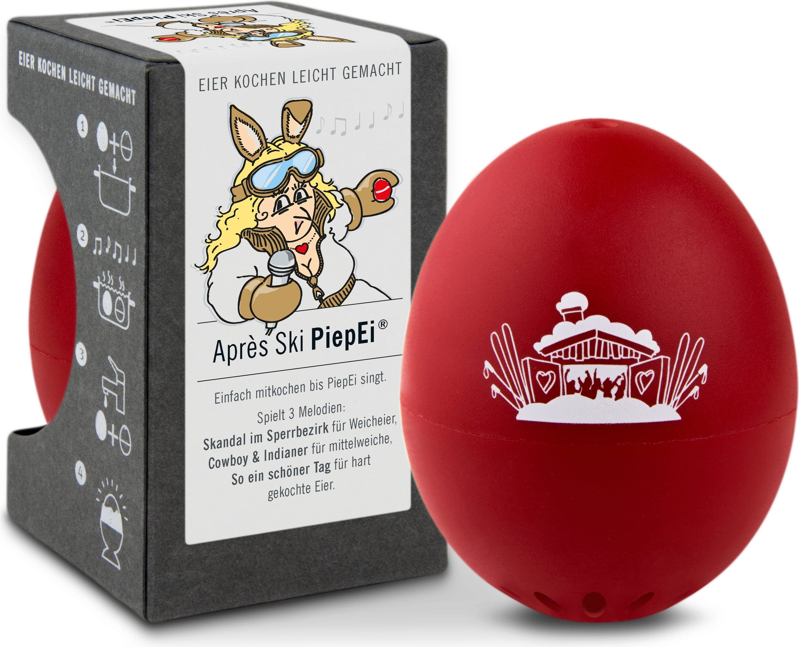 Einfach das Après Ski PiepEi mit den Eiern lagern, gemeinsam kochen und warten, bis die Melodie des gewünschten Härtegrades spielt. Unabhängig davon, mit welcher Wassertemperatur man startet, welche Eiergröße und auf welcher Höhe gekocht wird.