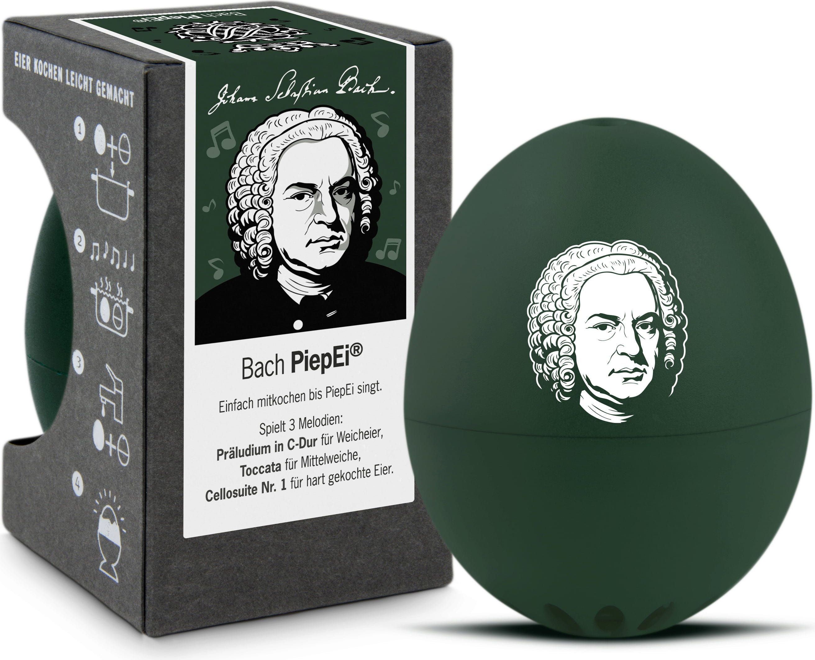Einfach das Bach PiepEi mit den Eiern lagern, gemeinsam kochen und warten, bis die Melodie des gewünschten Härtegrades spielt. Unabhängig davon, mit welcher Wassertemperatur man startet, welche Eiergröße und auf welcher Höhe gekocht wird.