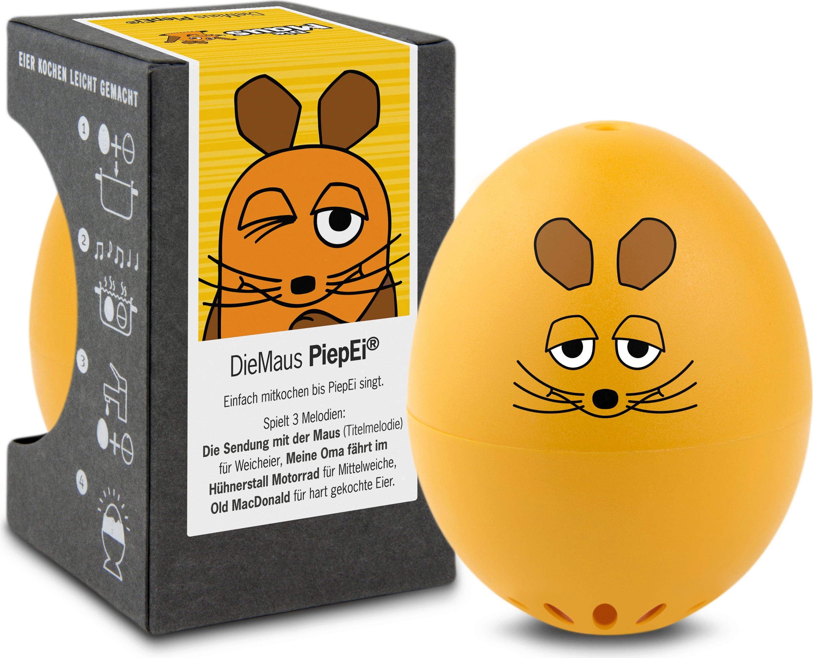 Einfach das Maus PiepEi mit den Eiern lagern, gemeinsam kochen und warten, bis die Melodie des gewünschten Härtegrades spielt. Unabhängig davon, mit welcher Wassertemperatur man startet, welche Eiergröße und auf welcher Höhe gekocht wird.