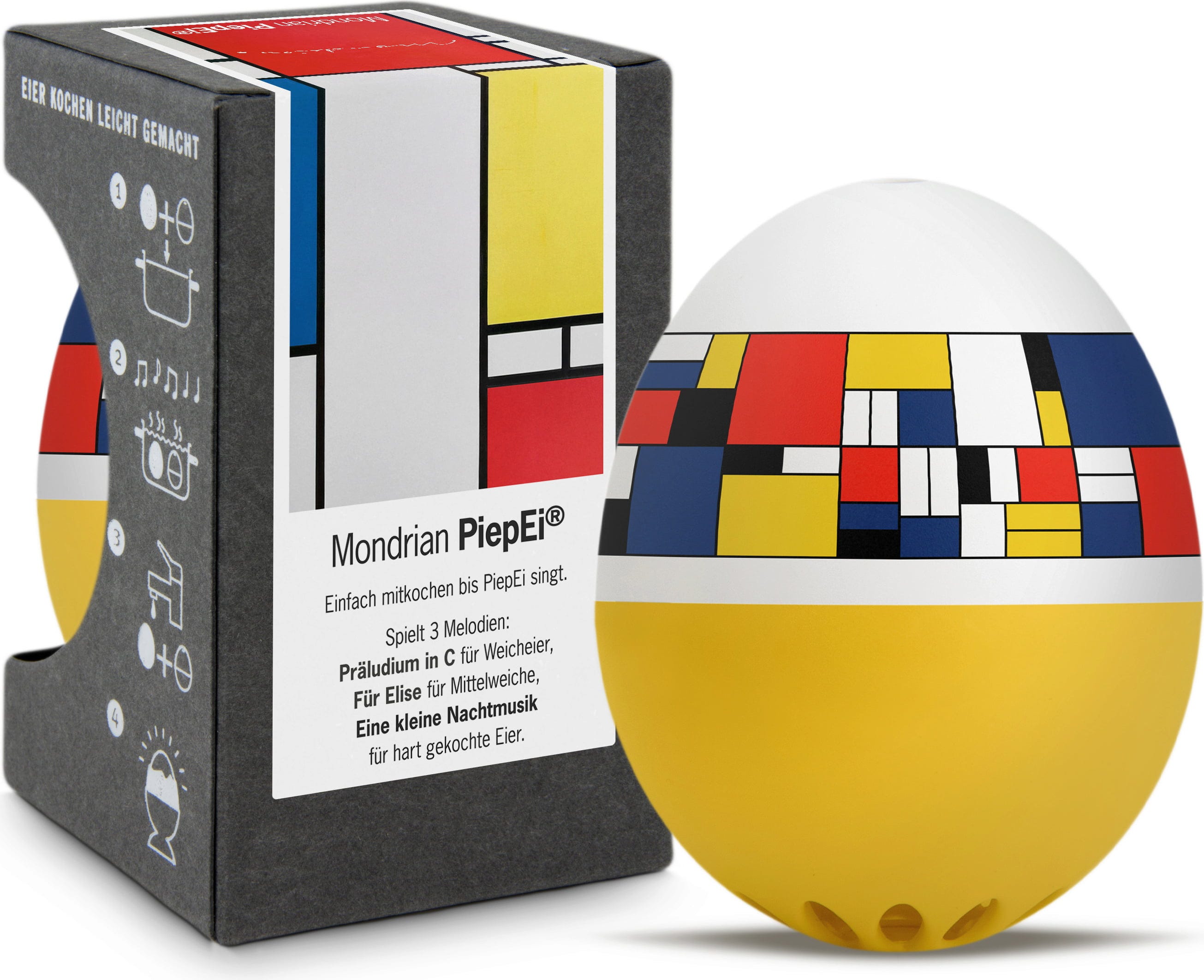 Einfach das Mondrian PiepEi mit den Eiern lagern, gemeinsam kochen und warten, bis die Melodie des gewünschten Härtegrades spielt. Unabhängig davon, mit welcher Wassertemperatur man startet, welche Eiergröße und auf welcher Höhe gekocht wird.
