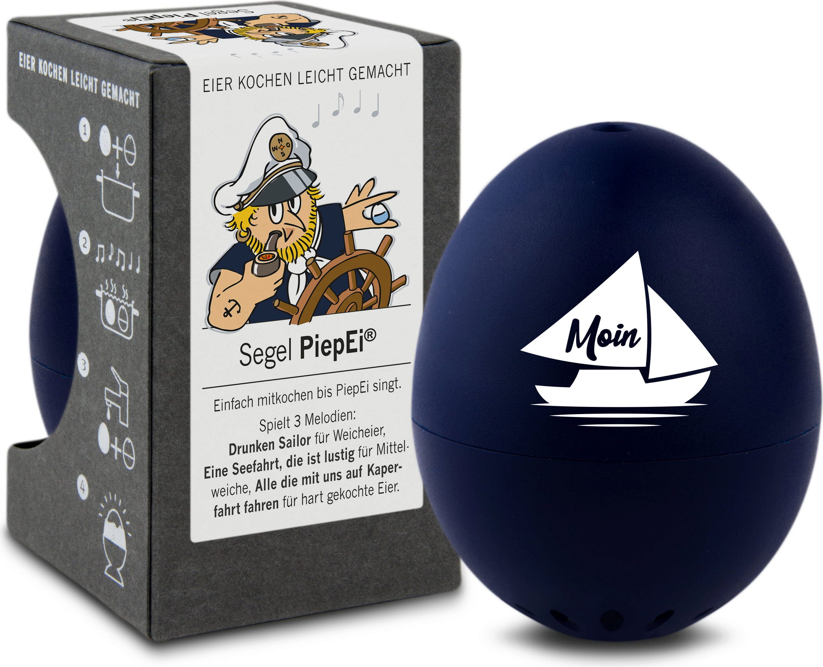 Einfach das Segel PiepEi mit den Eiern lagern, gemeinsam kochen und warten, bis die Melodie des gewünschten Härtegrades spielt. Unabhängig davon, mit welcher Wassertemperatur man startet, welche Eiergröße und auf welcher Höhe gekocht wird.