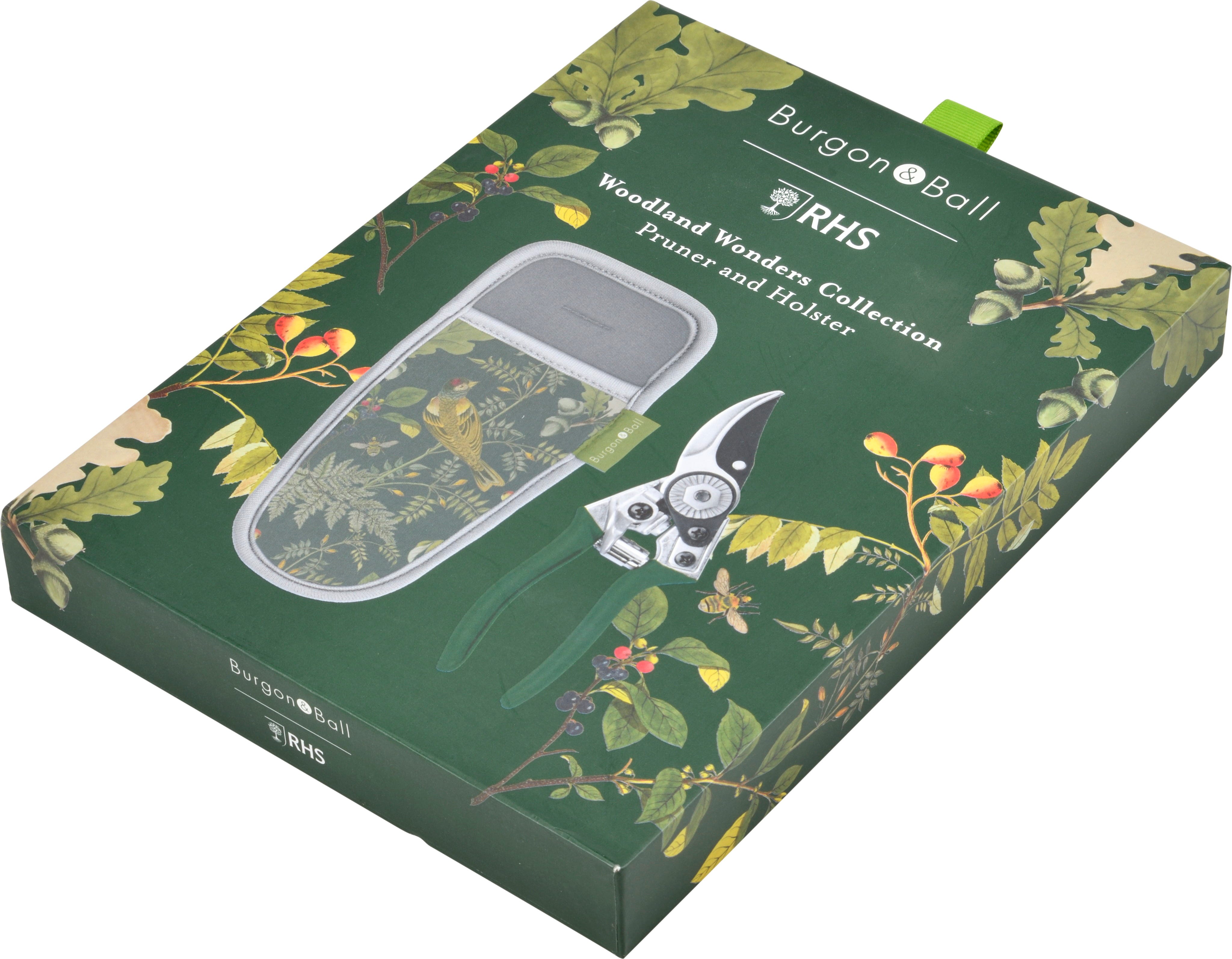 Damit du die Schere bei deiner Tour durch den Garten immer griffbereit hast, gehört ein passendes Neopren-Holster zum Set, das bequem am Gürtel befestigt werden kann. Das Design besticht durch historische Illustrationen aus den RHS-Archiven, die auf einem tiefgrünen Hintergrund die Ruhe des Waldes ausstrahlen.