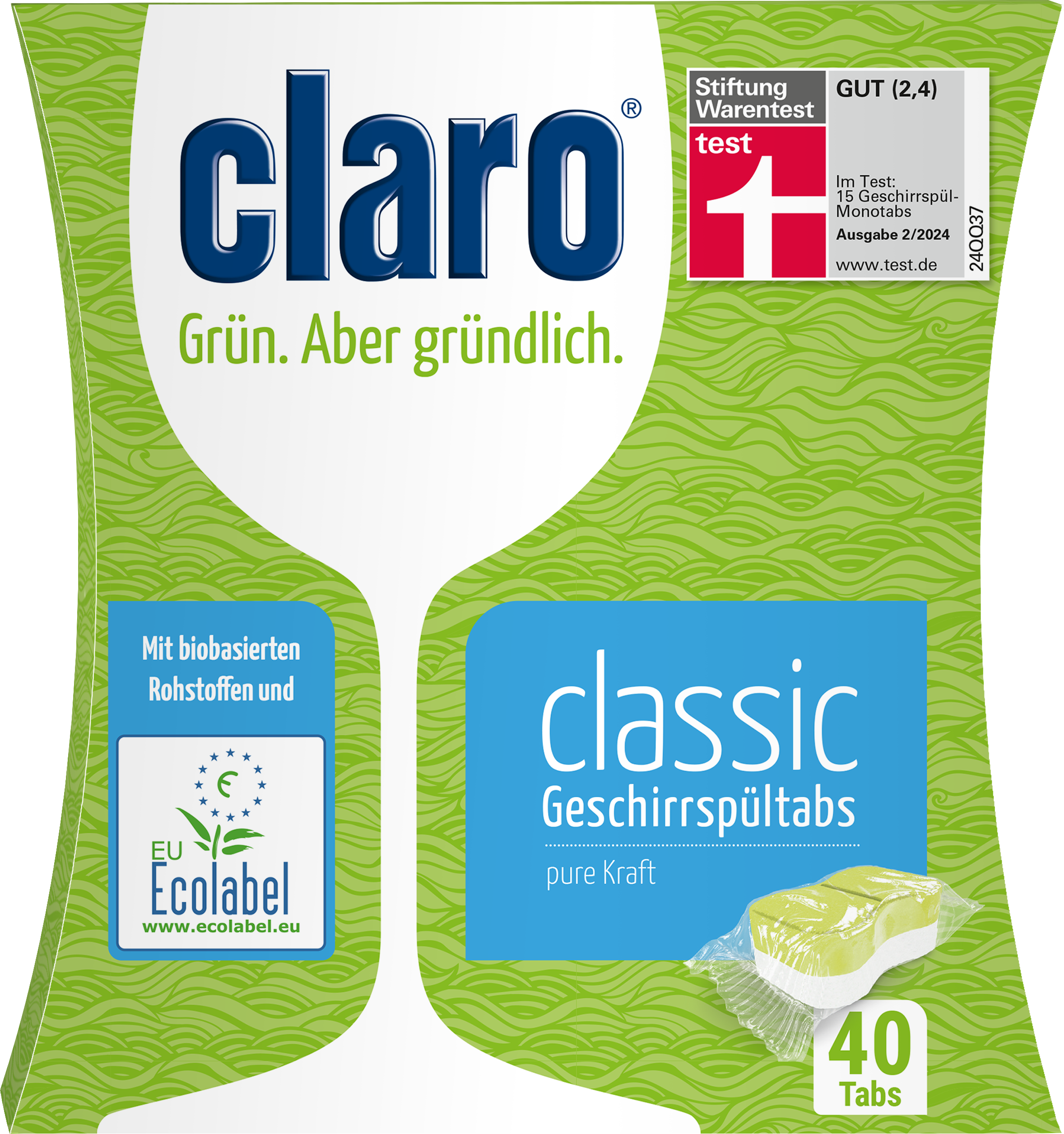 Die Classic-Tabs von claro sind ein zuverlässiges Mittel gegen verschmutztes Geschirr und entfernen selbst hartnäckige, eingetrocknete Speisereste mühelos. Sie sind einzeln in wasserlöslicher Folie verpackt und entfalten während des Spülgangs nach und nach ihre Wirkung. Die Tabs wirken durch den Krustenlöser-Effekt sehr kraftvoll gegen Verschmutzungen, sind dabei aber dank des Glas- und Dekorschutzes auch sanft zum Geschirr. Der Niedrigtemperatur-Aktivator ermöglicht schon bei geringen Temperaturen strahlende Ergebnisse.