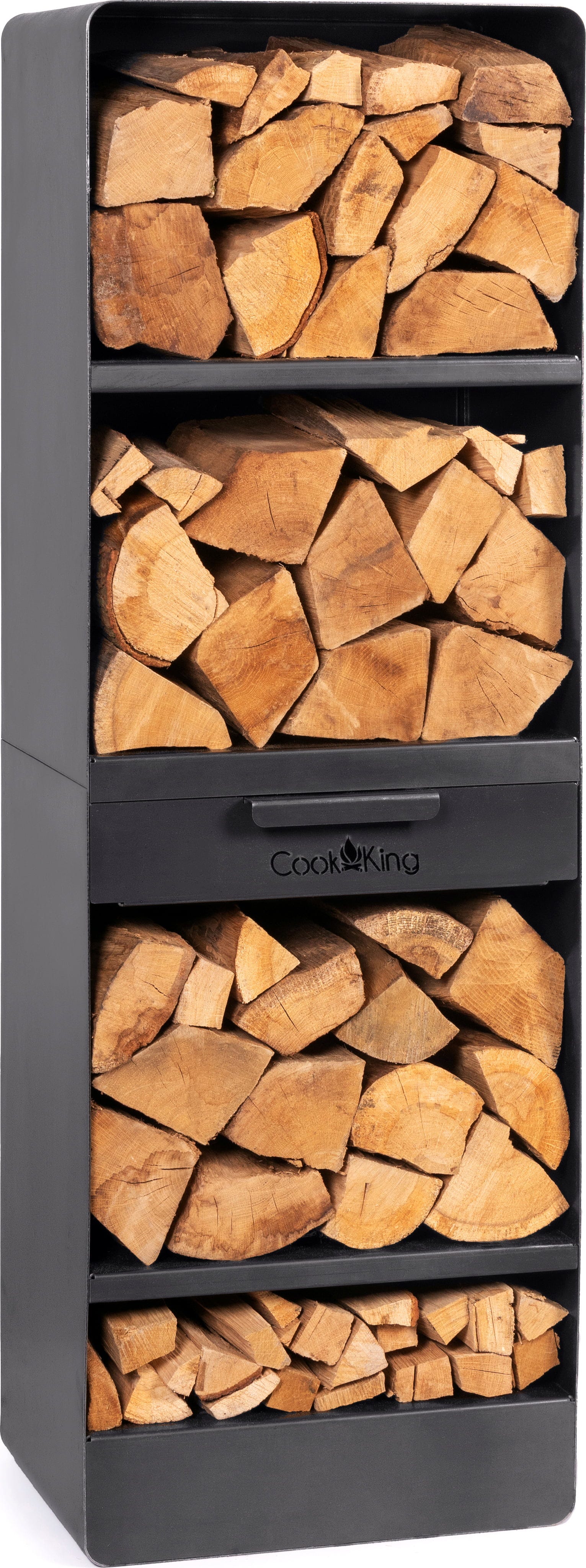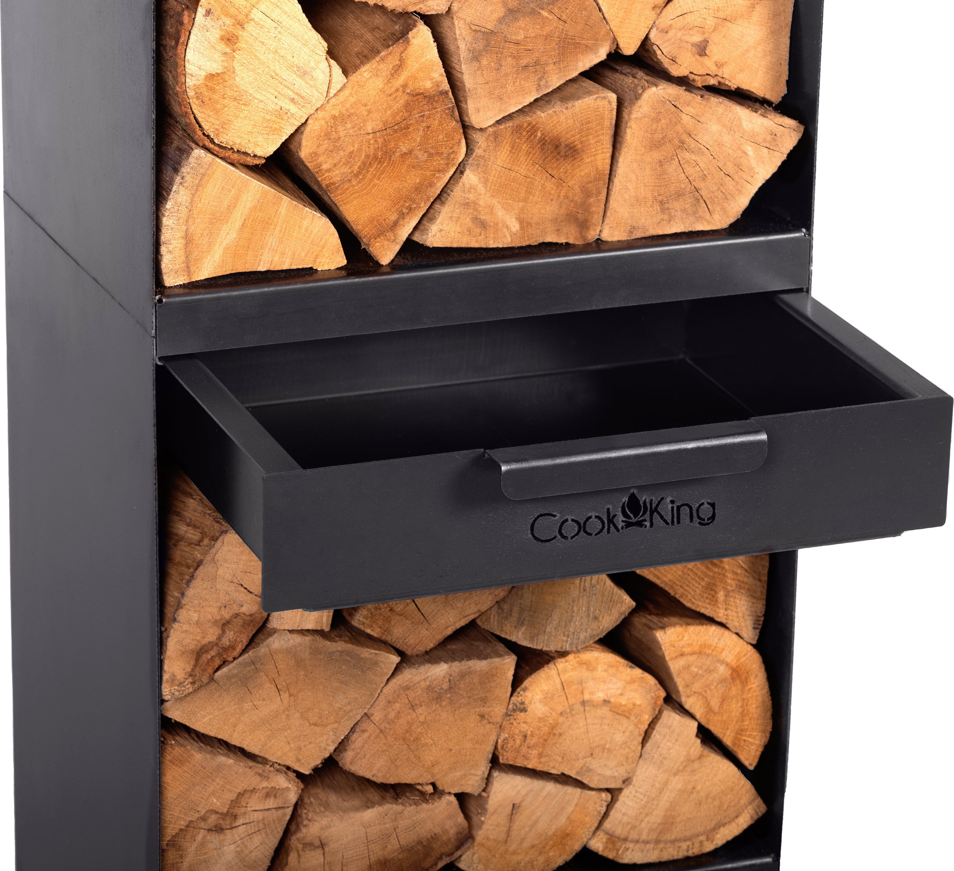Die durchdachte Aufteilung in verschiedene Ablageflächen ermöglicht es dir, dein Holz nach Größe zu sortieren, sodass du für jede Phase des Feuers das passende Stück griffbereit hast. Ein besonderes Detail ist die integrierte, dezent platzierte Schublade: Hier finden Anzünder und Streichhölzer einen festen Platz, sodass das ästhetische Gesamtbild nicht durch herumliegende Utensilien gestört wird.