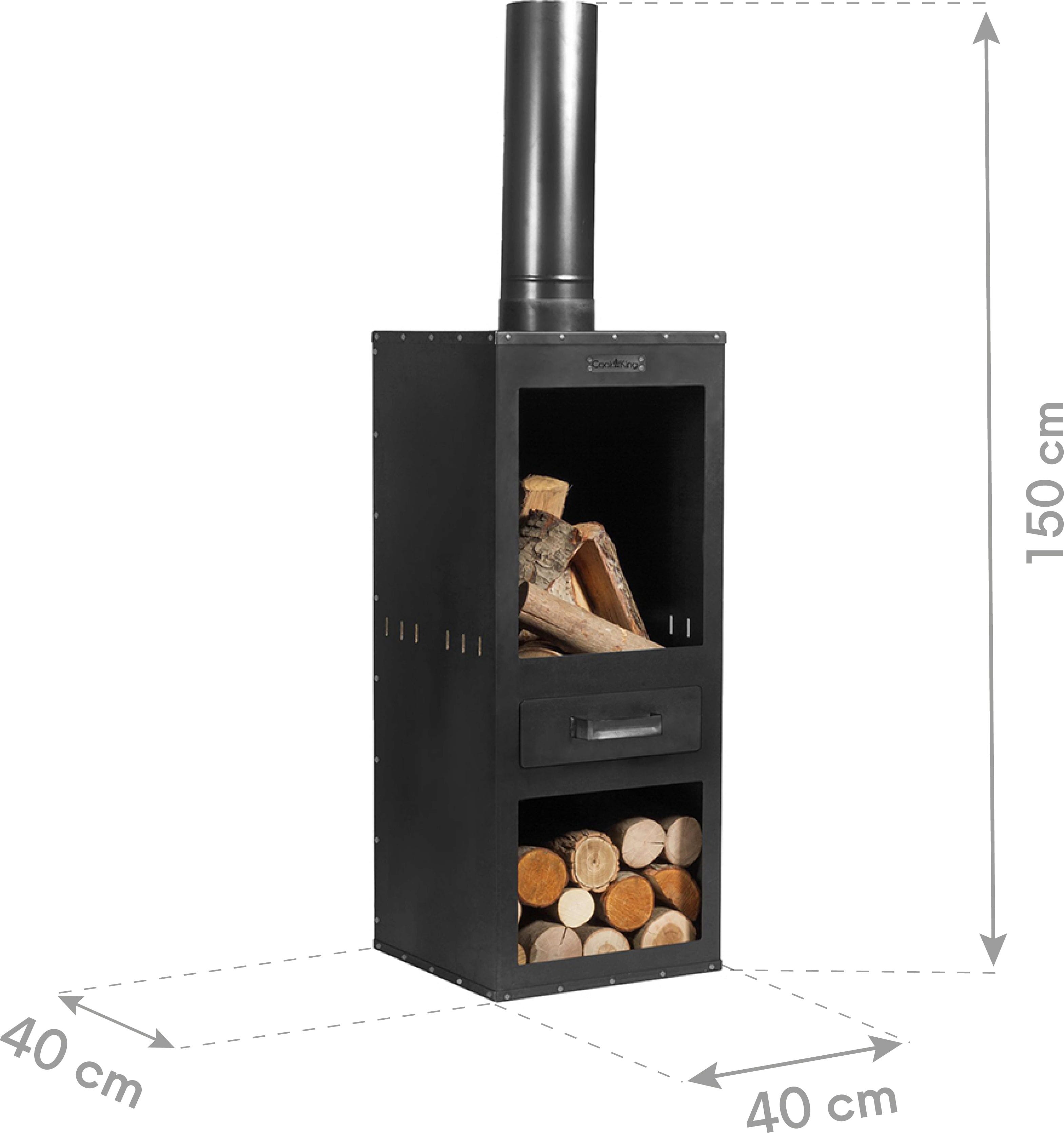 Der großzügige Brennraum nimmt mühelos größere Holzscheite auf und sorgt für ein beeindruckendes Flammenbild, während der markante Rauchabzug dafür sorgt, dass du und deine Gäste den Abend ohne störende Rauchentwicklung genießen könnt. Besonders durchdacht ist das Handling: Im Sockel des Ofens findest du ein integriertes Holzlager, damit der Nachschub immer in Griffweite bleibt.