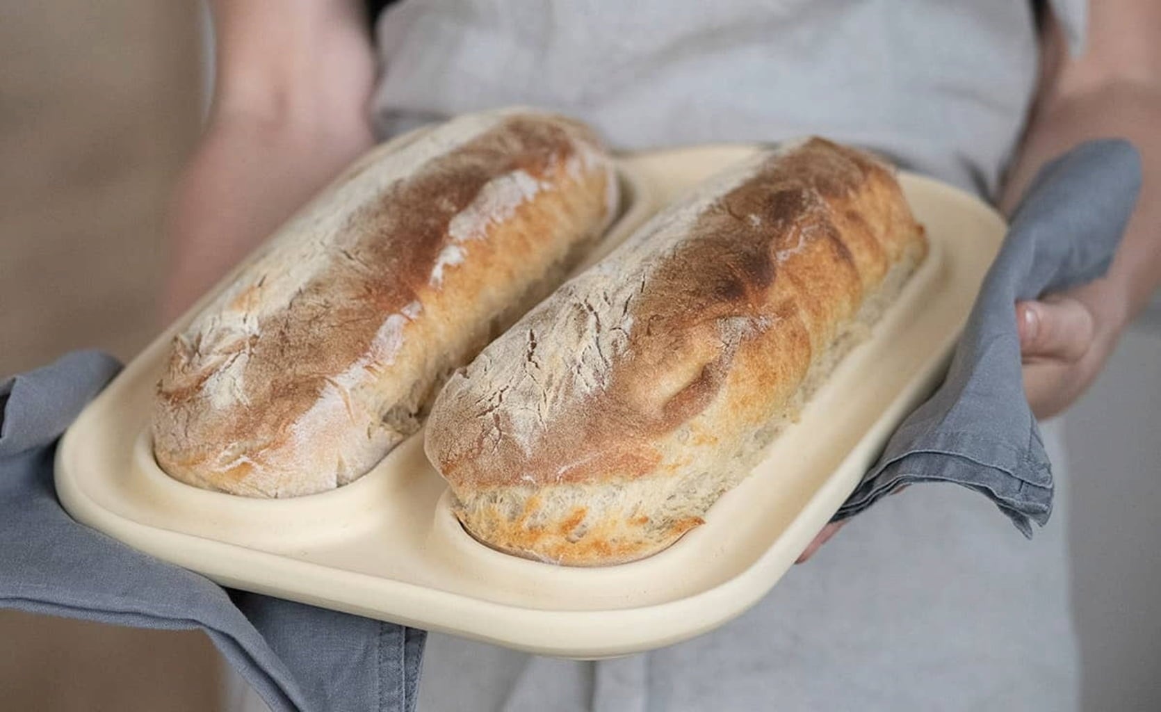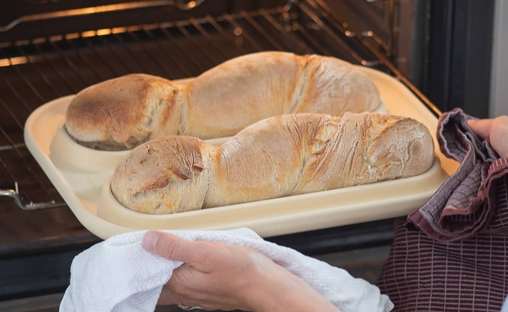 Die patentierte Backrinne ist das Geheimnis dieser Backform. Sie wird vor dem Backen mit Wasser befüllt und sorgt so für eine gleichmäßige Verdunstung im Backofen, durch die ein Feuchtigkeitsschirm um das Backgut gelegt wird. Baguette kann so eine wunderbar knusprige Kruste aufbauen, während es innen herrlich flaumig und luftig bleibt.