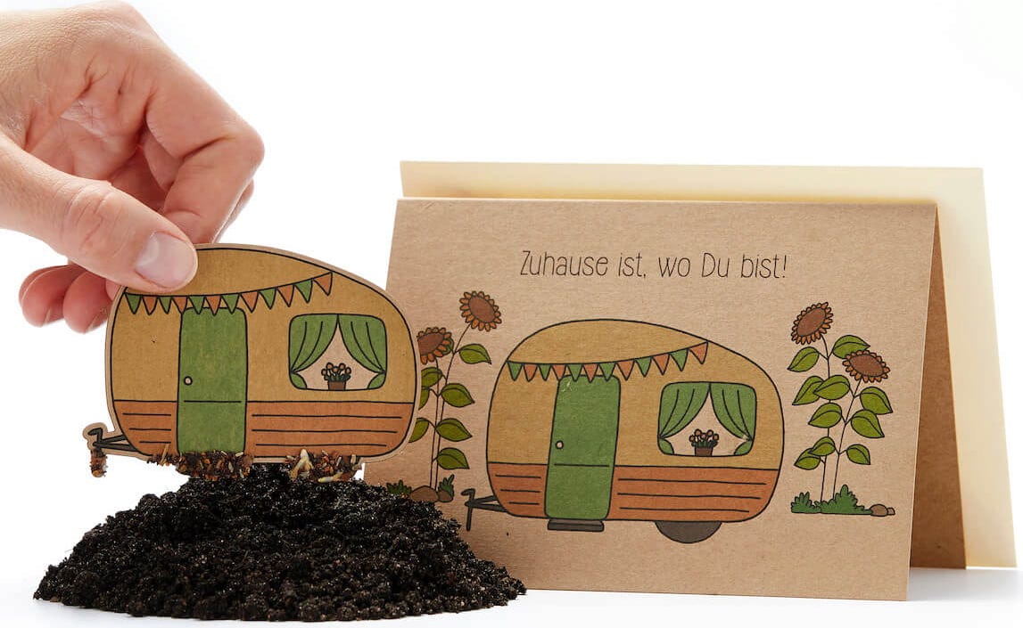 Da der Wohnwagen zusätzlich auf die Karte gedruckt ist, bleibt das Motiv auch nach dem Entfernen des Saatpapiers erhalten.
