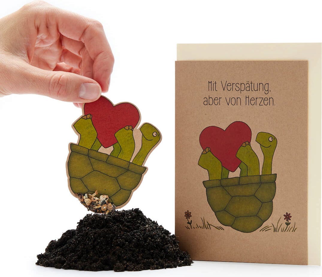 Da Schildkröten leider nicht zu den Schnellsten gehören, kann es schon einmal etwas länger dauern, bis Glückwünsche ankommen. Umso größer ist dann jedoch die Freude, wenn der Überbringer so süß ist wie auf dieser Karte. Und das Beste daran: Die kleine Schildkröte bringt neben Glückwünschen auch jede Menge Saatgut, aus dem die schönsten Wildblumen wachsen. Löse die Schildkröte einfach von der Karte, stecke sie in Erde und gieße gut an. Schon nach kurzer Zeit sollten sich die ersten zarte Triebe zeigen.