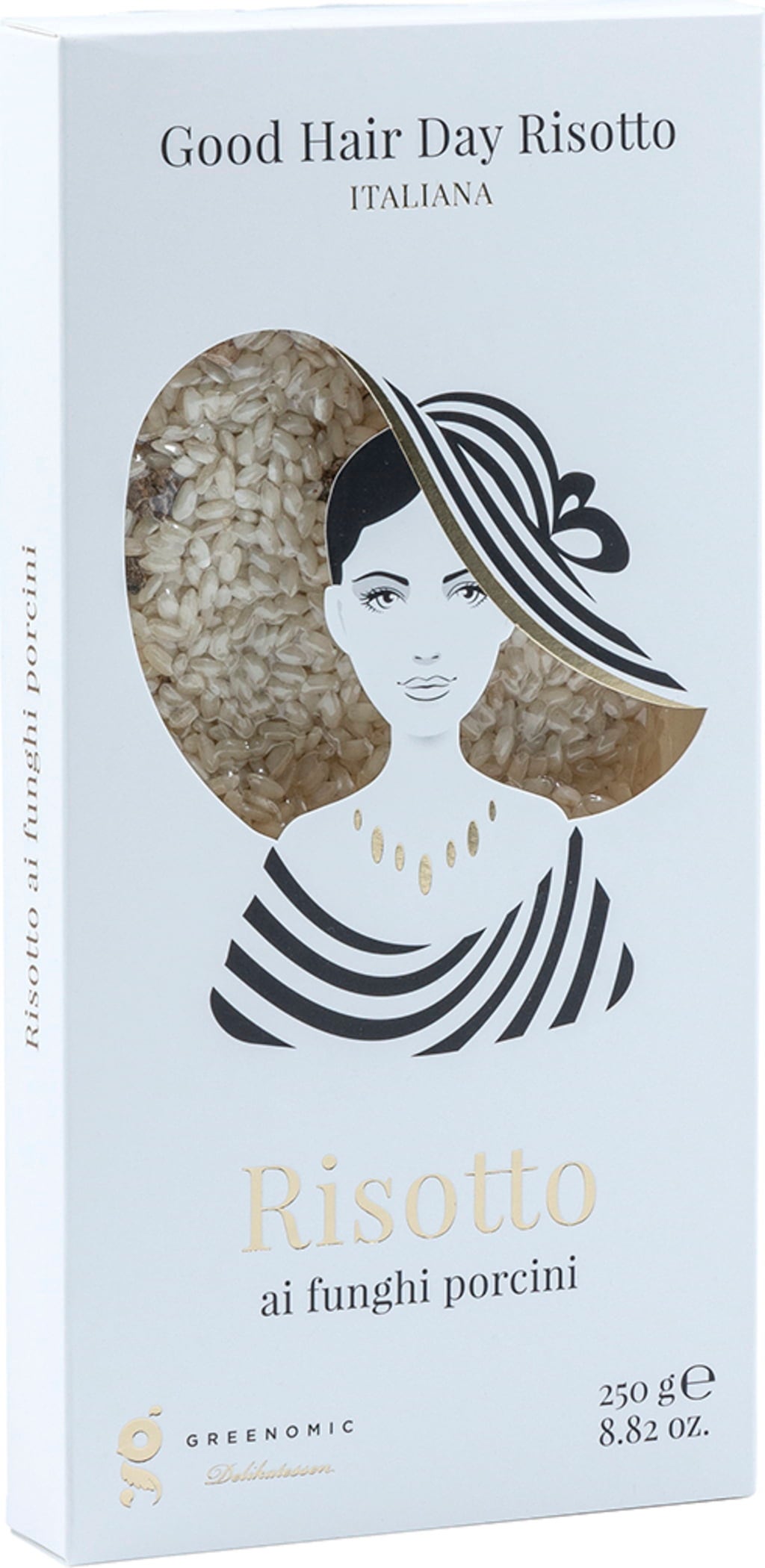 Good Hair Day Risotto ai funghi porcini – der köstliche Arborio-Reis wurde mit Steinpilzen veredelt und ist eine exzellente Beilage zu vielerlei Gerichten. Durch die originelle Verpackung macht das italienische Risotto nicht nur im eigenen Vorratsschrank eine gute Figur.