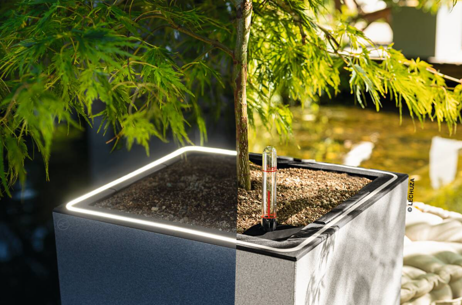 Ein clever eingebautes LED-Lichtband beleuchtet die Pflanzen von unten und sorgt für ein faszinierendes Ambiente – egal ob auf der Terrasse, dem Balkon oder im Wohnzimmer. Für ein Extra an Komfort sorgt das LECHUZA-Bewässerungssystem sowie der herausnehmbare Pflanzeinsatz.