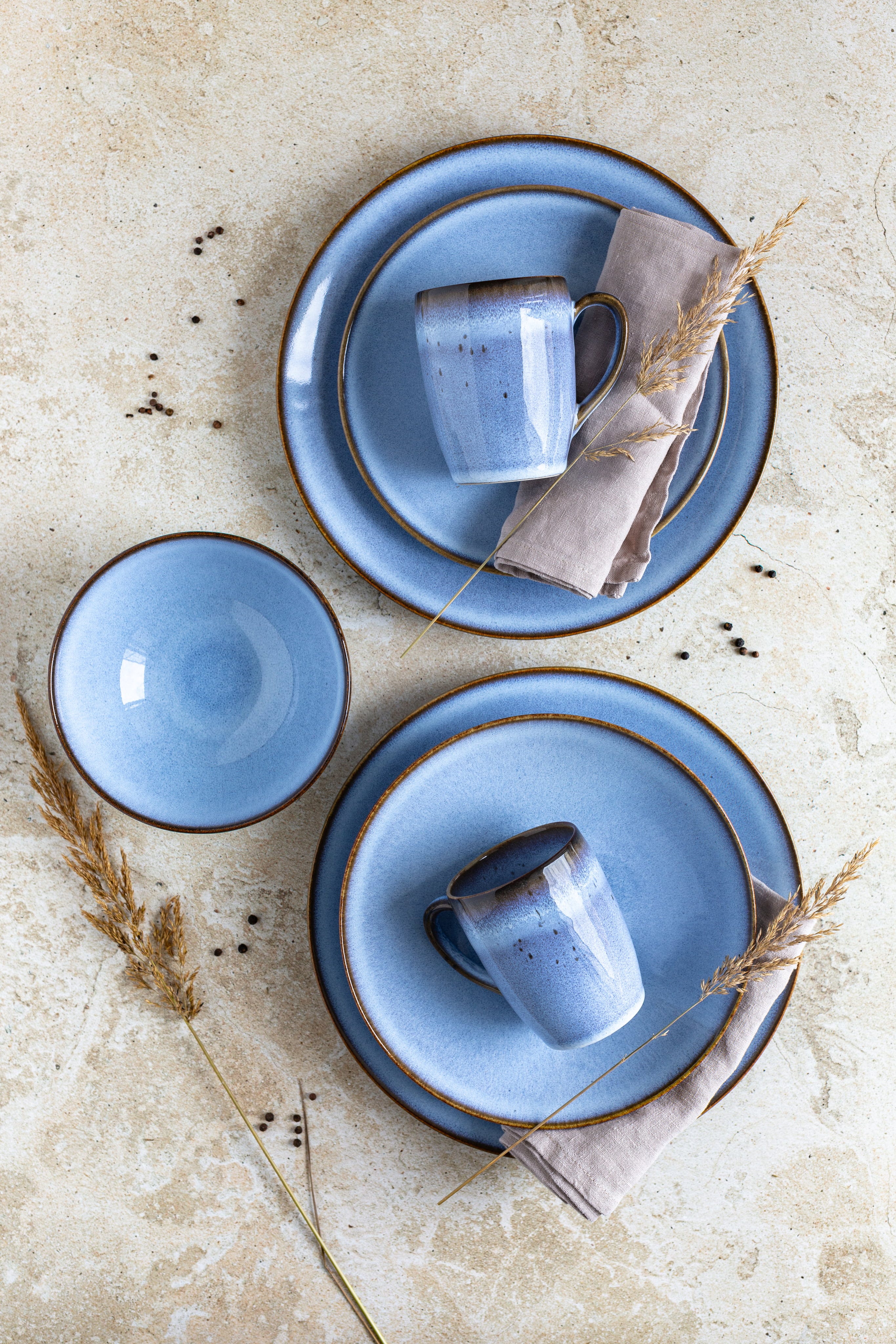 Starte perfekt in deinen Tag und genieße dein Frühstück in einer Atmosphäre voller Ruhe und nordischer Gelassenheit! Dieses zwölfteilige Set aus der beliebten Smoky’s-Serie bringt mit seiner speziellen Reaktivglasur echte Unikate auf deinen Tisch, da jedes Teil durch individuelle Farbverläufe im sanften Blau besticht.