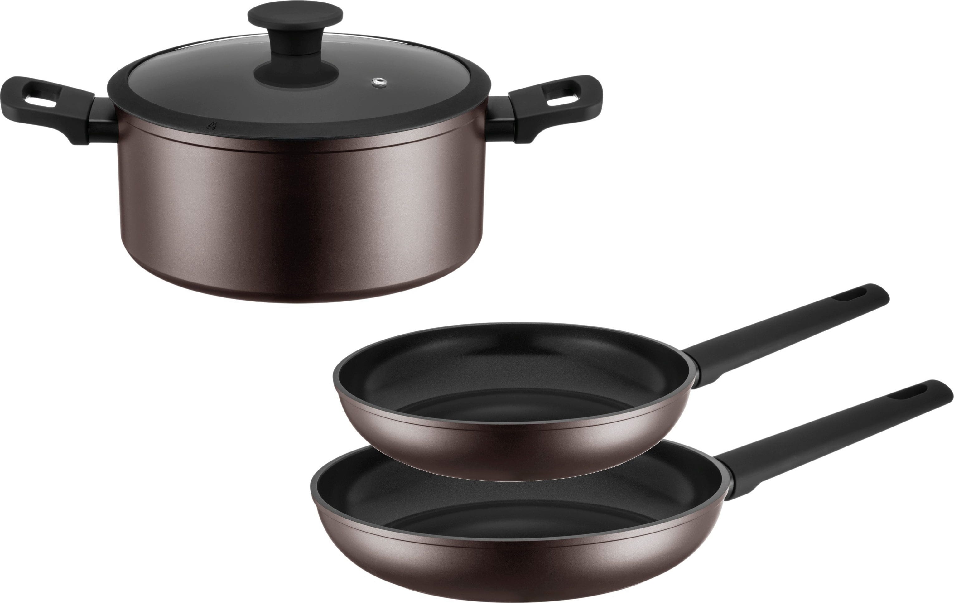 Das Set bietet dir mit zwei Bratpfannen und einem Kochtopf inklusive Glasdeckel die ideale Grundausstattung für perfekte Ergebnisse. Dank des robusten Aufbaus mit 3,3 mm Bodenstärke ist das Aluminium-Geschirr voll induktionsgeeignet, während die schwarzen Soft-Touch-Griffe stets für einen sicheren und angenehmen Halt sorgen.
