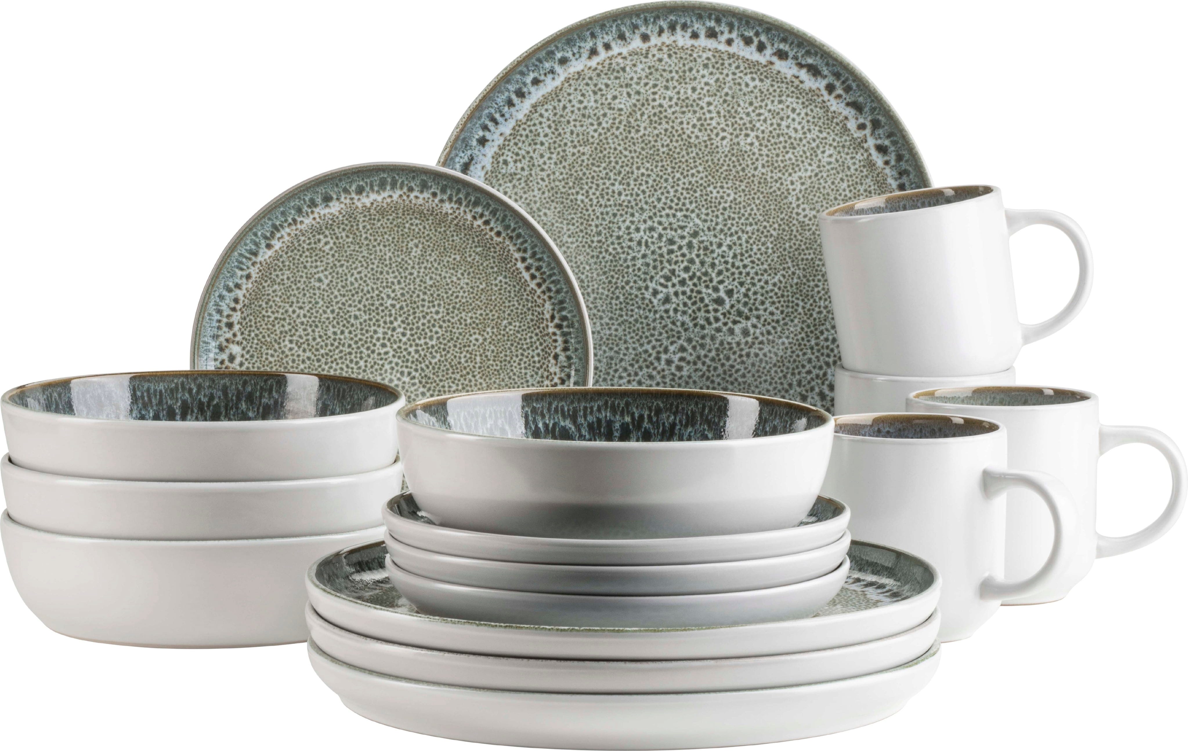 Hol dir mit diesem 16-teiligen Kombiservice von Mäser die entspannte Leichtigkeit des skandinavischen Designs direkt an deinen Esstisch. Das Set der Serie Malea besticht durch einen authentischen Vintage-Look in lebendigem Grün, das durch eine spezielle Reaktivglasur und dunkle Sprenkel auf jedem Teil ein einzigartiges Unikat schafft.