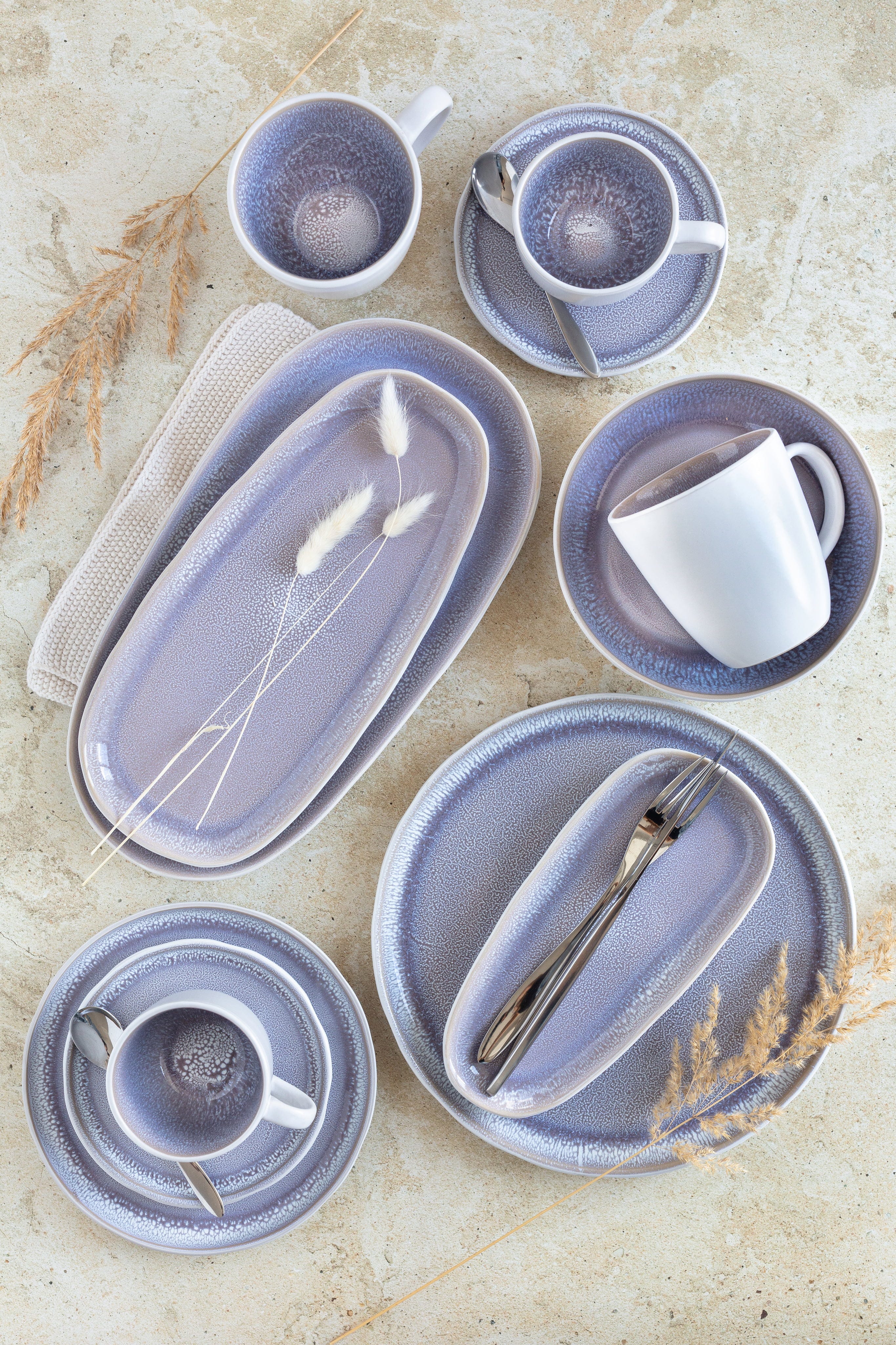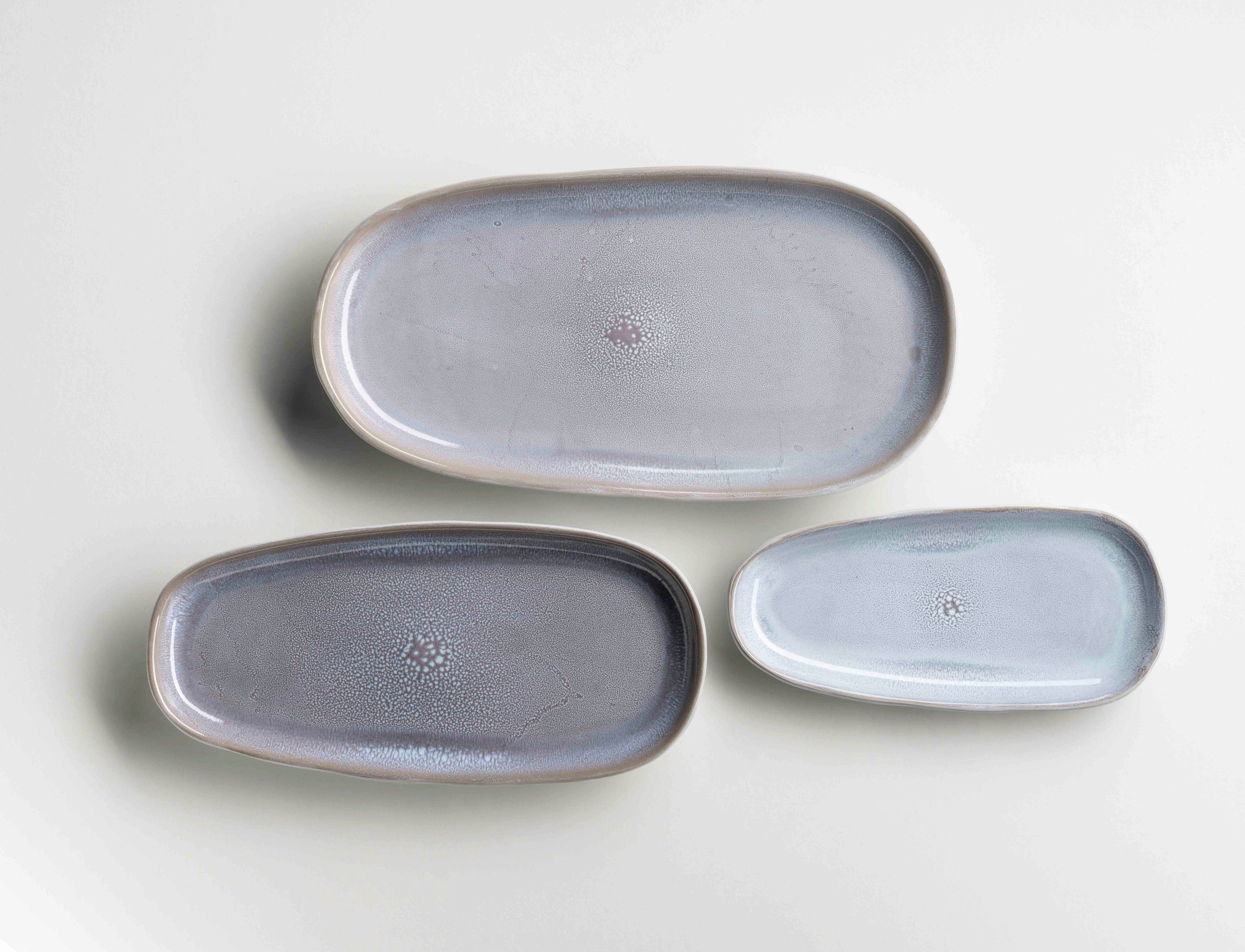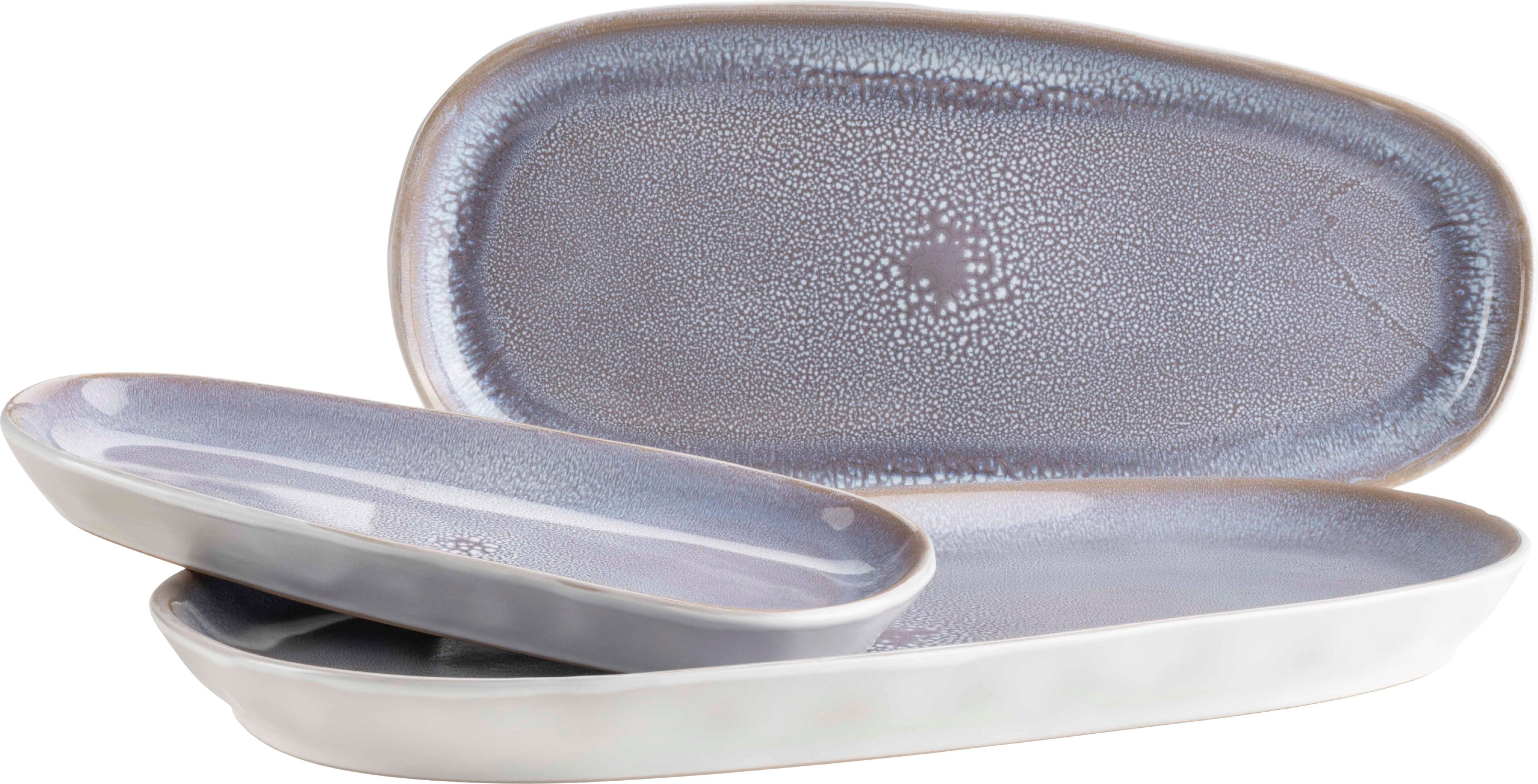 Setze deine Speisen mit diesem dreiteiligen Plattenset der Serie Elea perfekt in Szene und genieße den spannenden Kontrast zwischen der weißen Hammerschlagoptik außen und der fliederfarbenen Reaktivglasur im Inneren. Jede Servierplatte aus hochwertigem Steinzeug ist durch die aufwendige Glasurtechnik ein echtes Unikat im modernen Skandi-Look.