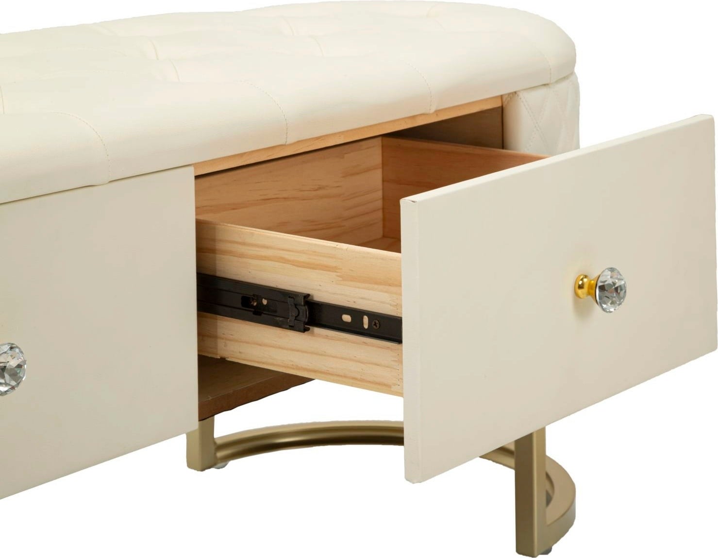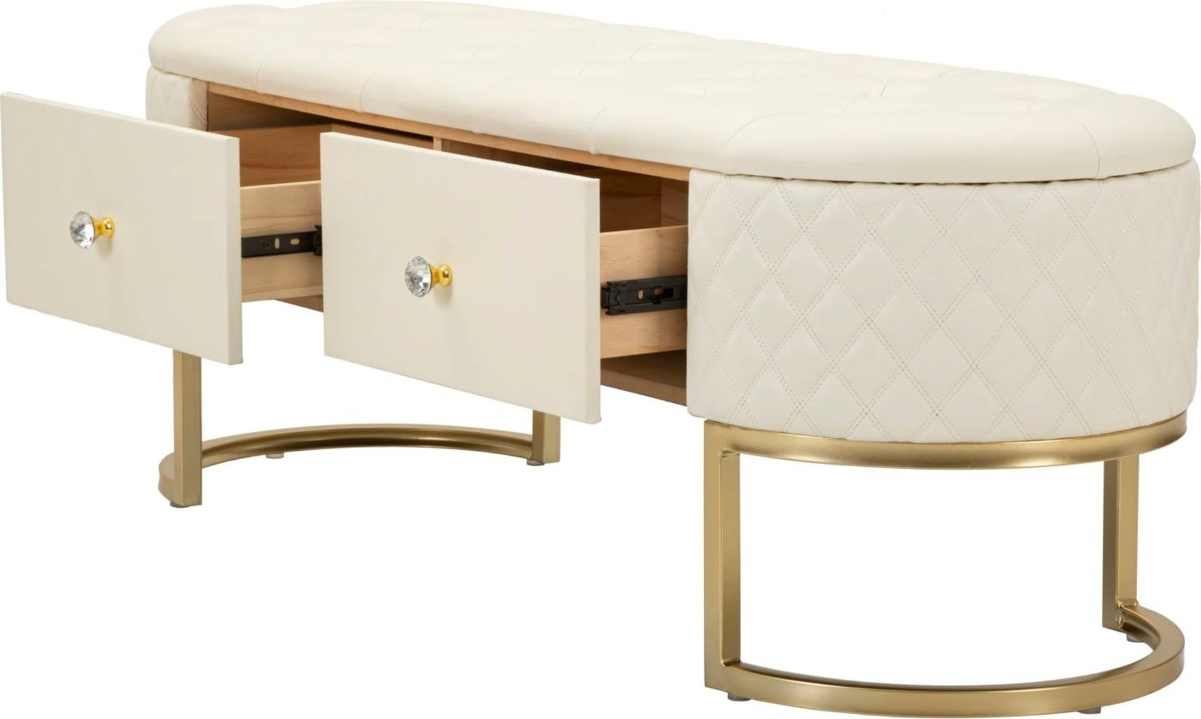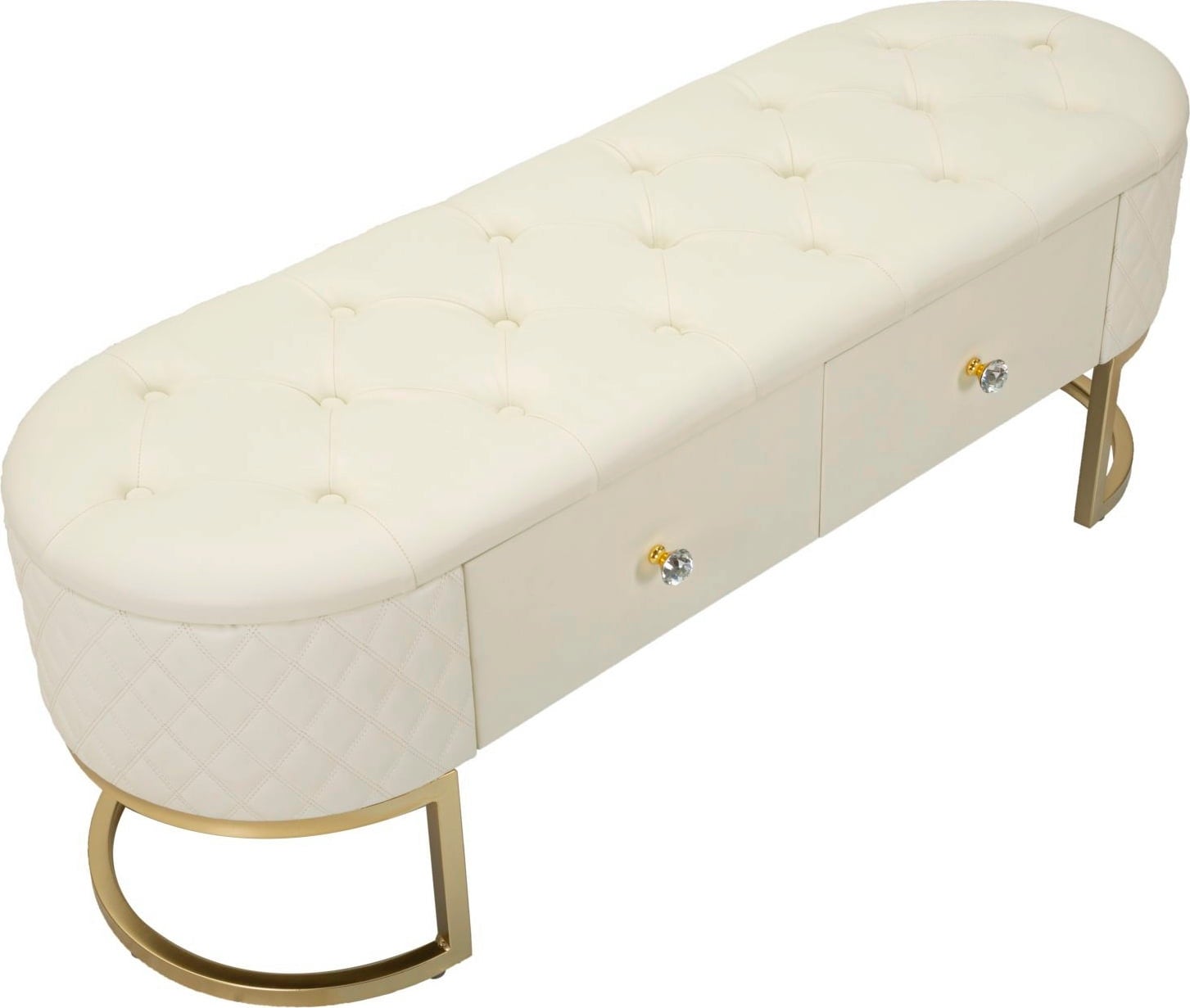 Verbinde in deinem Zuhause Komfort mit extravagantem Design dank dieser eleganten und funktionalen Bank! Sie besticht durch ihre markante, langgezogene Form, die mit luxuriösem, cremeweißem Kunstleder bezogen und durch eine feine Rautensteppung veredelt wird. Das weiche Polster bietet eine bequeme Sitzgelegenheit, während die beiden integrierten Schubladen überraschend viel Stauraum für Decken oder andere Utensilien bieten.