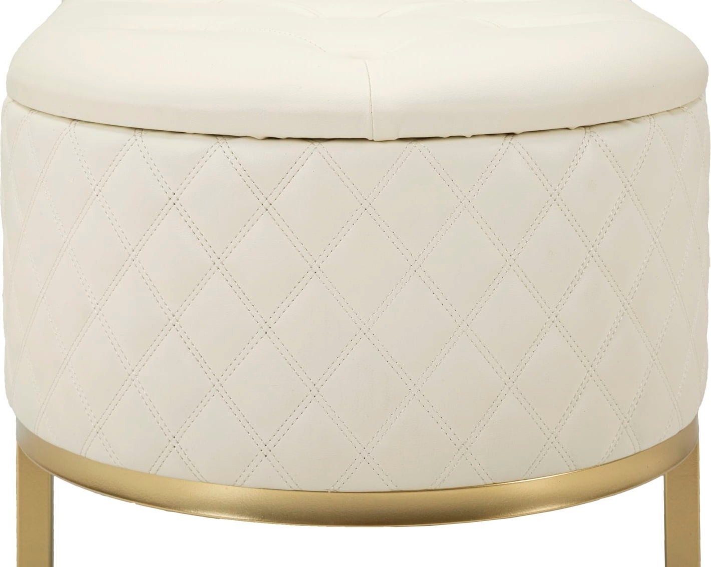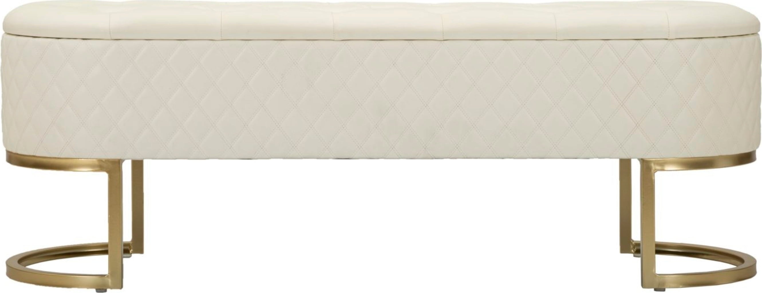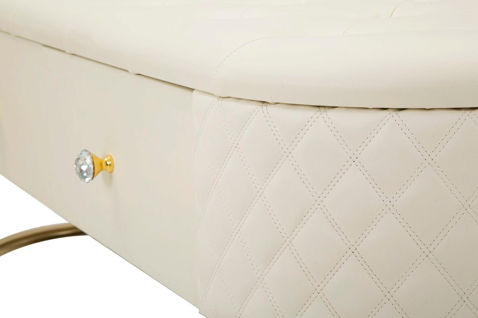Verbinde in deinem Zuhause Komfort mit extravagantem Design dank dieser eleganten und funktionalen Bank! Sie besticht durch ihre markante, langgezogene Form, die mit luxuriösem, cremeweißem Kunstleder bezogen und durch eine feine Rautensteppung veredelt wird. Das weiche Polster bietet eine bequeme Sitzgelegenheit, während die beiden integrierten Schubladen überraschend viel Stauraum für Decken oder andere Utensilien bieten.