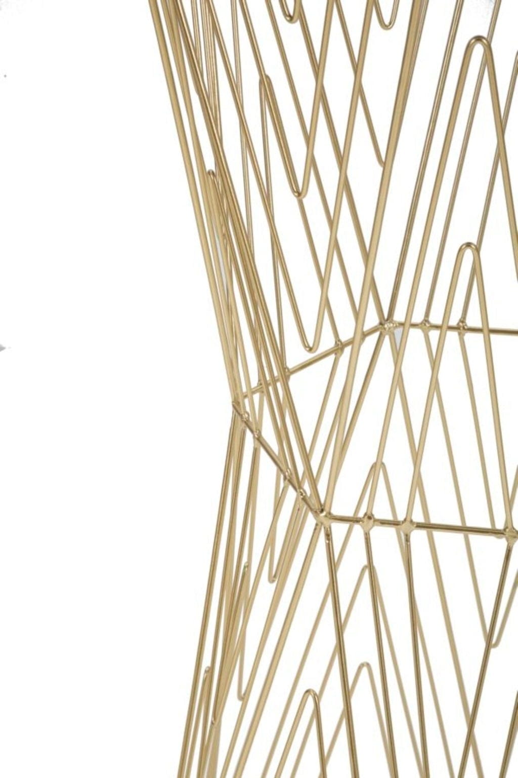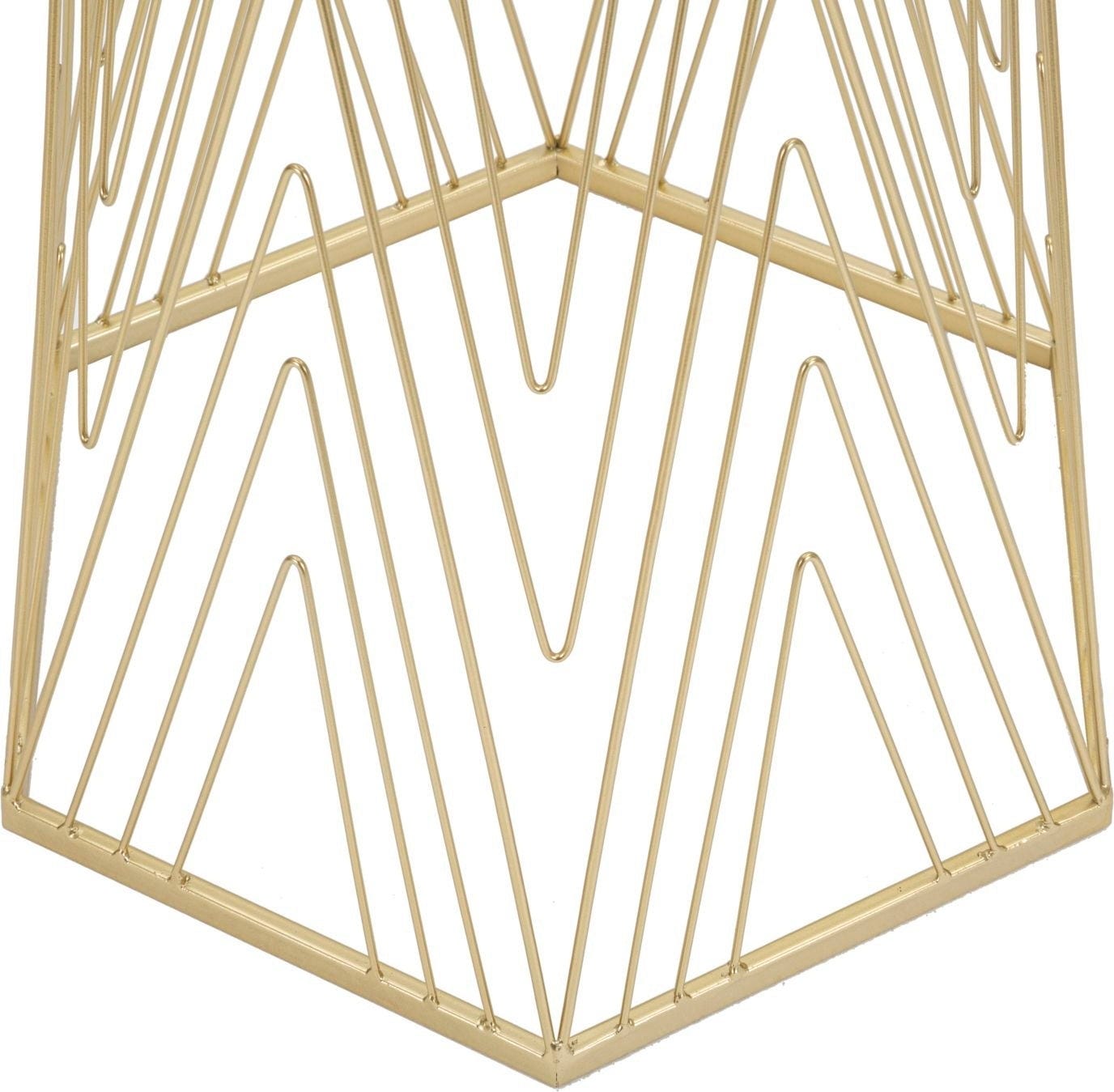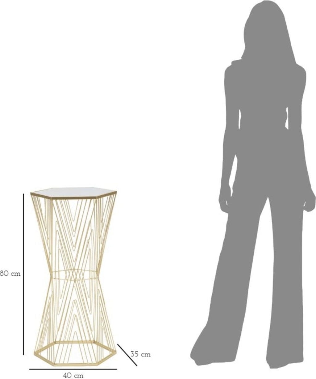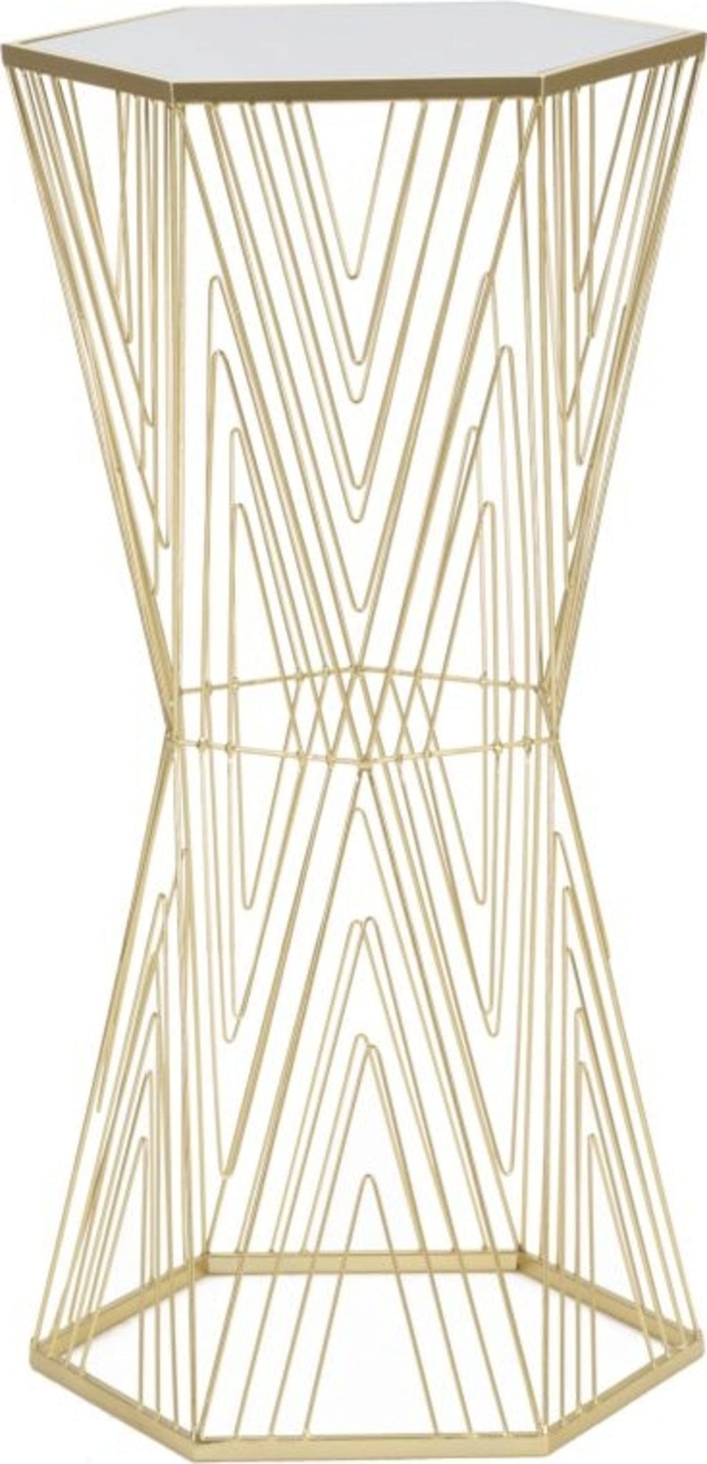 Veredle deinen Wohnraum mit dem Beistelltisch Lines von Mauro Ferretti, einem Objekt, das Funktionalität und moderne Kunst perfekt vereint. Dieser sechseckige Tisch aus goldfarbenem Metall besticht durch seine außergewöhnliche Formgebung, die an eine skulpturale Sanduhr erinnert.