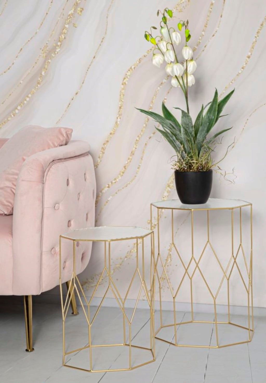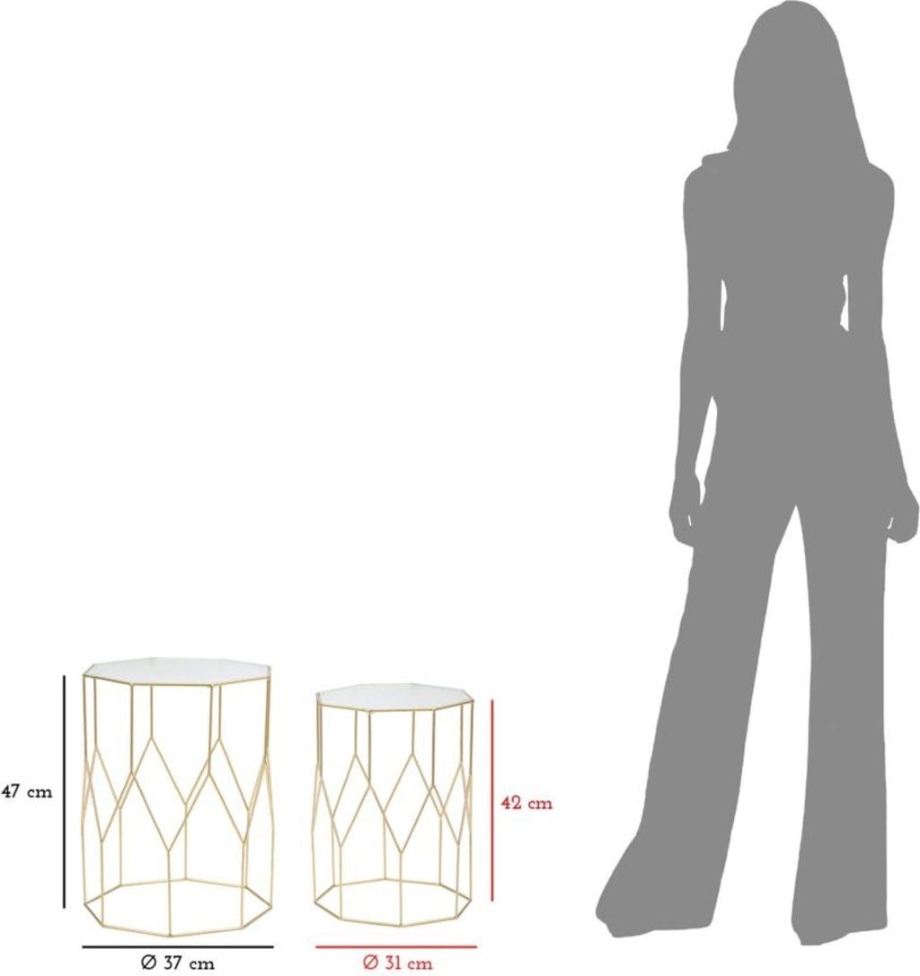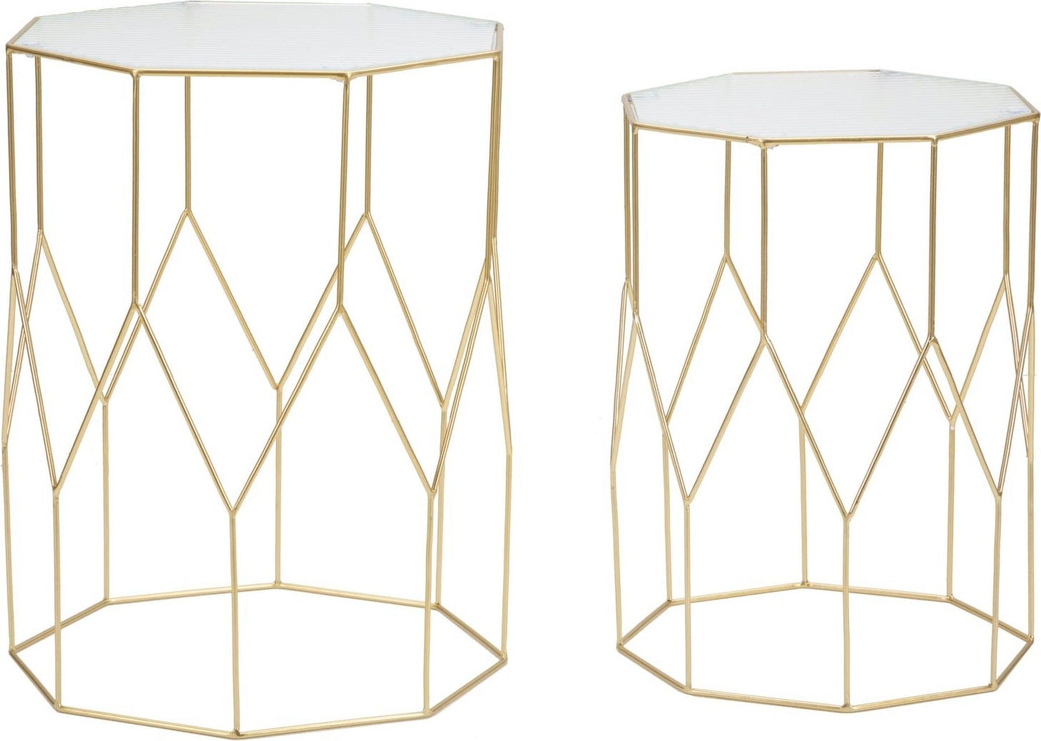 Verleihe deinem Wohnraum eine faszinierende optische Dynamik mit dem 2-teiligen Set New Glass von Mauro Ferretti. Diese zwei achteckigen Tische bestechen durch ein filigranes Gestell aus goldfarbenem Metall, dessen geometrische Linien ein raffiniertes Rautenmuster bilden.