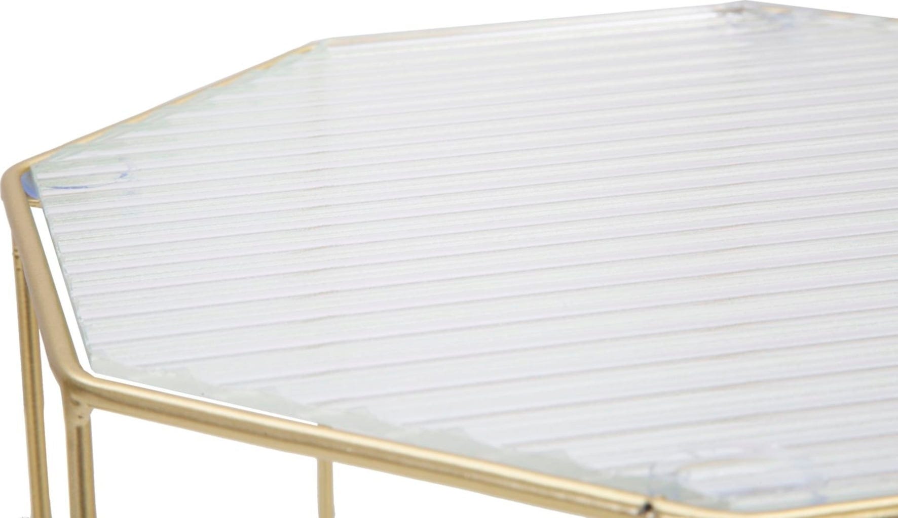 Gekrönt wird das Design durch eine fein gearbeitete, geriffelte Glasplatte, die den Blick auf die kunstvolle Metallstruktur freigibt und dem Set eine luftige Leichtigkeit verleiht. Das Set New Glass ist die perfekte Wahl für alle, die modernes Design mit einem Hauch von luxuriösem Glamour verbinden möchten.