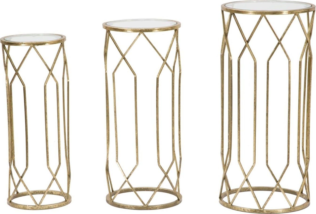 Erlebe die starke Wirkung der Kombination aus Gold und Glas mit diesen luxuriösen und glamourösen Beistelltischen im praktischen 3er-Set! Das Set ist perfekt, um deine Lieblingsstücke stilvoll in Szene zu setzen. Das schlanke Gestell aus goldfarbenem Metall besticht durch eine langgezogene, geometrische Linienführung, die Leichtigkeit und Höhe schafft.