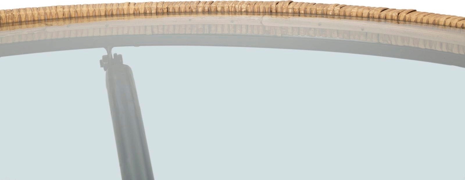 Verleihe deinem Wohnzimmer mit diesem runden Couchtisch ein schlichtes, aber ansprechendes Design-Upgrade! Er vereint die klare Transparenz einer runden Glasplatte mit der warmen, natürlichen Textur eines Rattan-Geflechts, das die Platte stilvoll umrandet. Das robuste, schwarze Metallgestell mit seinen X-förmigen Beinen sorgt für hohe Stabilität und einen modernen Kontrast.