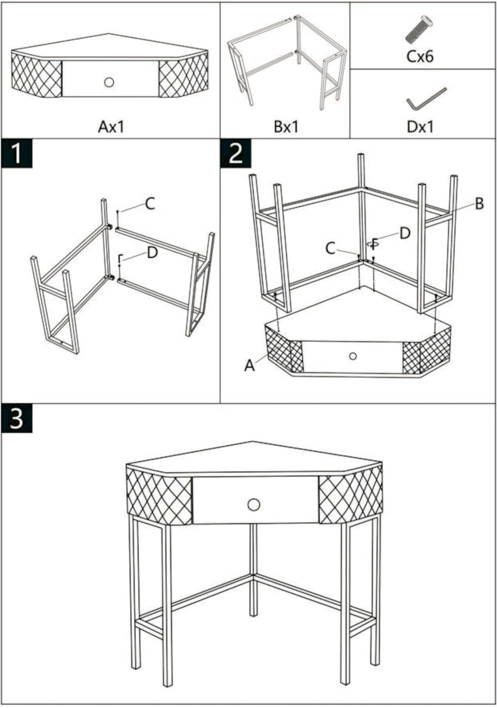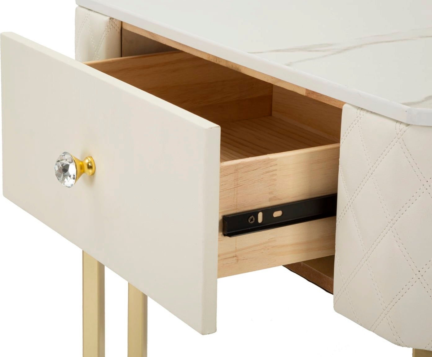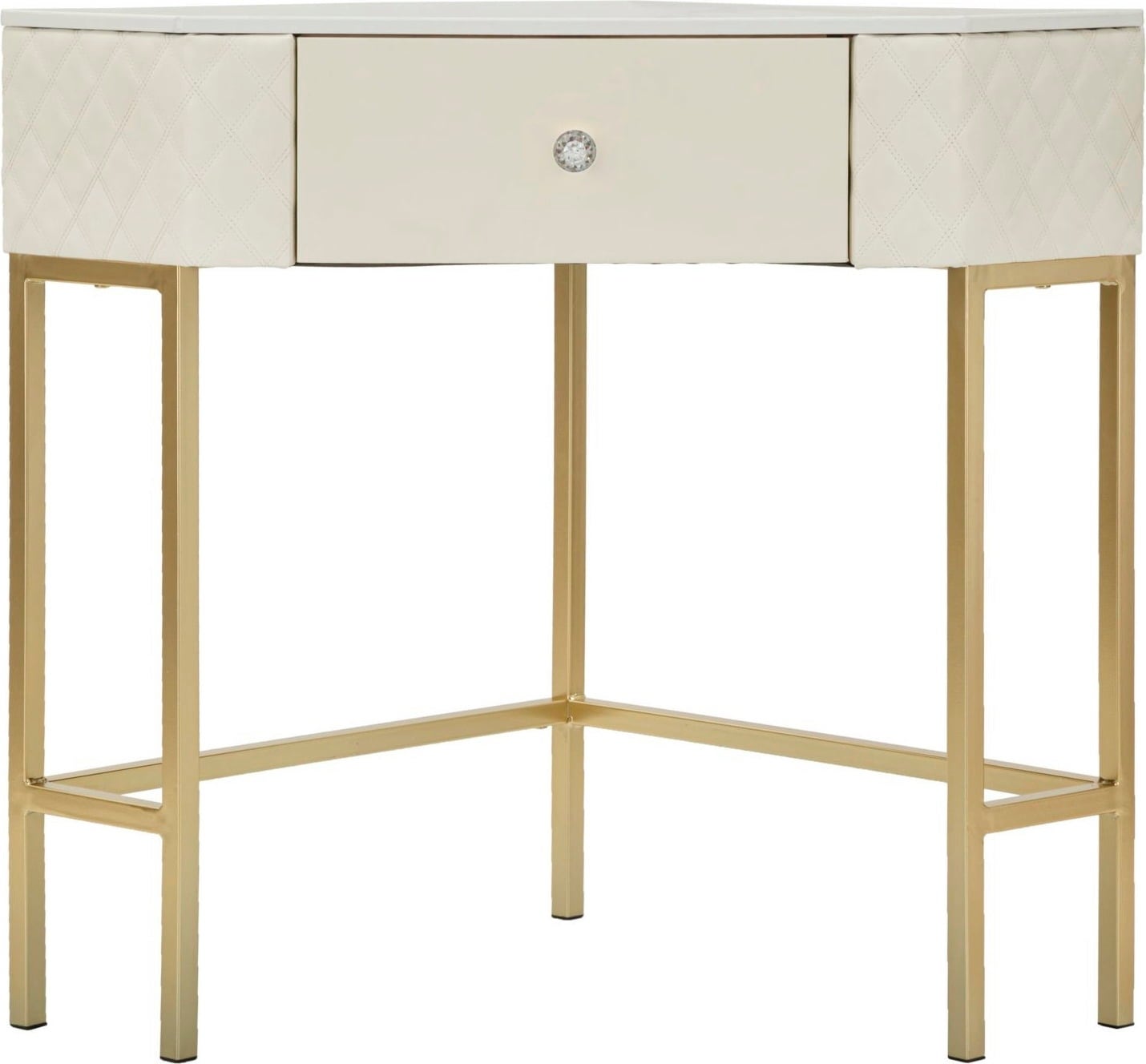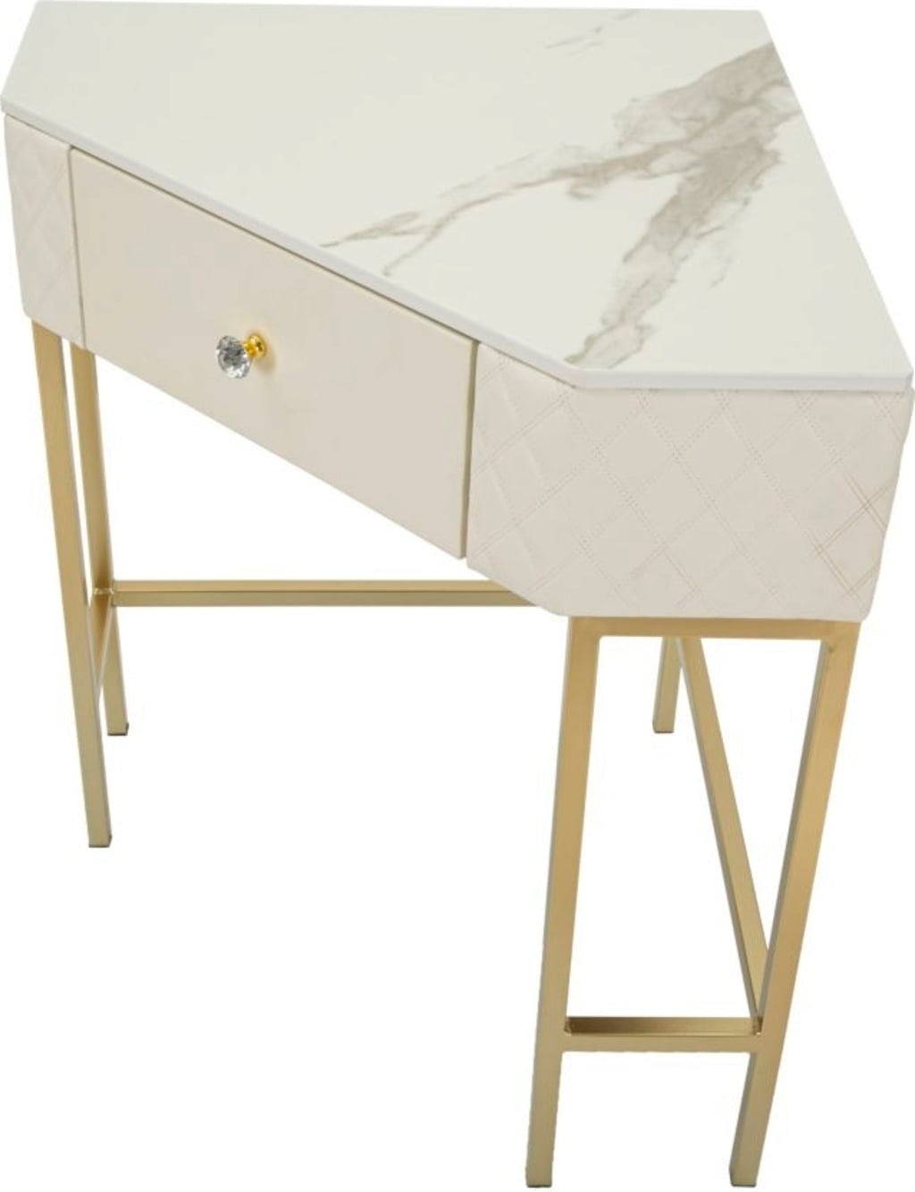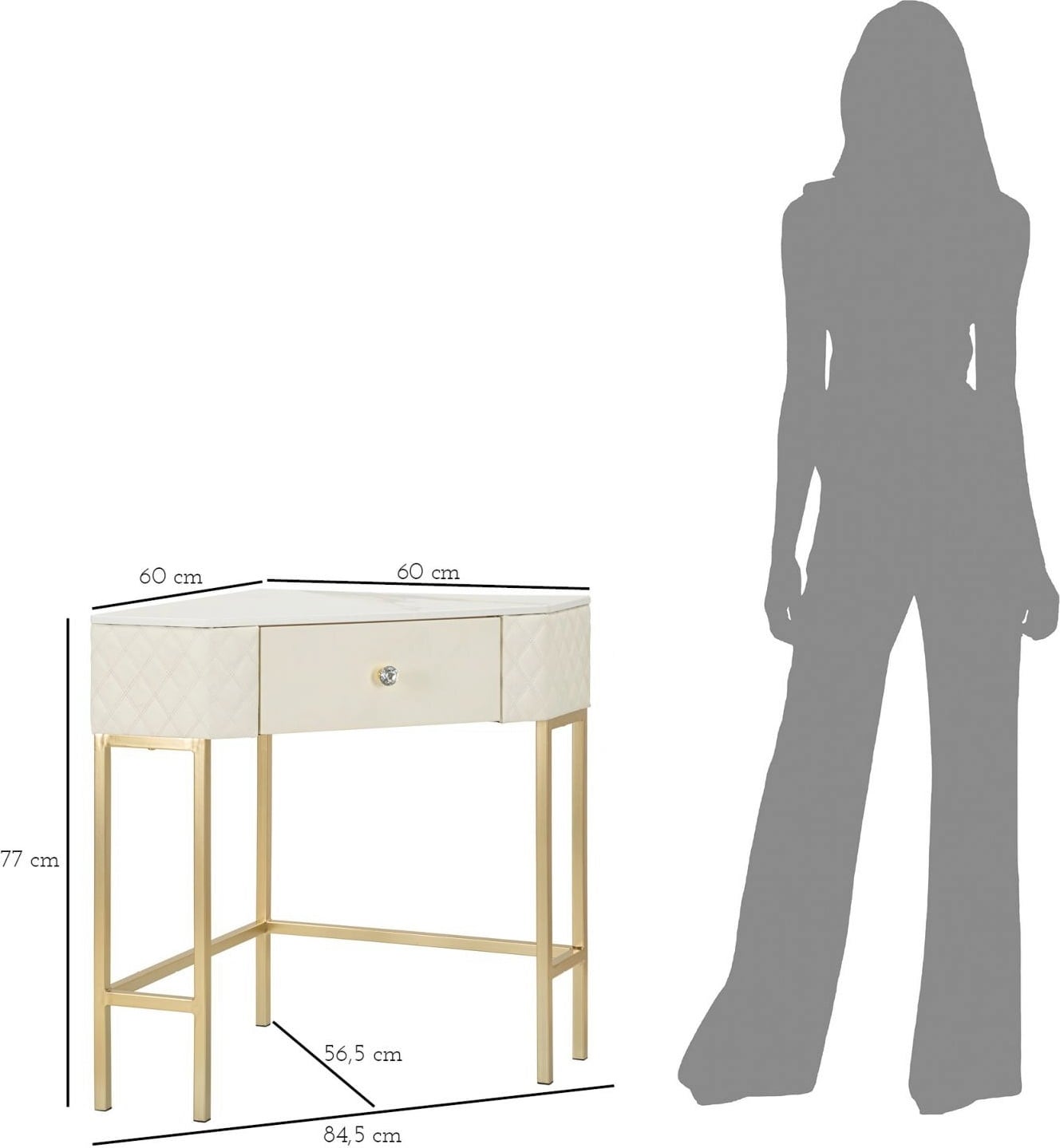 Nutze auch die Ecken deines Raumes stilvoll mit dieser luxuriösen Eckkonsole. Das dreieckige Design ist die perfekte, platzsparende Lösung und vereint höchste Eleganz mit Funktionalität. Die Tischplatte in edler Marmoroptik und die Seiten, bezogen mit luxuriösem, gestepptem Kunstleder, schaffen sofort eine opulente Atmosphäre.
