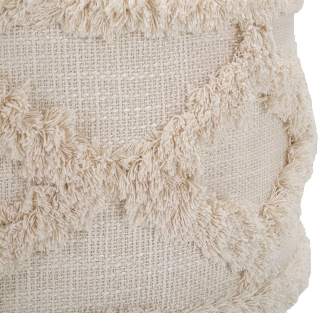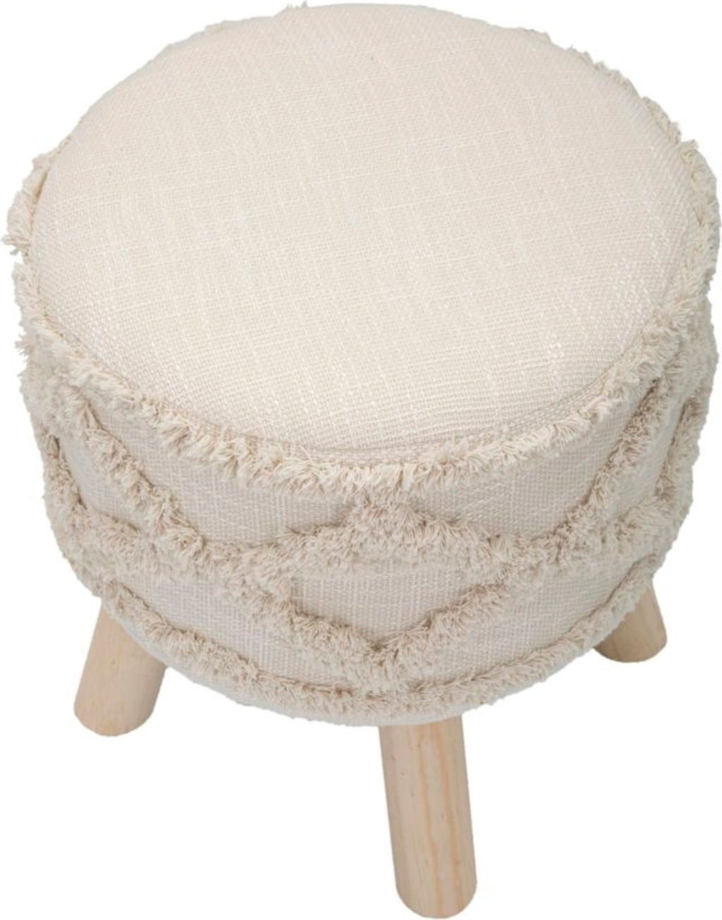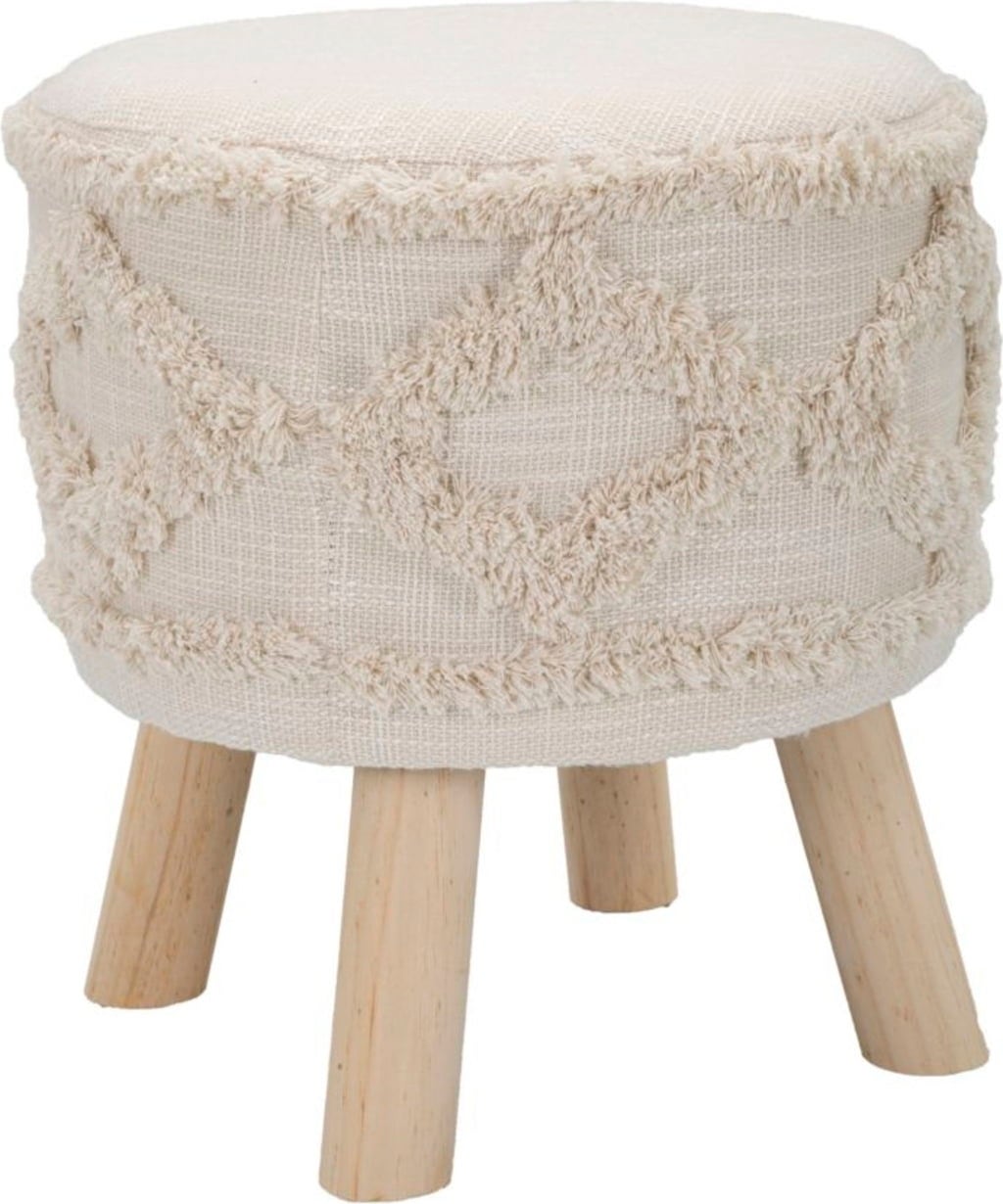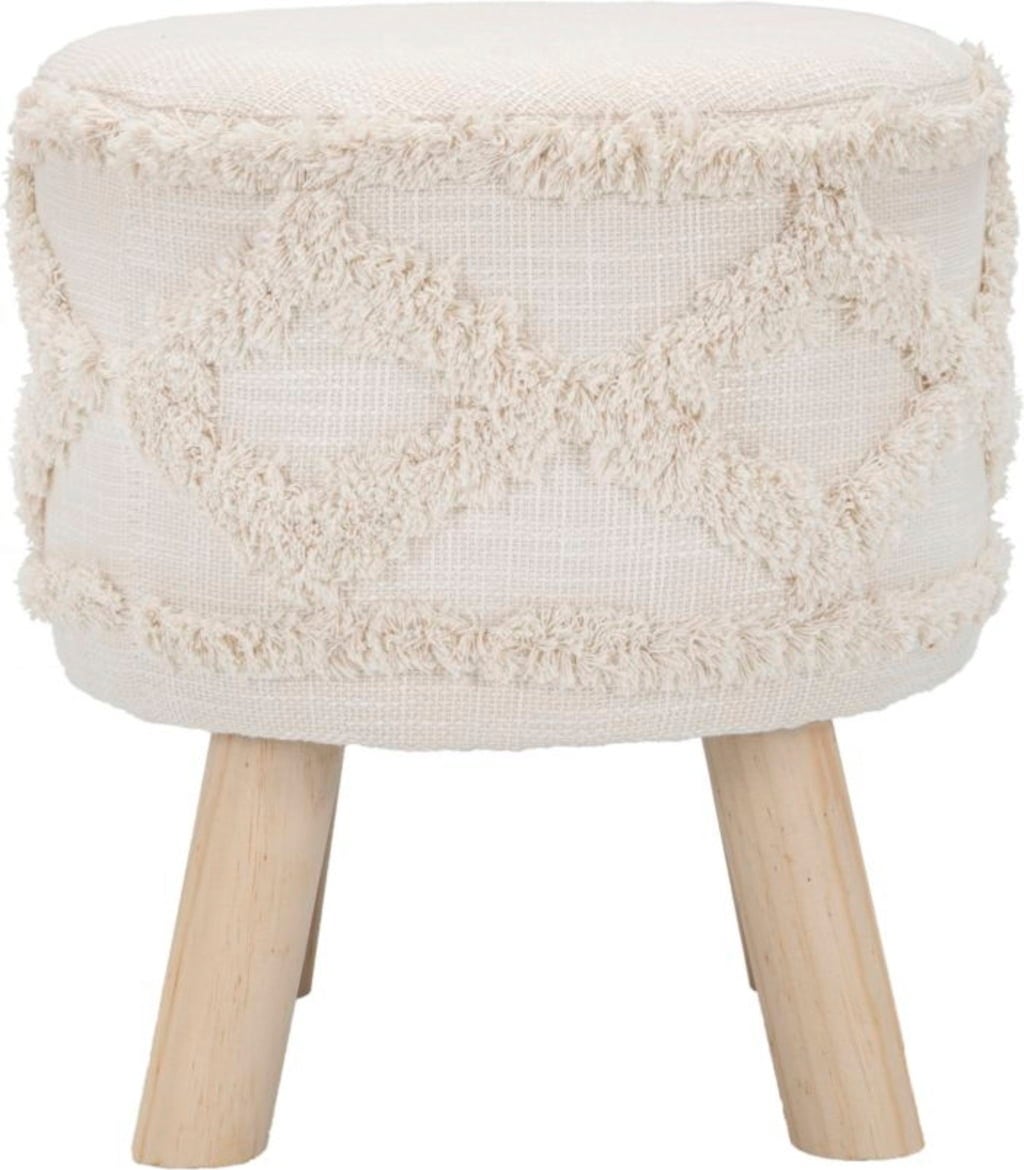 Verleihe deinem Raum mit diesem runden Hocker eine gemütliche und gleichzeitig stilvolle Note! Er kombiniert einladenden Komfort mit einem modernen, naturnahen Design. Der Hocker verfügt über einen eleganten, weich gepolsterten Stoffbezug in hellem Ecru, der zusätzlich mit einem strukturierten, getufteten Muster verziert ist – ein detailreicher Akzent, der sofort ins Auge fällt.