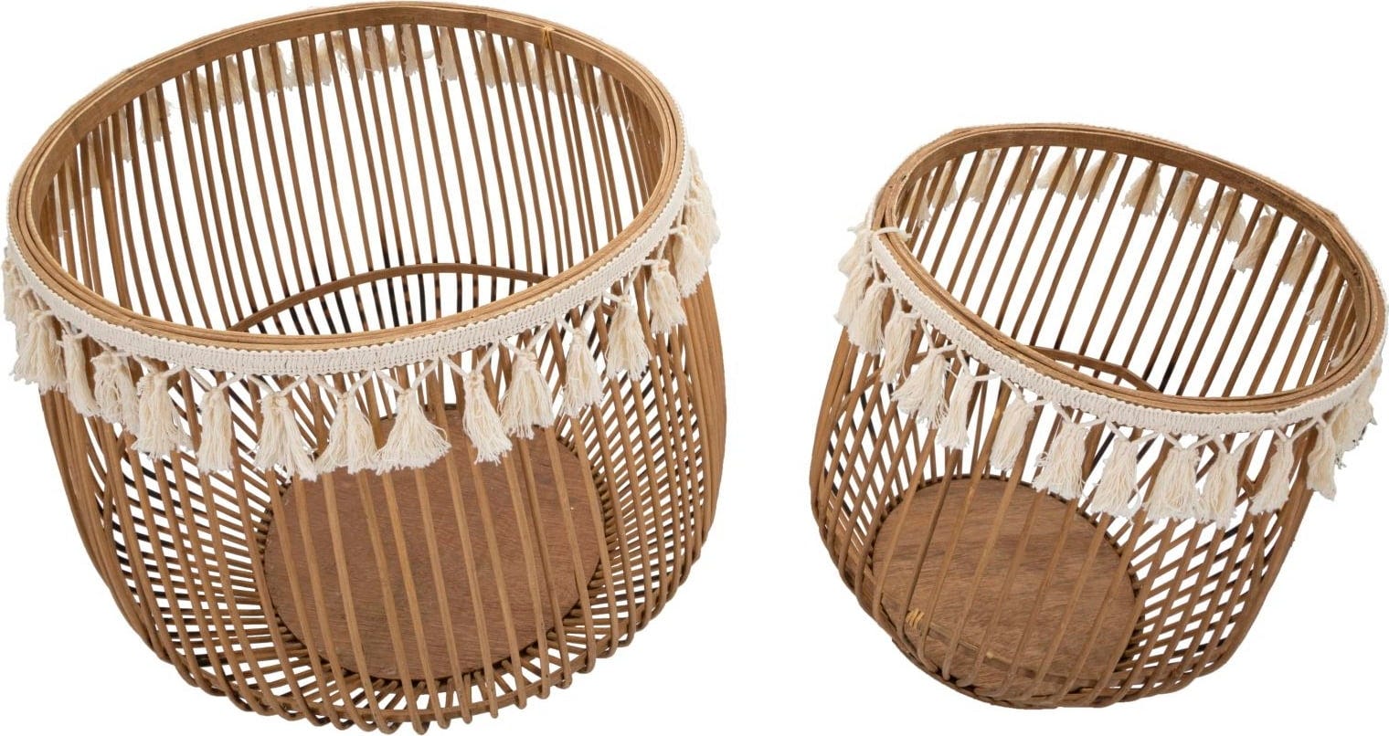Der besondere Blickfang ist der dekorative Stoffbesatz am oberen Rand, der mit cremefarbenen Fransen und einem Zierband versehen ist – ein ideales Detail für den angesagten Boho-Chic-Look. Ob einzeln oder als Duo platziert, dieses Korb-Set vereint Funktionalität und Dekoration auf elegante und natürliche Weise.