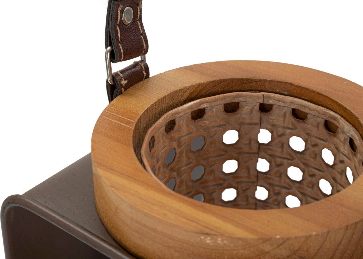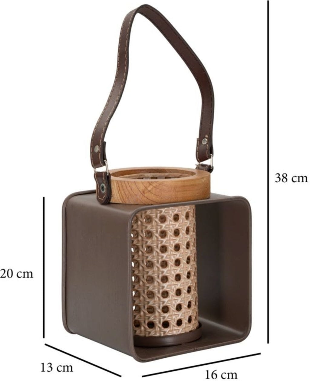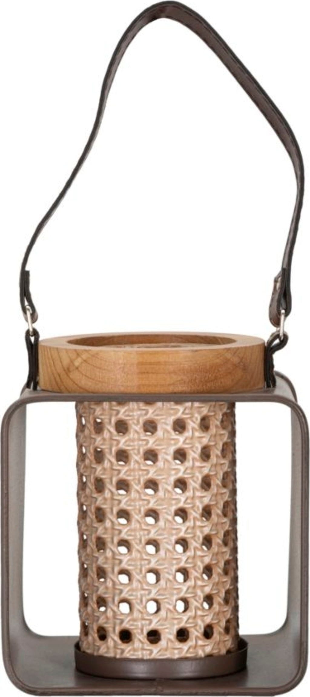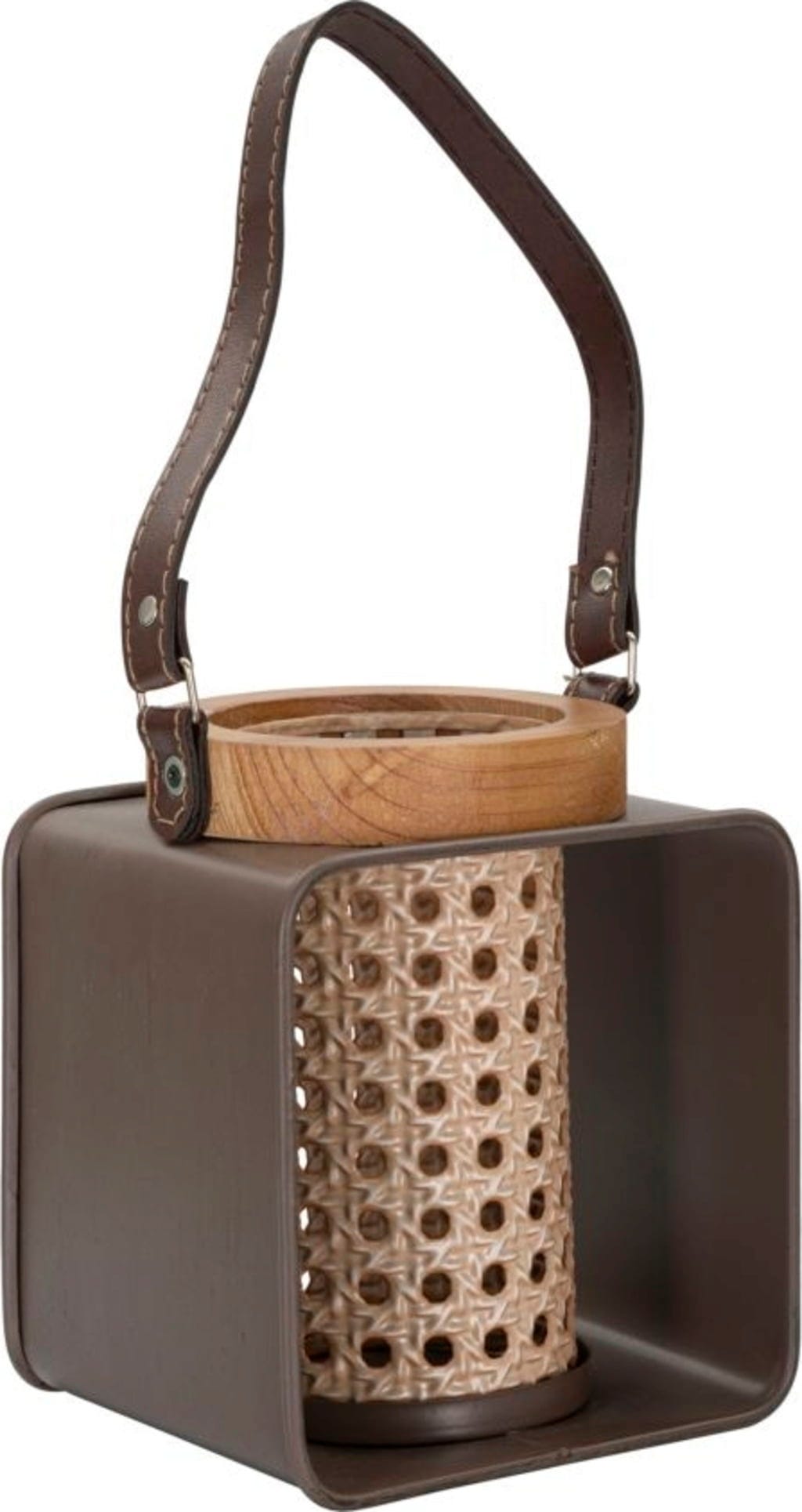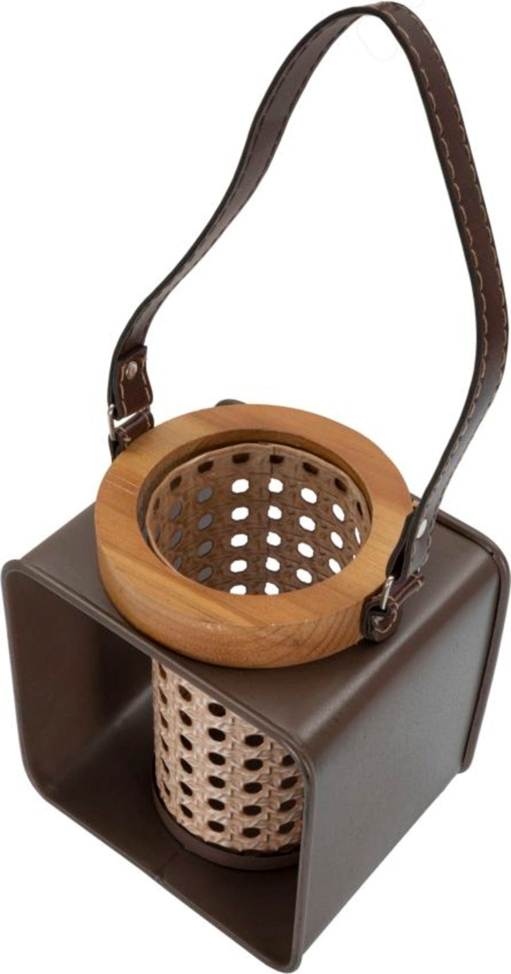 Die Laterne zeichnet sich durch ein dunkelbraunes, quadratisches Metallgehäuse mit abgerundeten Ecken aus, in dessen Zentrum ein zylindrischer Einsatz aus Eisen, der an Wiener Stroh erinnert. Ein heller Holzring an der Oberseite bildet einen warmen Kontrast zum Metall und rahmt die Lichtquelle elegant ein. Besonders praktisch und dekorativ zugleich ist der lange, braune Tragegriff in Leder-Optik, der mit robusten Nieten befestigt ist und das historische Flair unterstreicht. Ob auf der Terrasse, im Eingangsbereich oder als gemütliches Lichtobjekt im Wohnzimmer – diese Laterne vereint Tradition mit modernem Chic.