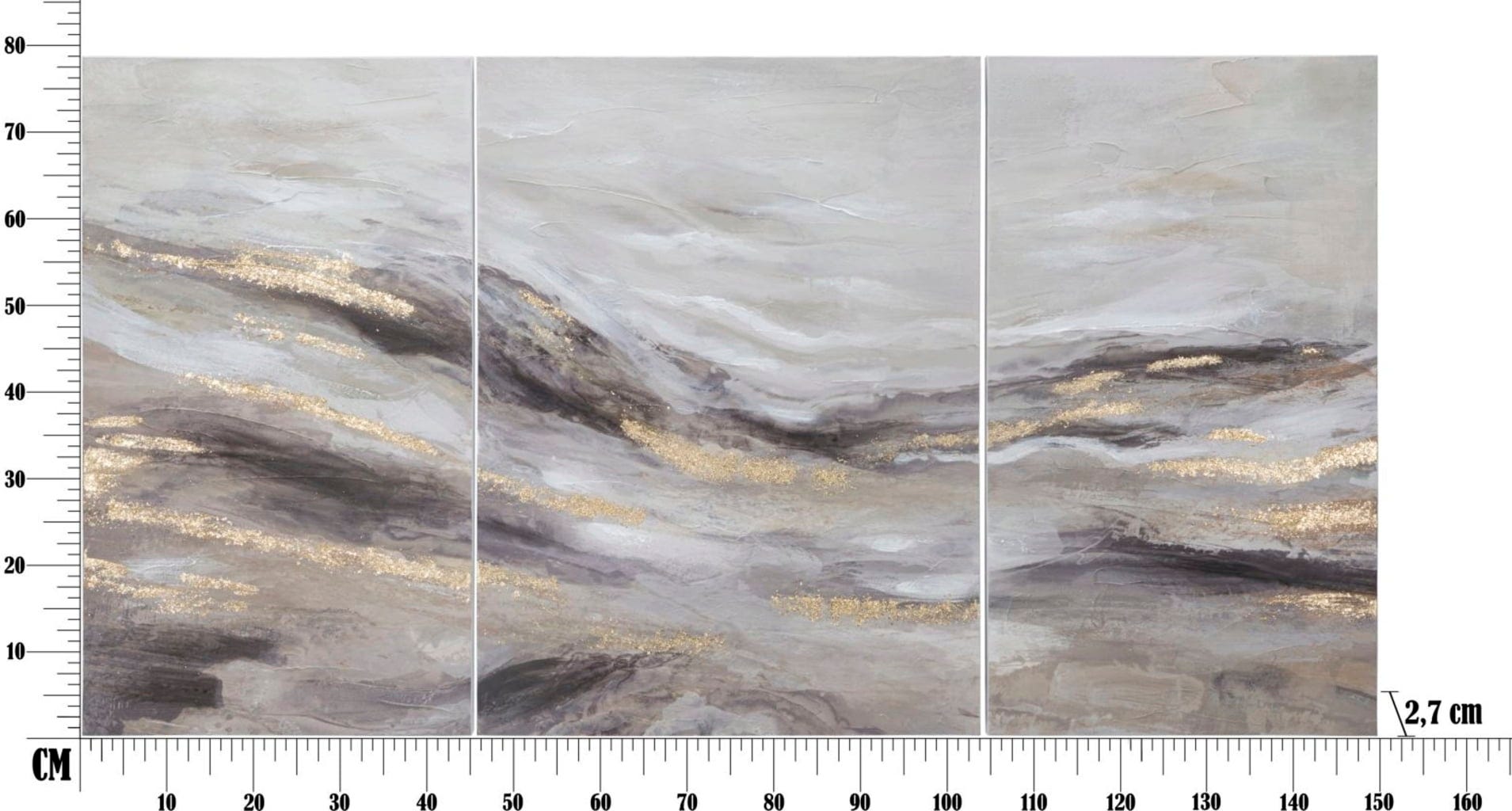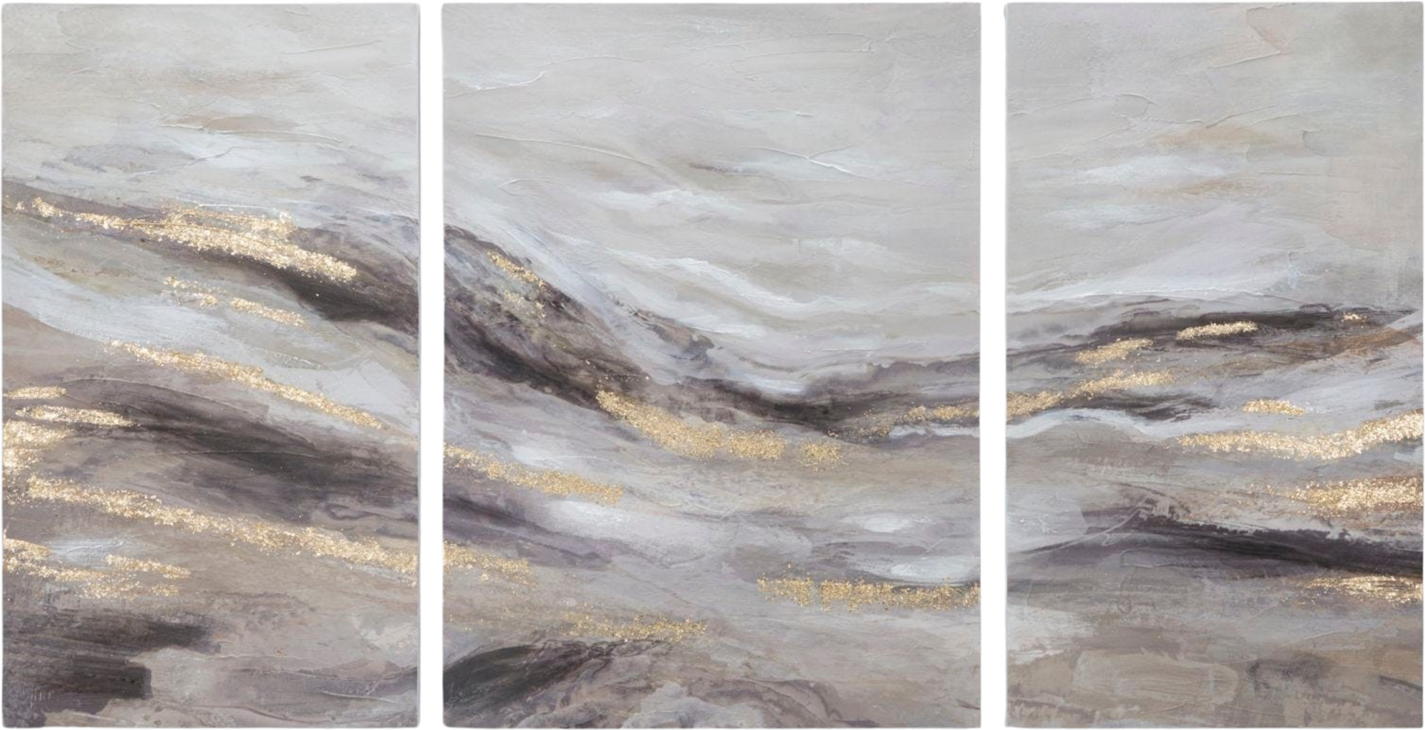 Die drei harmonisch aufeinander abgestimmten Werke zeigen eine abstrakte, neblige Hügel- oder Wolkenlandschaft in sanften Grau- und Brauntönen. Das visuelle Highlight sind die diagonal verlaufenden, glitzernden Goldakzente, die sich wie Sonnenstrahlen durch die Komposition ziehen und bei Lichteinfall für luxuriöse Effekte sorgen. Aufgespannt auf hochwertigen Holzrahmen, bietet dieses Set endlose Gestaltungsmöglichkeiten – ob als geschlossene Einheit über dem Sofa oder verteilt im Raum.