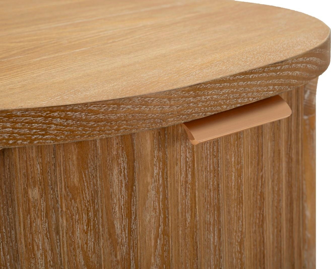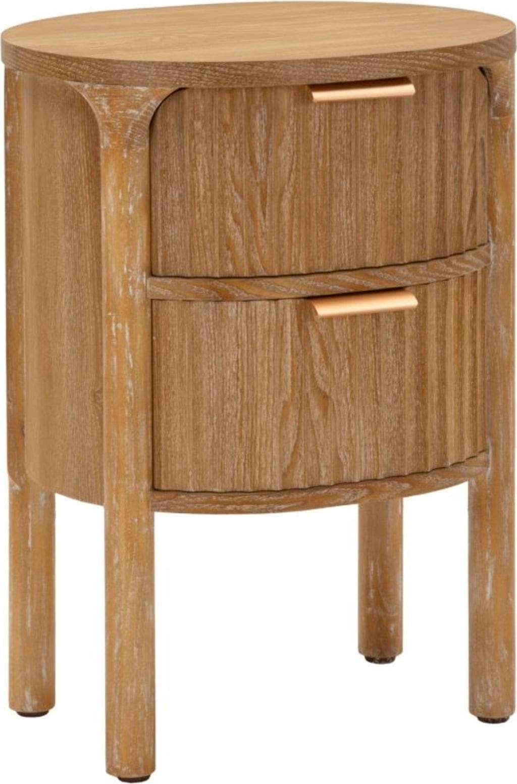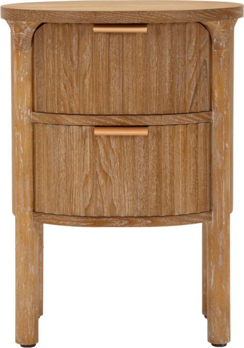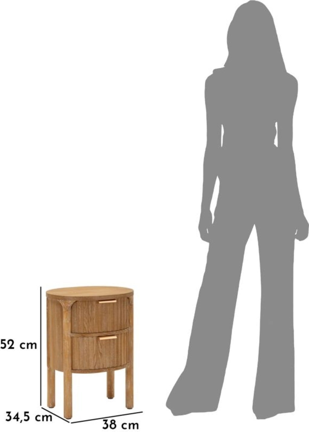 Ergänze dein Schlafzimmer um ein Möbelstück, das schlichte Eleganz und moderne Funktionalität perfekt vereint. Der Nachttisch Göteborg besticht durch seine kompakte, ovale Konstruktion und die sanften, abgerundeten Linien in warmer Naturholz-Optik. Die Fronten sind dezent strukturiert, was dem Tisch eine raffinierte Haptik verleiht.