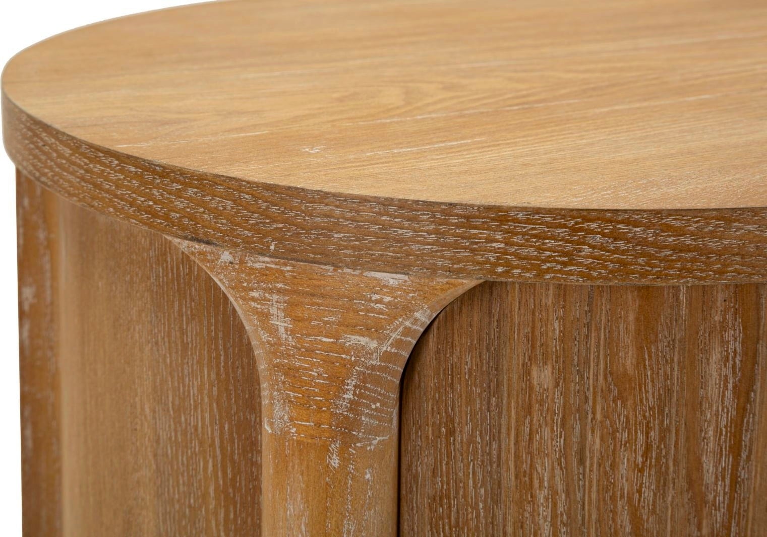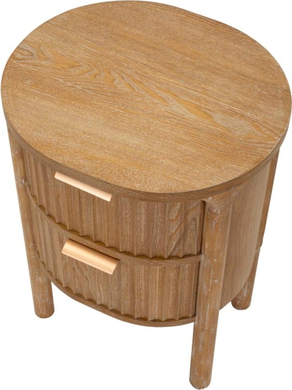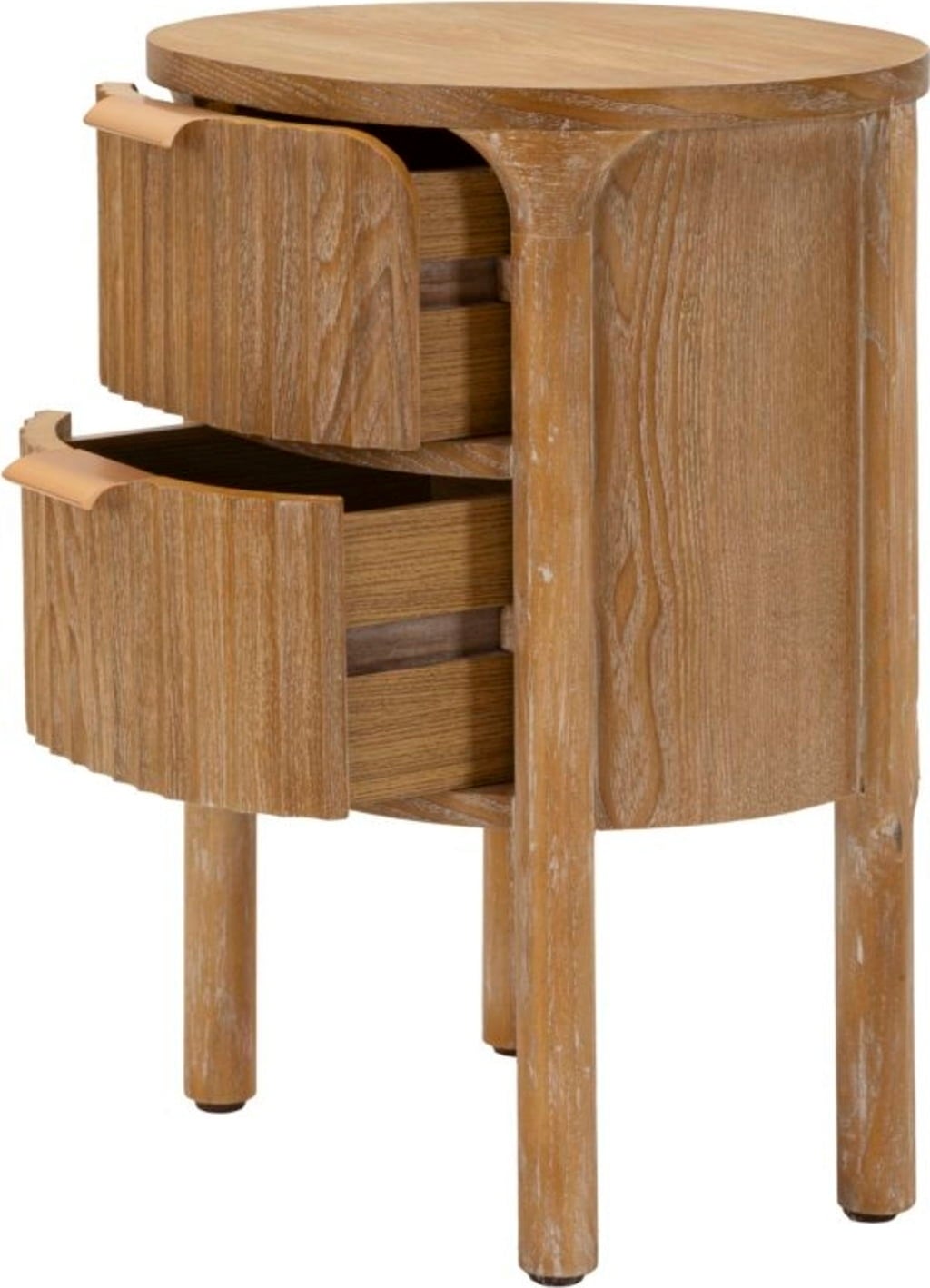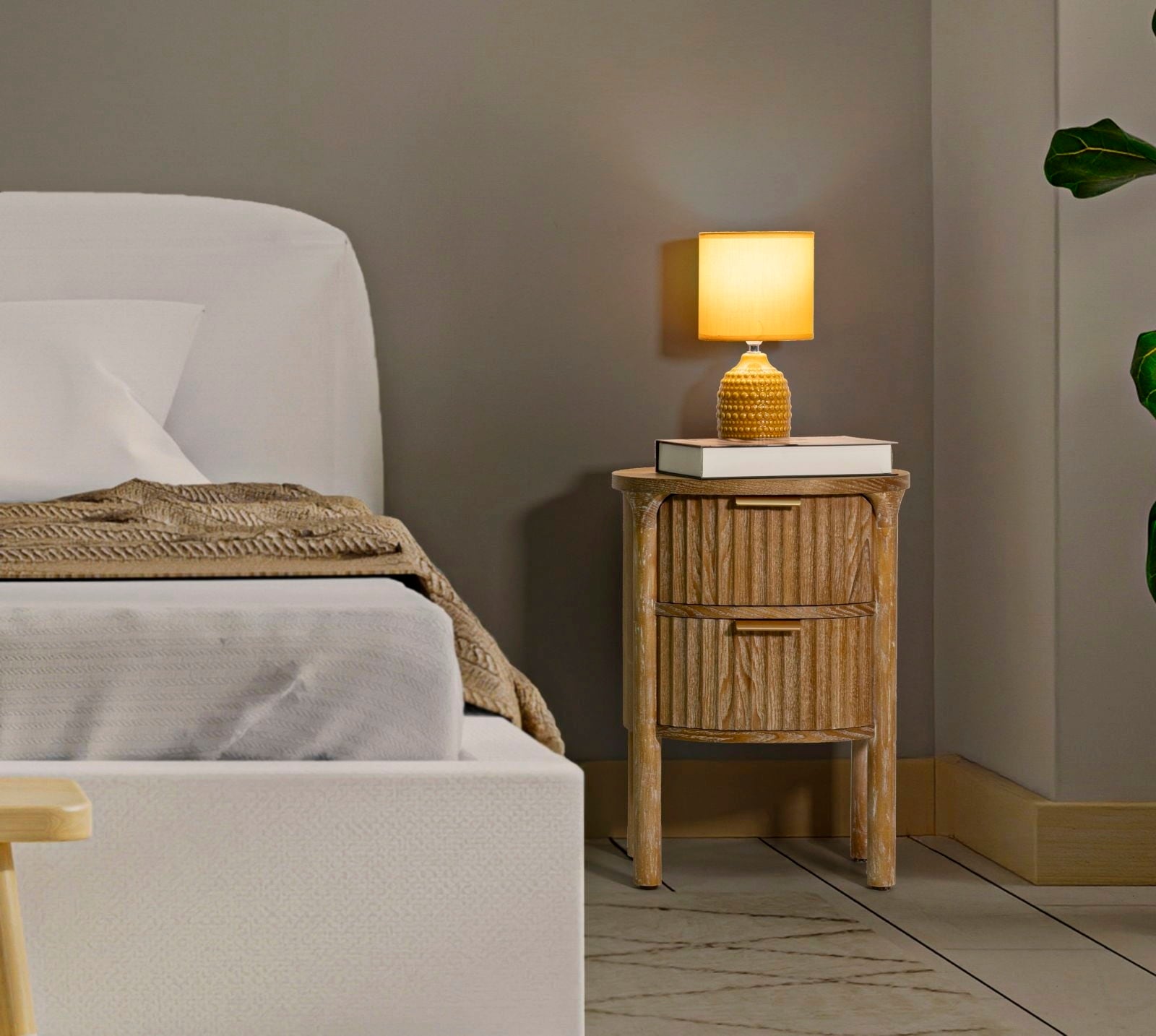 Ergänze dein Schlafzimmer um ein Möbelstück, das schlichte Eleganz und moderne Funktionalität perfekt vereint. Der Nachttisch Göteborg besticht durch seine kompakte, ovale Konstruktion und die sanften, abgerundeten Linien in warmer Naturholz-Optik. Die Fronten sind dezent strukturiert, was dem Tisch eine raffinierte Haptik verleiht.