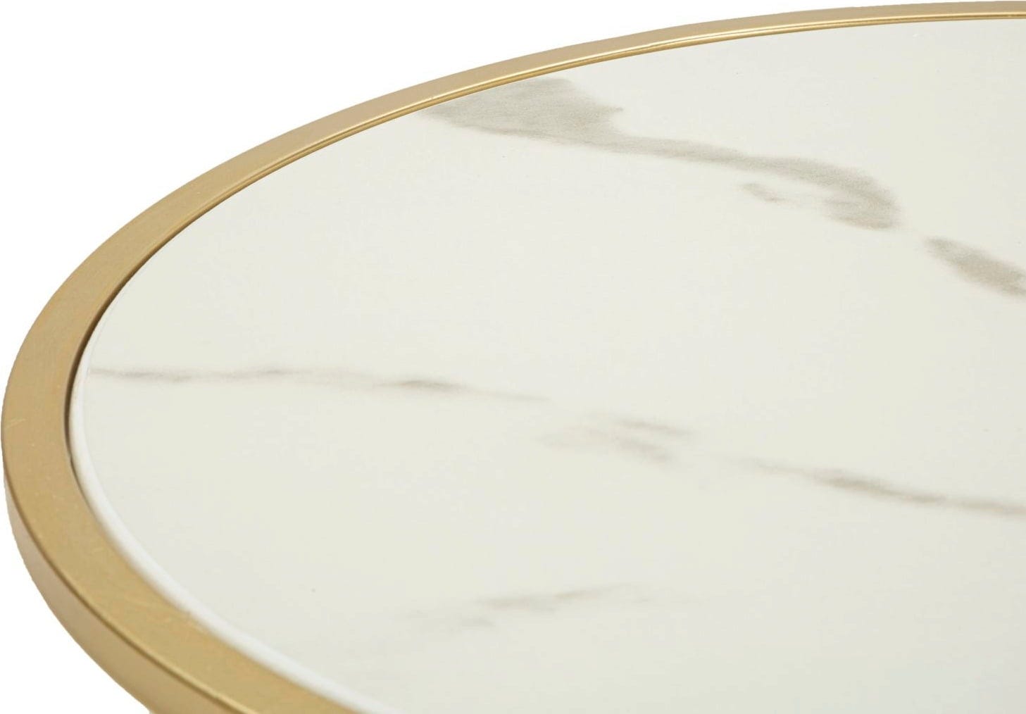 Setze einen luxuriösen und eleganten Akzent in deinem Schlafzimmer mit diesem runden Nachttisch! Er besticht durch die Kombination aus einem filigranen, goldfarbenen Metallgestell und einer oberen Platte sowie einer Ablage in edler Marmoroptik. Die untere Schubladeneinheit bietet diskreten Stauraum und ist an den Seiten mit luxuriösem, gestepptem Kunstleder bezogen, was dem Tisch eine spürbare, raffinierte Textur verleiht.
