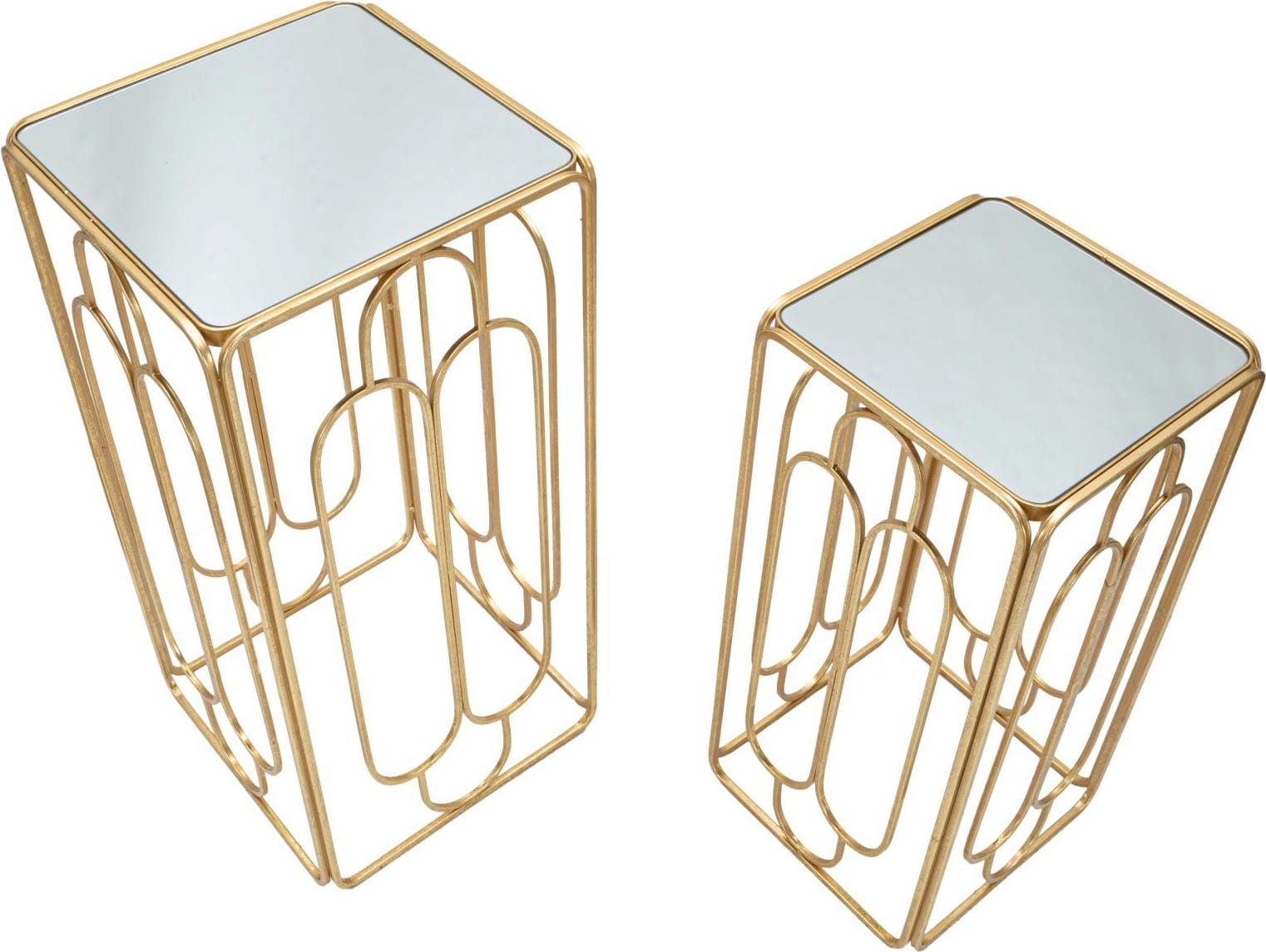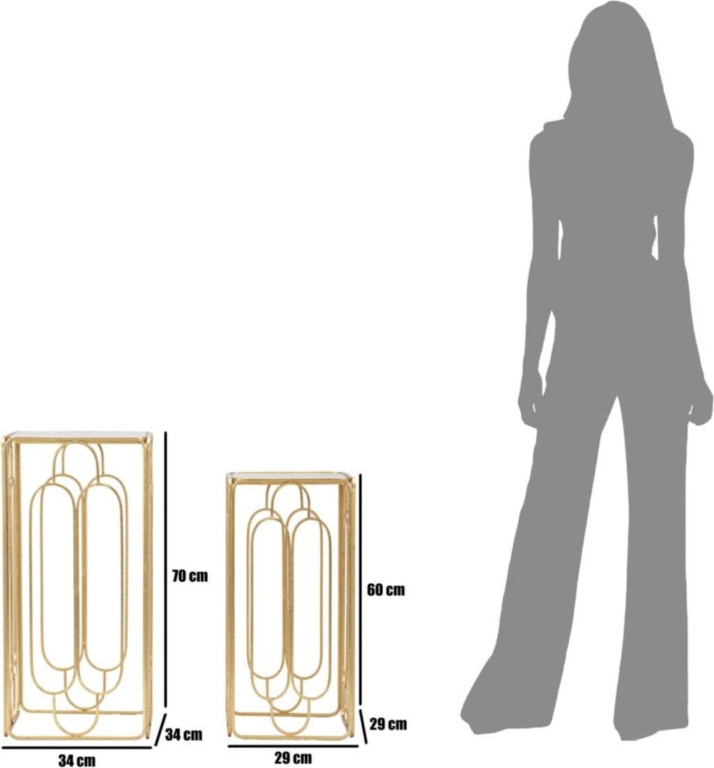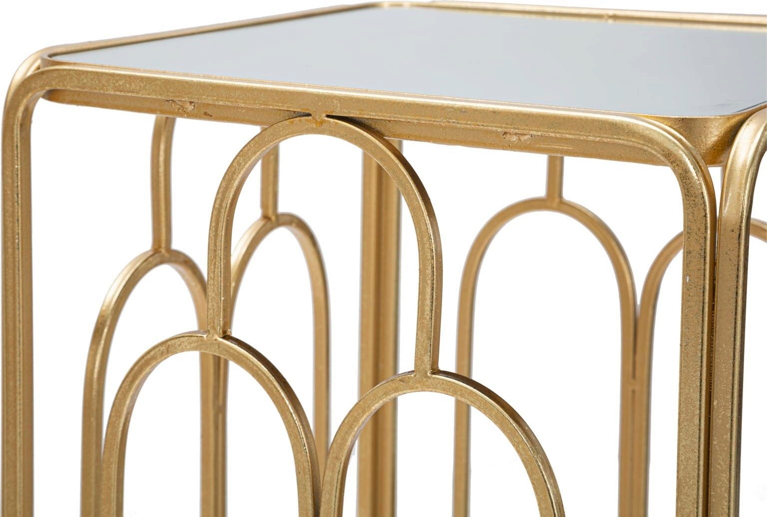 Das Gestell aus hochwertigem, vergoldetem Metall besticht durch seine geometrischen, abgerundeten Linien, die an stilisierte Bögen erinnern und dem Set eine skulpturale Leichtigkeit verleihen. Gekrönt werden die Tische von einer edlen, verspiegelten Glasplatte, die das Licht reflektiert und deine Pflanzen oder Dekorationen perfekt in Szene setzt. Die Kombination aus weichen Formen und glänzenden Oberflächen verleiht jedem Raum eine besondere, exklusive Note.