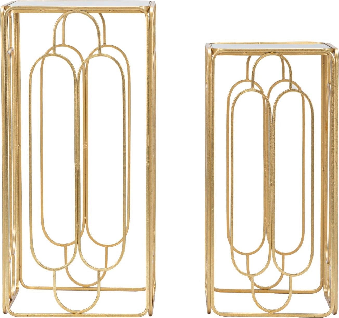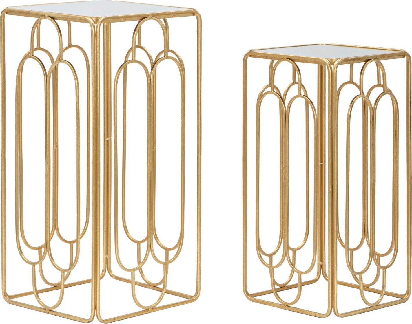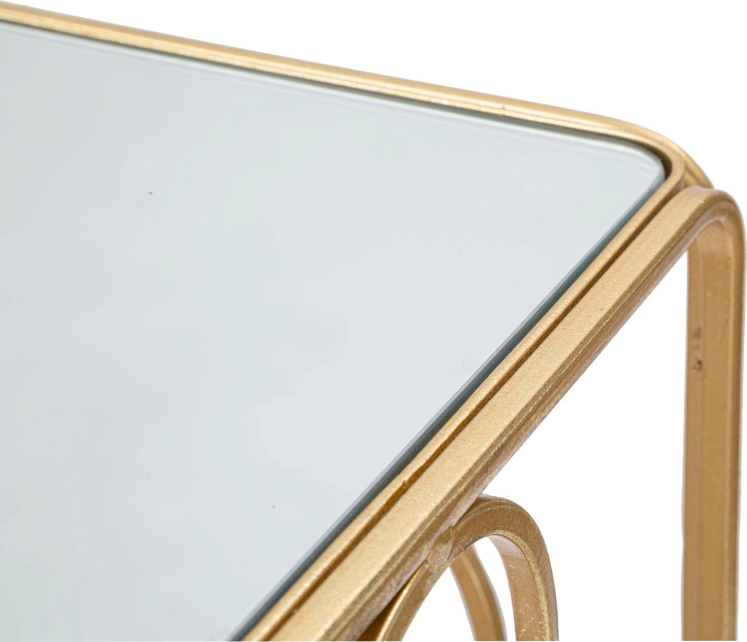 Das Gestell aus hochwertigem, vergoldetem Metall besticht durch seine geometrischen, abgerundeten Linien, die an stilisierte Bögen erinnern und dem Set eine skulpturale Leichtigkeit verleihen. Gekrönt werden die Tische von einer edlen, verspiegelten Glasplatte, die das Licht reflektiert und deine Pflanzen oder Dekorationen perfekt in Szene setzt. Die Kombination aus weichen Formen und glänzenden Oberflächen verleiht jedem Raum eine besondere, exklusive Note.