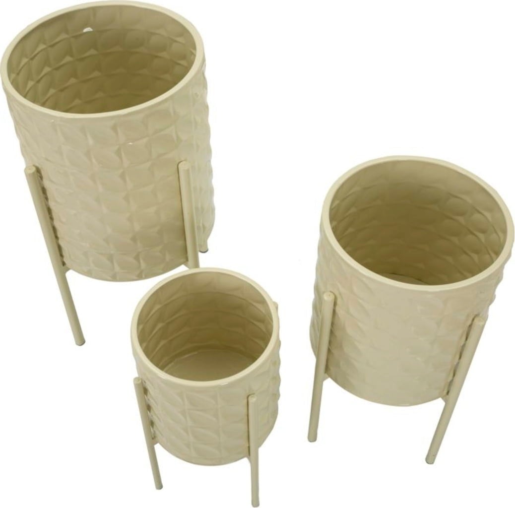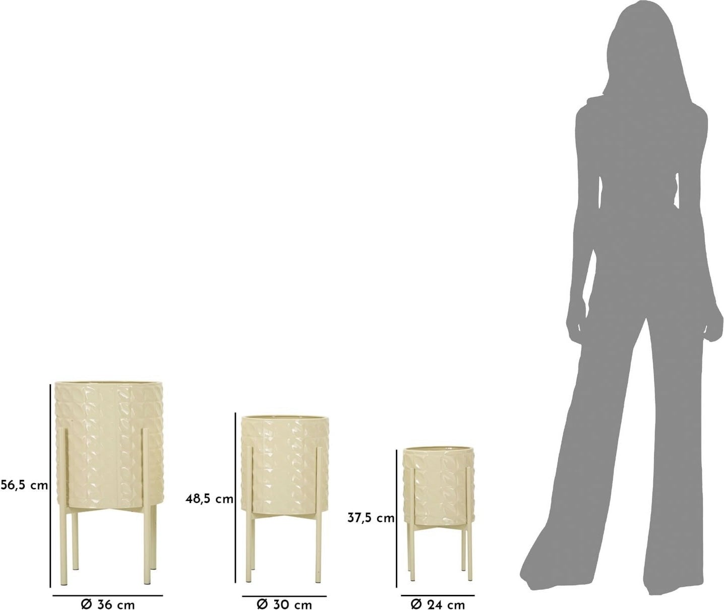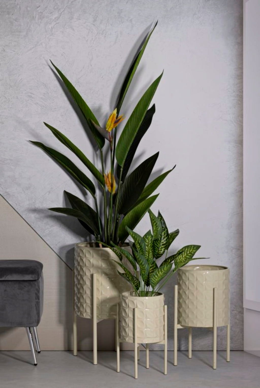 Verleihe deinem Raum mit diesem 3er-Set von Pflanztopfhaltern eine elegante und natürliche Note! Dieses Ensemble ist ein echtes Highlight und begeistert mit einem kühnen, modernen Design, das jeden Raum sofort erhellt. Die Pflanzgefäße aus robustem Metall beeindrucken durch ihr dezent glänzendes Finish und präsentieren sich auf schlanken, hohen Gestellen.