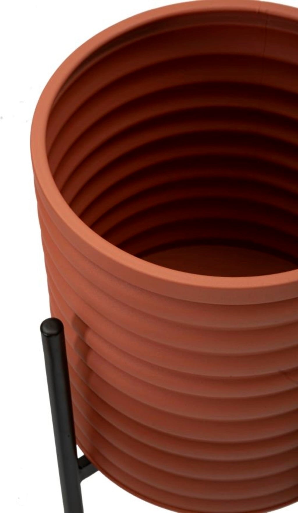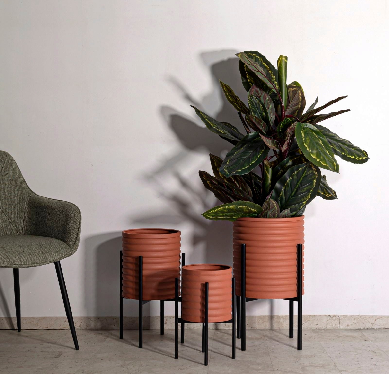 Die Pflanzgefäße stehen auf schlanken, schwarzen Metallständern, die die Vasen stilvoll erhöhen. Ob einzeln oder zusammen arrangiert – dieses Set ist perfekt, um deine Pflanzen modern in Szene zu setzen und jedem Ambiente eine zeitgemäße, erdige Note zu verleihen!