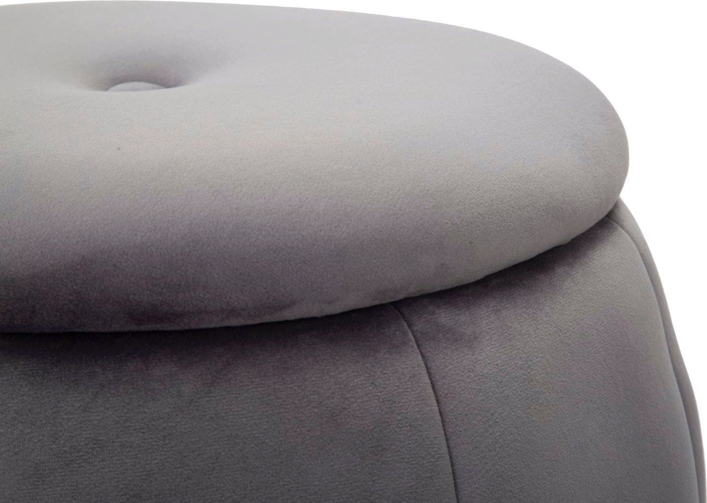 Setze einen glamourösen Akzent in deinem Wohn- oder Schlafzimmer mit diesem eleganten Pouf, dessen Design von den luxuriösen Ankleidezimmern großer Hollywood-Diven inspiriert ist! Er ist mit einem weichen, grauen Samtbezug gepolstert, der ihm eine luxuriöse Haptik verleiht.
