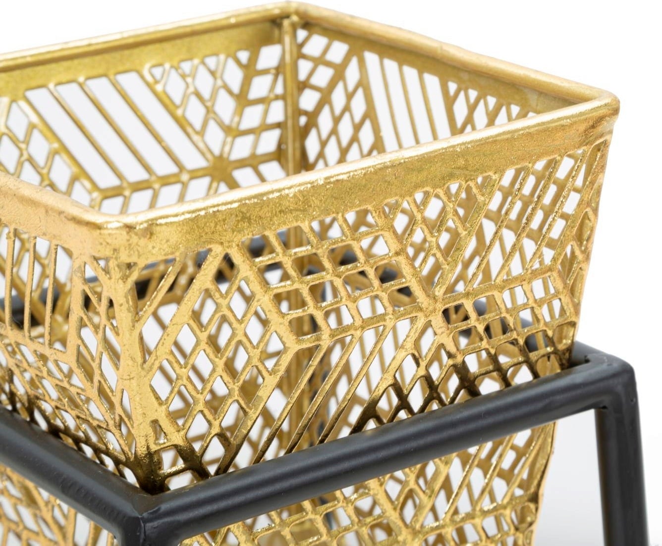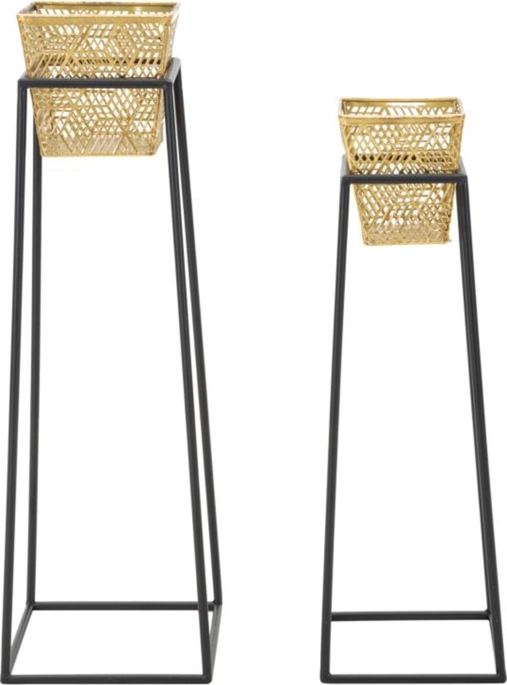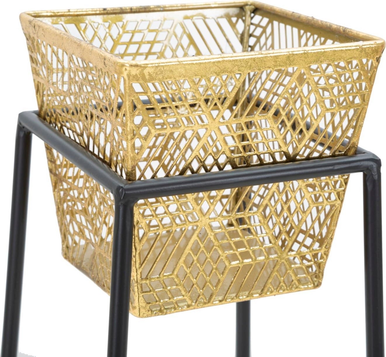 Verleihe deinen Pflanzen eine stilvolle Bühne und deinem Raum eine harmonische Note mit diesem eleganten 2er-Set von Vasenhaltern! Das Design zeichnet sich durch einen spannenden Kontrast aus: Die Pflanzgefäße sind aus fein gearbeitetem, goldfarbenem Metall gefertigt und mit einem filigranen Gittermuster versehen. Sie stehen auf einem hohen, schwarzen Metallständer, dessen geschwungene und geometrische Linienführung für Stabilität und einen modernen, vertikalen Akzent sorgen.