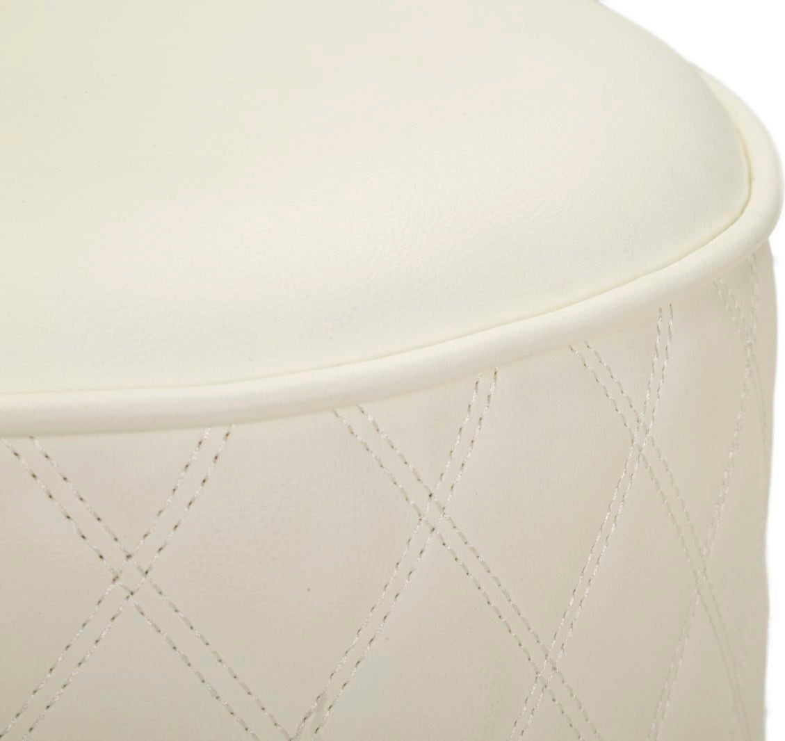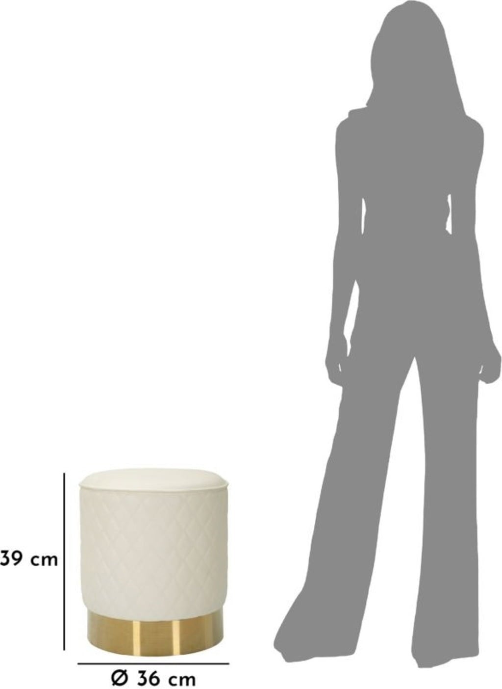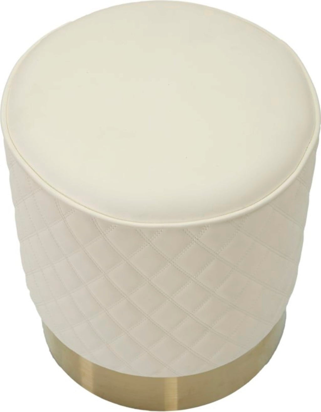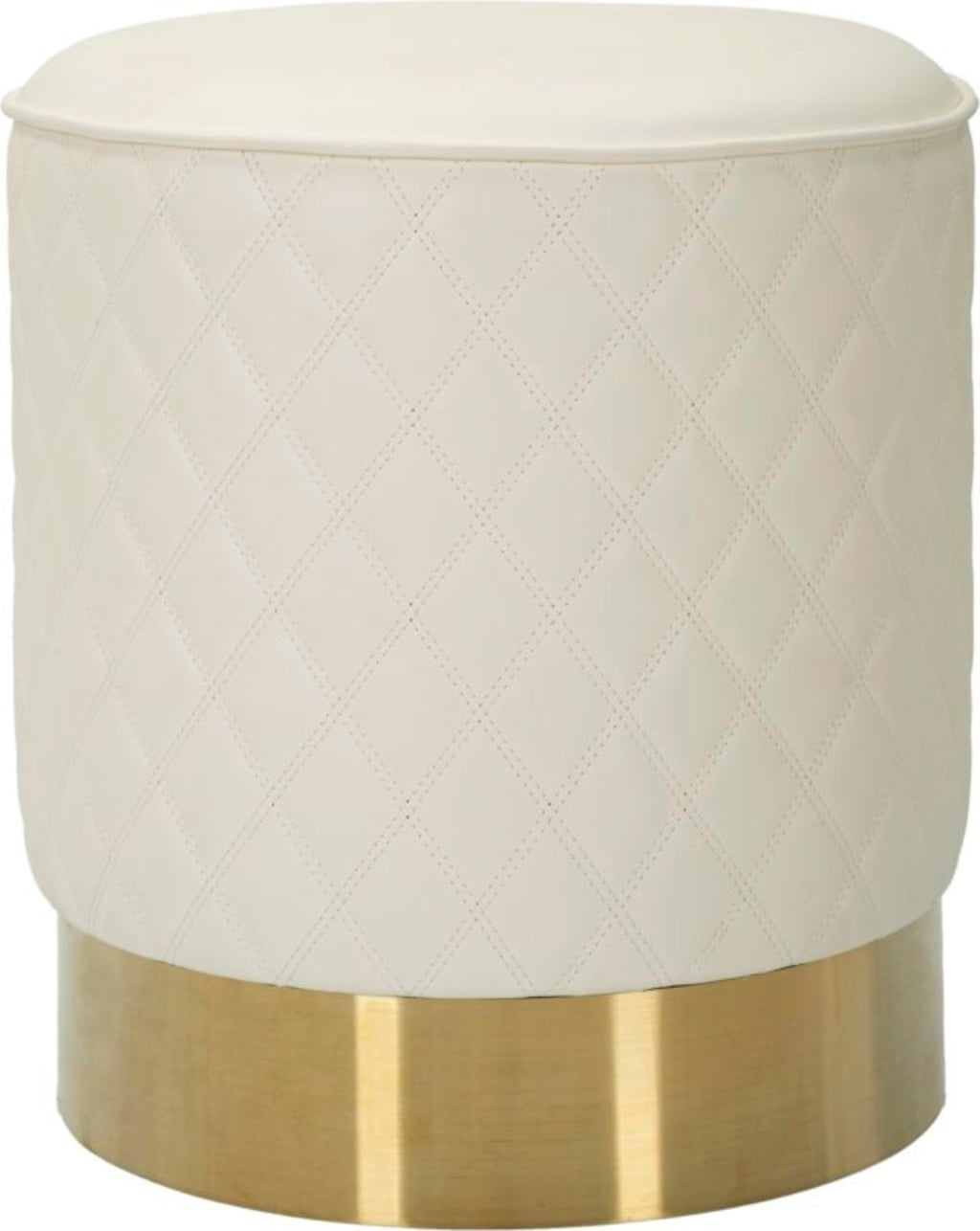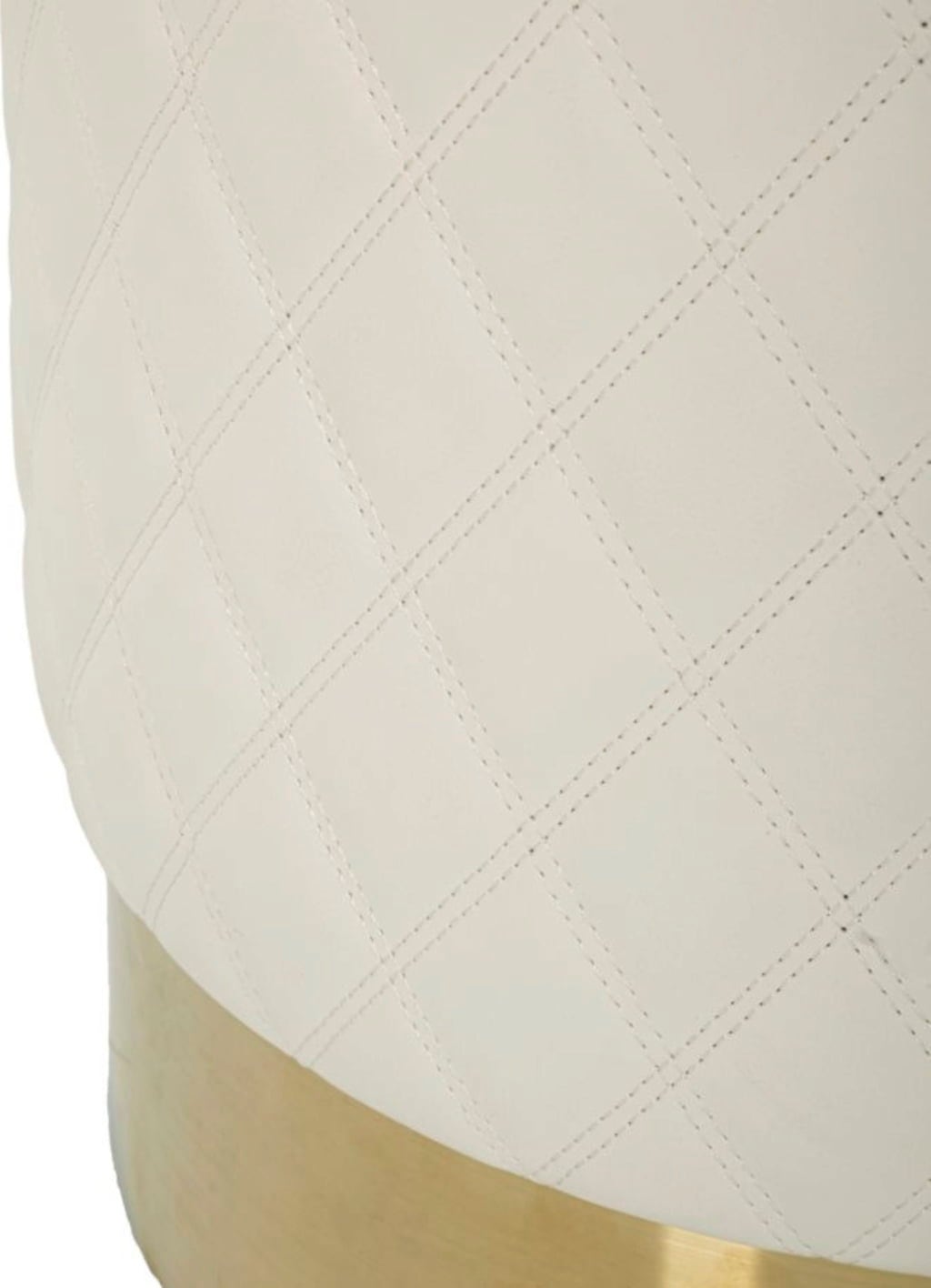 Verleihe deinem Raum einen Hauch von strahlender Opulenz und luxuriösem Design mit diesem eleganten Hocker. Der runde Korpus, bezogen mit cremeweißem Material, besticht durch eine feine, gesteppte Rautenstruktur, die ihm eine klassische und gleichzeitig moderne Textur verleiht. Das absolute Highlight ist der breite, glänzende goldene Metallsockel, der den Hocker stilvoll vom Boden abhebt und für einen markanten Glamour-Akzent sorgt.