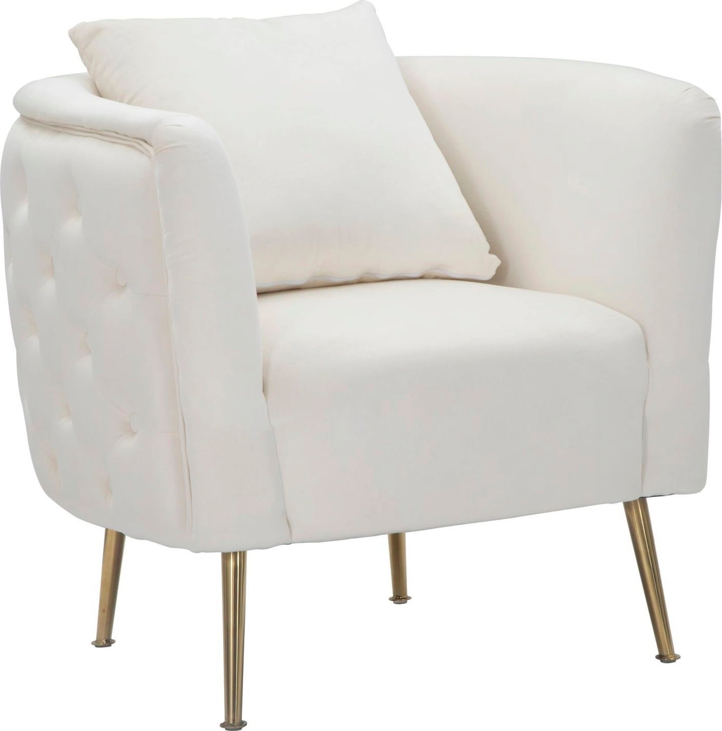 Die Eleganz des Sessels wird durch die schlanken, goldenen Metallbeine unterstrichen, die einen modernen, glamourösen Kontrast zur hellen Farbe bilden. Ein passendes Rückenkissen ist im Lieferumfang enthalten. Ideal als Blickfang im Wohnzimmer oder für die gemütliche Leseecke!