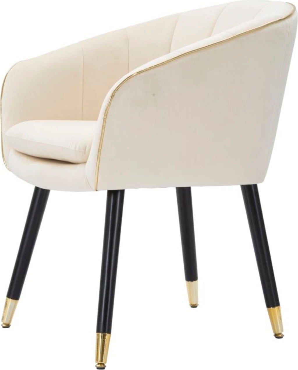 Der Sessel steht auf robusten, schräg gestellten schwarzen Holzbeinen, die an den Füßen mit glänzenden goldenen Details veredelt sind – eine zeitlose Farbkombination, die pure Eleganz ausstrahlt. Ideal für deine Lese-Ecke oder als stilvolle Ergänzung zum Sofa.