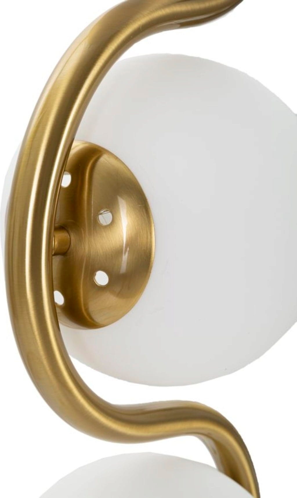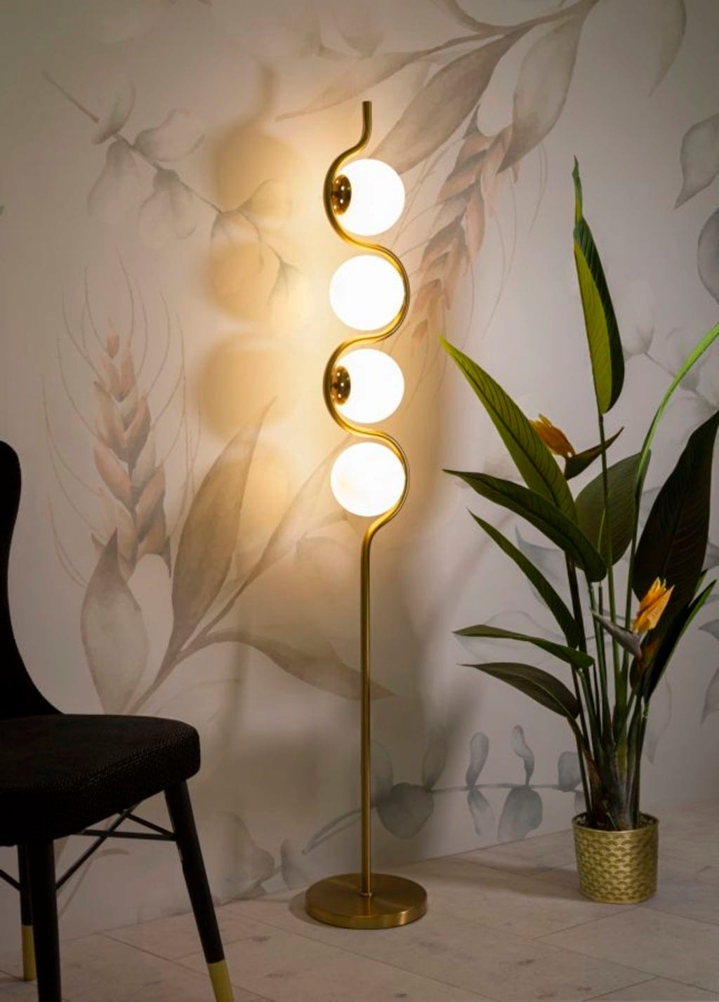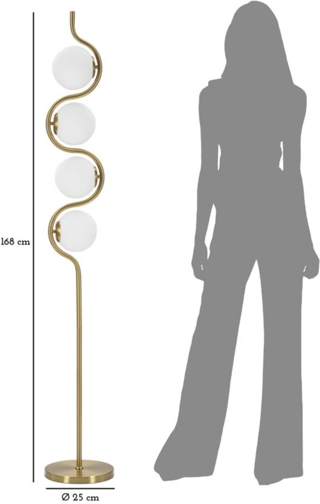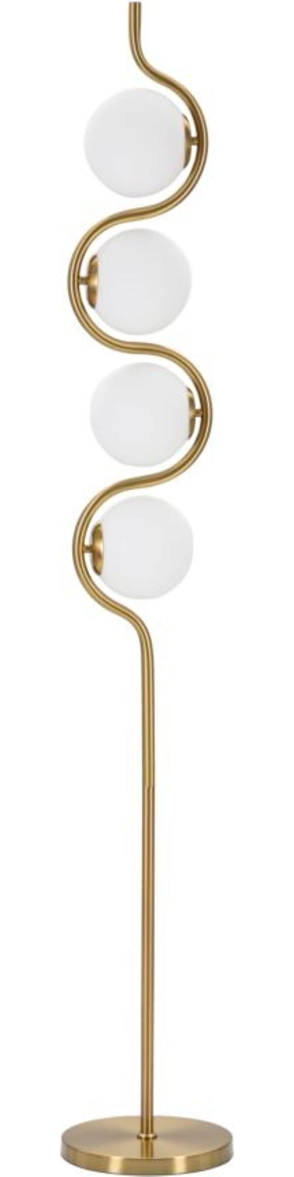 Das Herzstück des Designs ist der S-förmig gewundene Metallstab, in dessen Kurven vier elegante weiße Glaskugeln eingebettet sind. Diese vier Lichtpunkte sorgen für eine sanfte, blendfreie Ausleuchtung und schaffen eine warme Wohlfühlatmosphäre. Die Kombination aus dem luxuriösen Gold-Finish und den opalweißen Kugeln verleiht der Lampe eine zeitlose Eleganz, die sowohl moderne als auch klassische Interieurs veredelt.