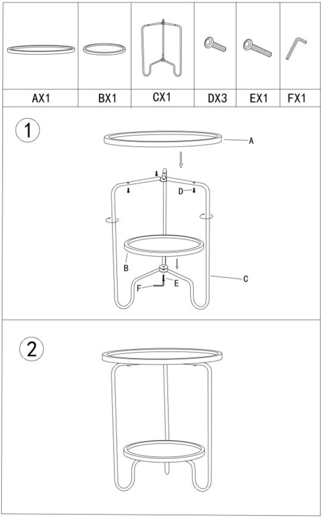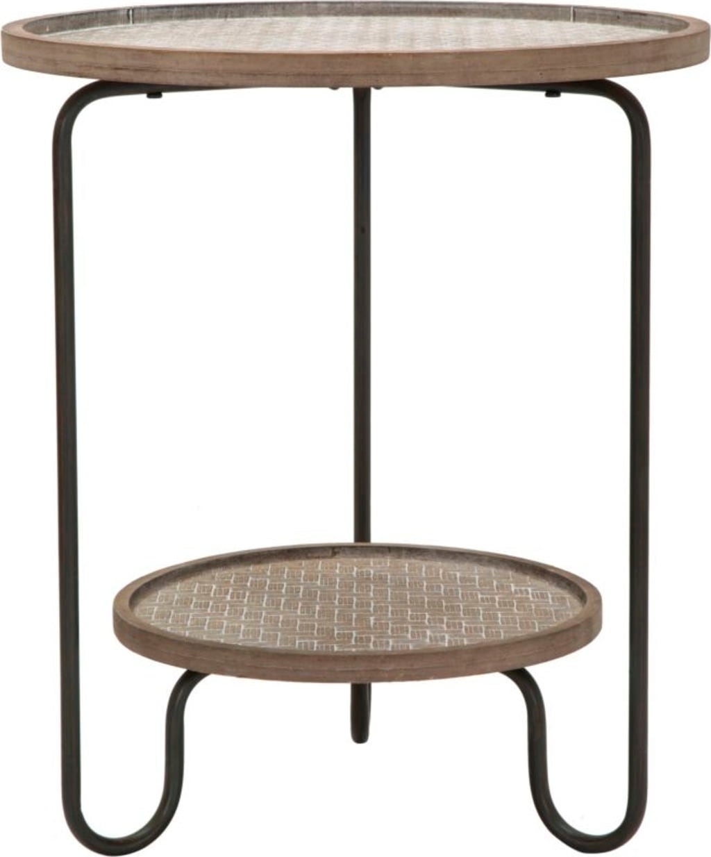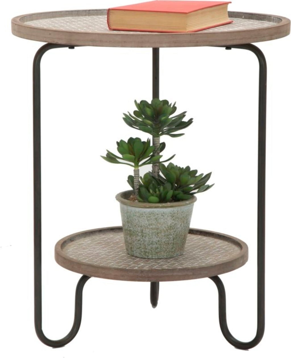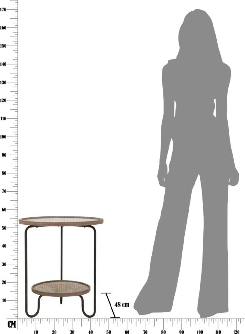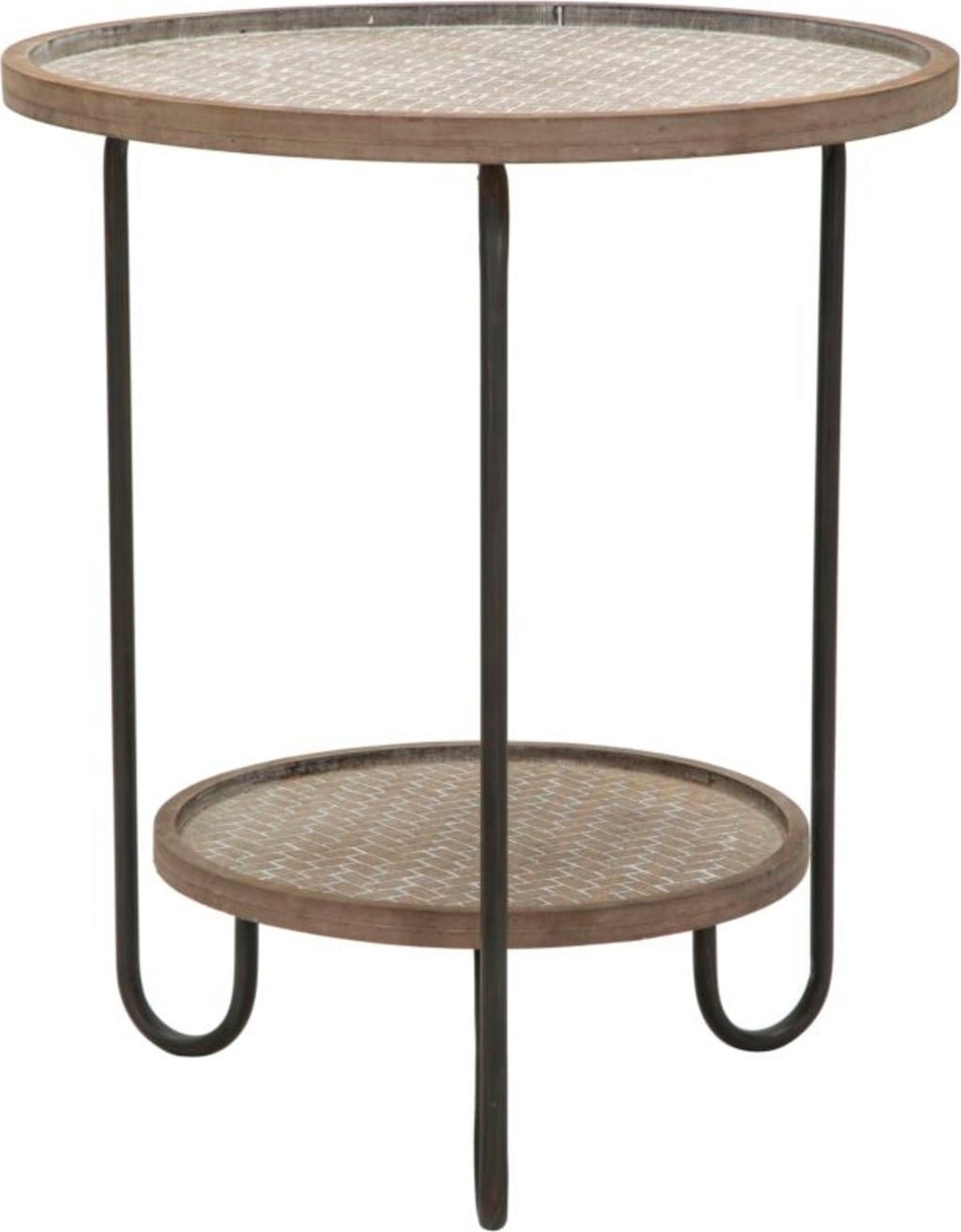 Der Tisch verfügt über zwei runde Ablageflächen: Die Platten bestehen aus Holz und sind mit einer modernen Flecht-Optik versehen, die einen warmen, natürlichen Akzent setzt. Die untere Ablage dient als praktisches Fach für Zeitschriften oder Fernbedienungen.