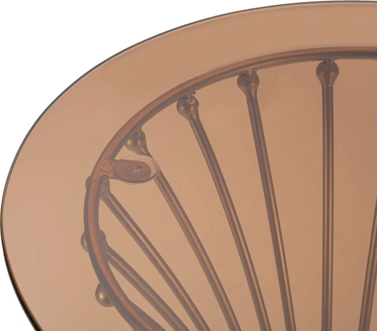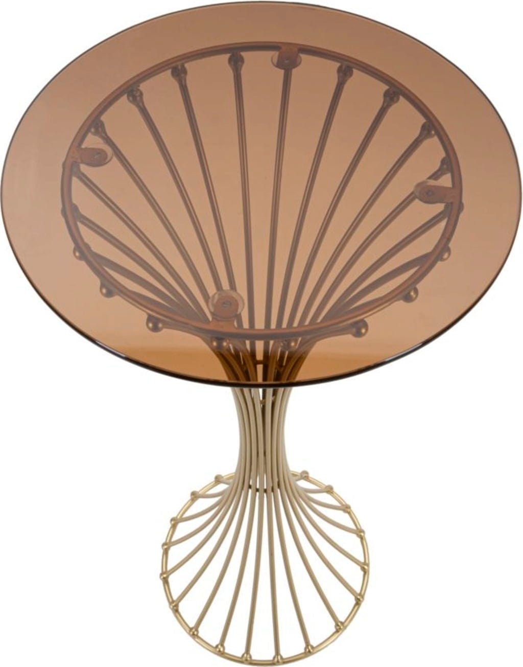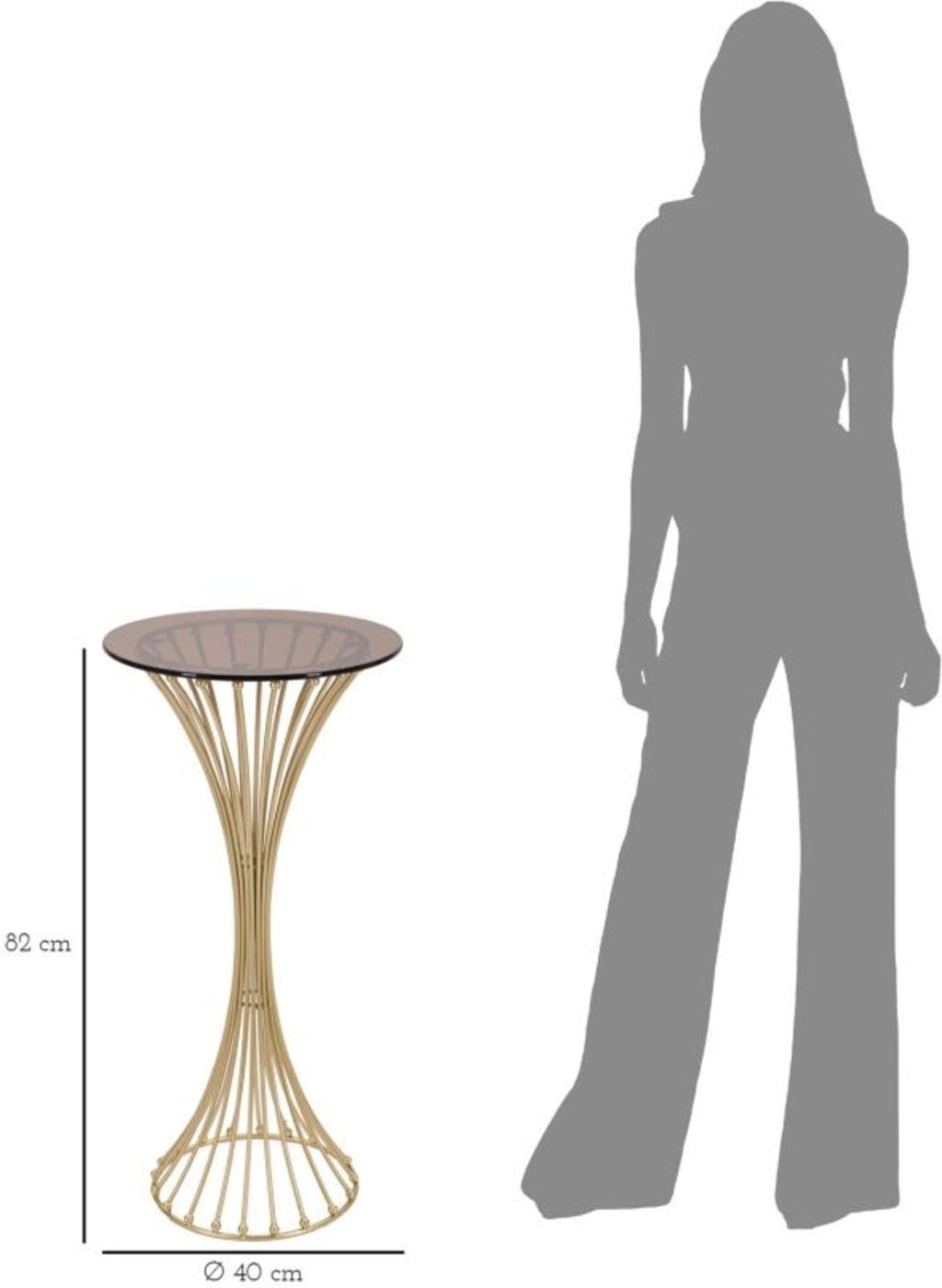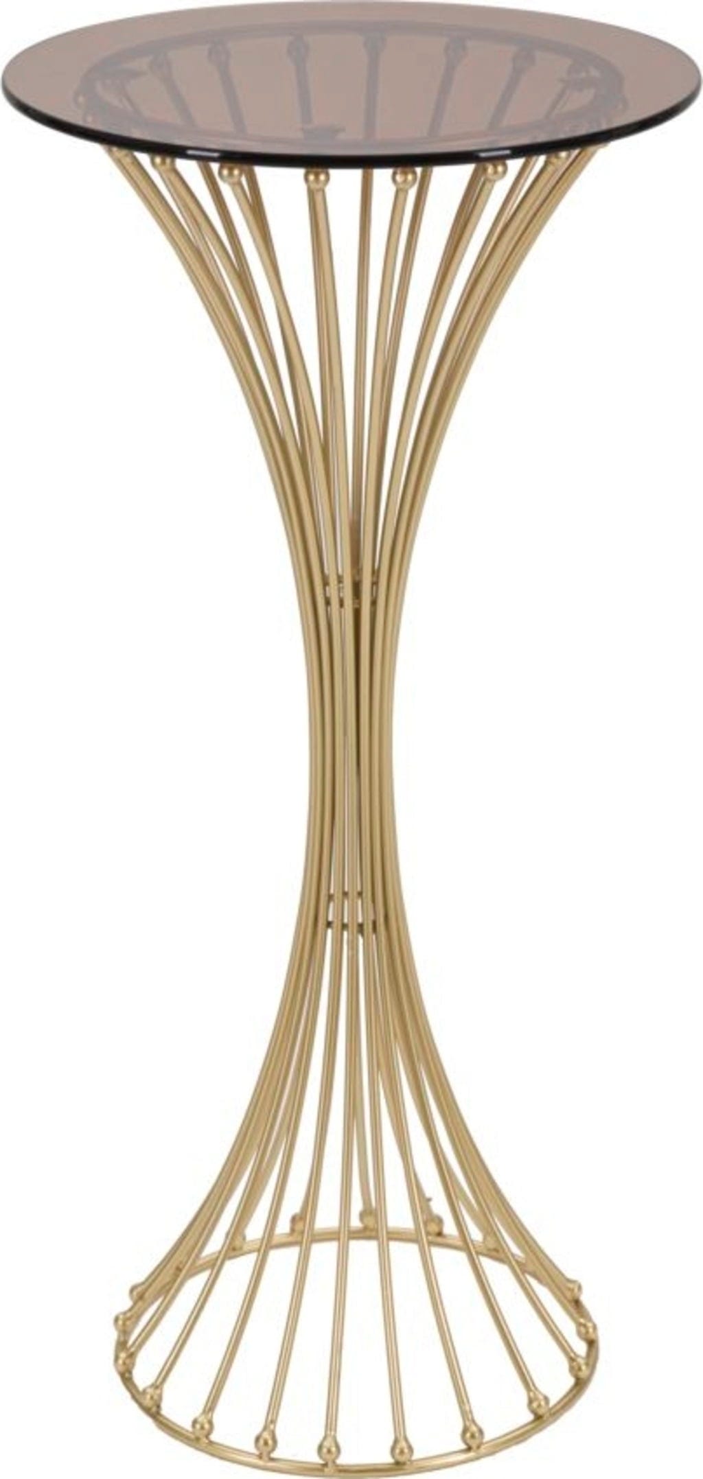 Das Gestell wird aus zahlreichen vertikalen Metallstreben gebildet, die sich in der Mitte elegant verjüngen und an den Enden mit kleinen, glänzenden Kugeln verziert sind. Gekrönt wird das Design durch eine Tischplatte aus hochwertigem Rauchglas, die dem Objekt eine moderne Tiefe verleiht und perfekt mit dem warmen Goldton harmoniert. Ob als extravaganter Beistelltisch oder als zentraler Blickfang – der Centur bringt puren Glamour in dein Zuhause.