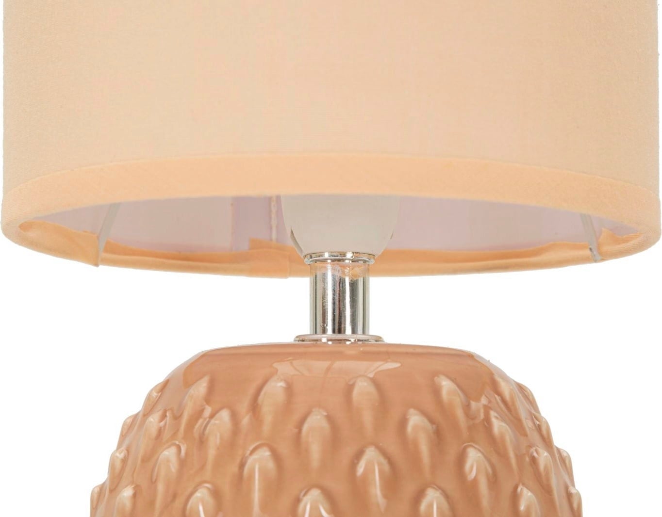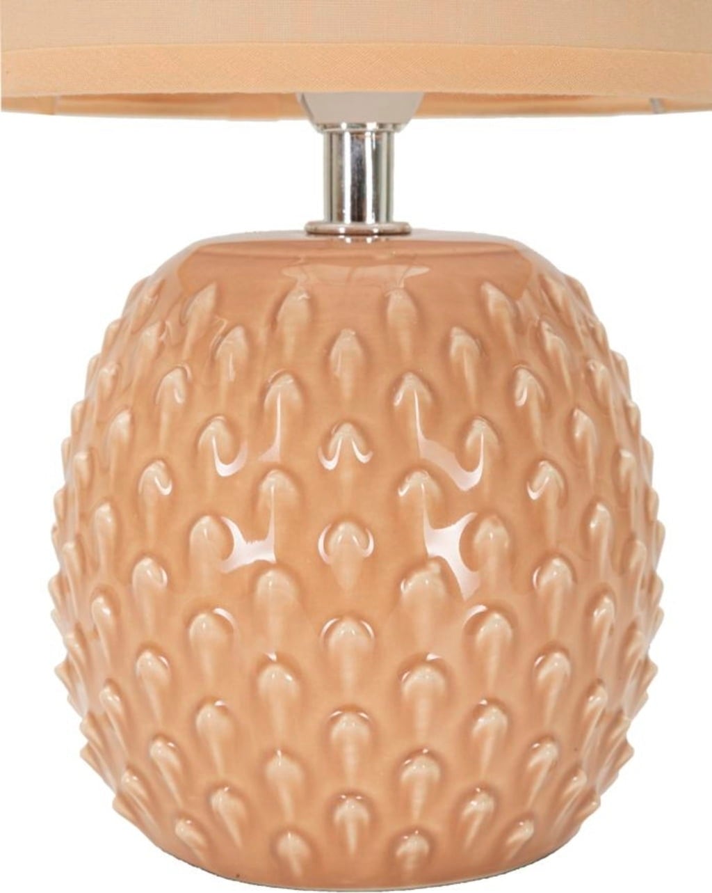 Verleihe deinem Schlafzimmer mühelos einen Hauch von zarter Eleganz und modernem Stil. Diese charmante Nachttischlampe in einem warmen Pfirsichton ist das ideale Accessoire für eine feminine und ruhige Atmosphäre. Der Lampenfuß besticht durch seine einzigartige und spürbare Reliefverzierung aus feinen Spitzen – ein detailreiches, taktisches Design, das sofort ins Auge fällt.