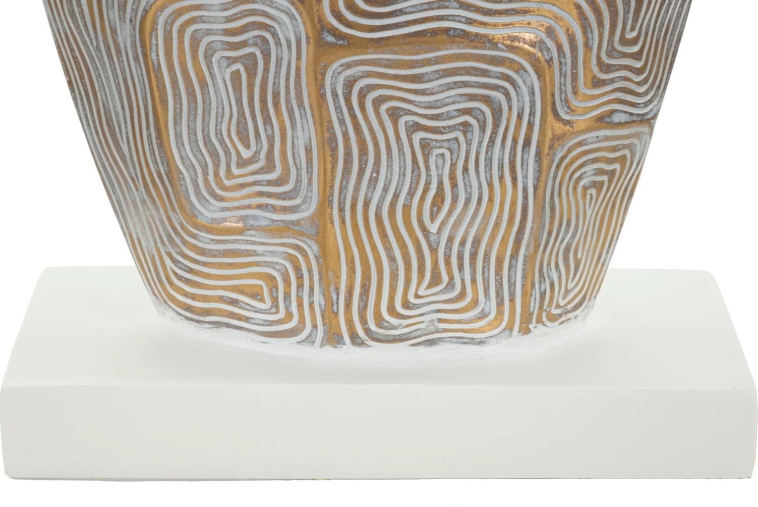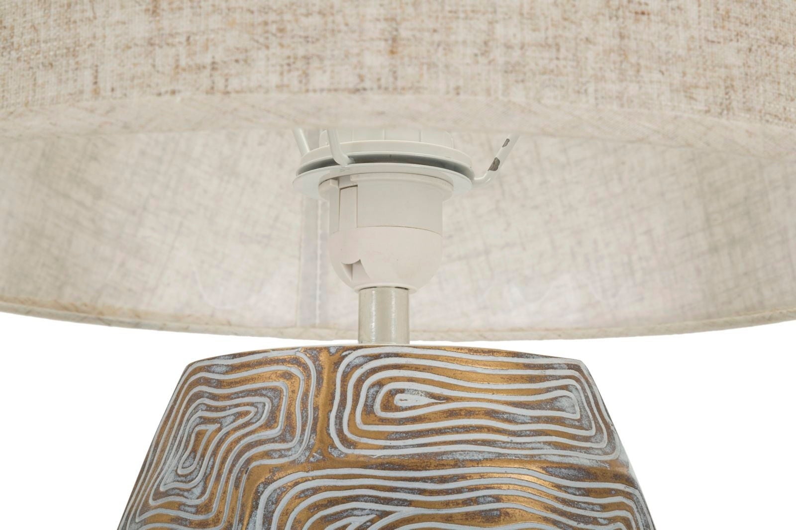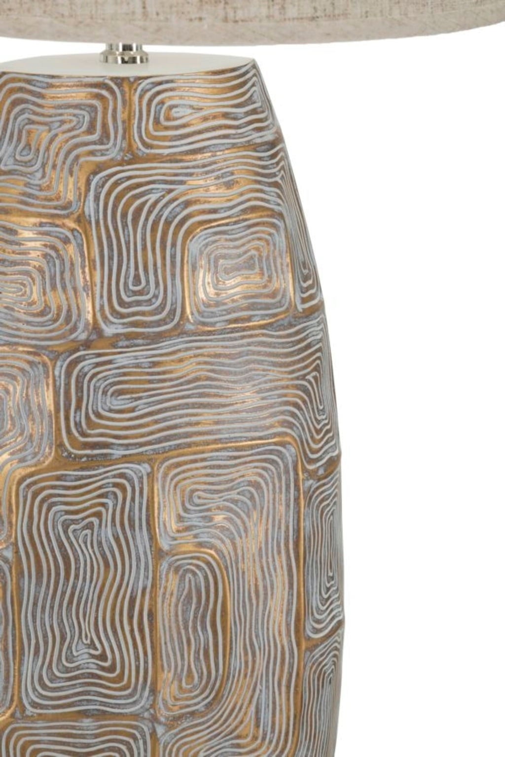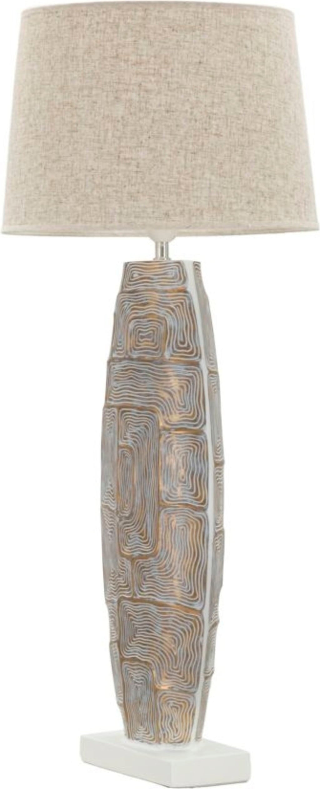 Verleihe deinem Zuhause sofort eine exquisite und charaktervolle Note mit dieser einzigartigen Tischleuchte! Die leicht ovale Basis aus hochwertigem Kunstharz wird zum Blickfang durch ein faszinierendes, geometrisches Relief, das in eleganten Graublau- und warmen Goldtönen schimmert.