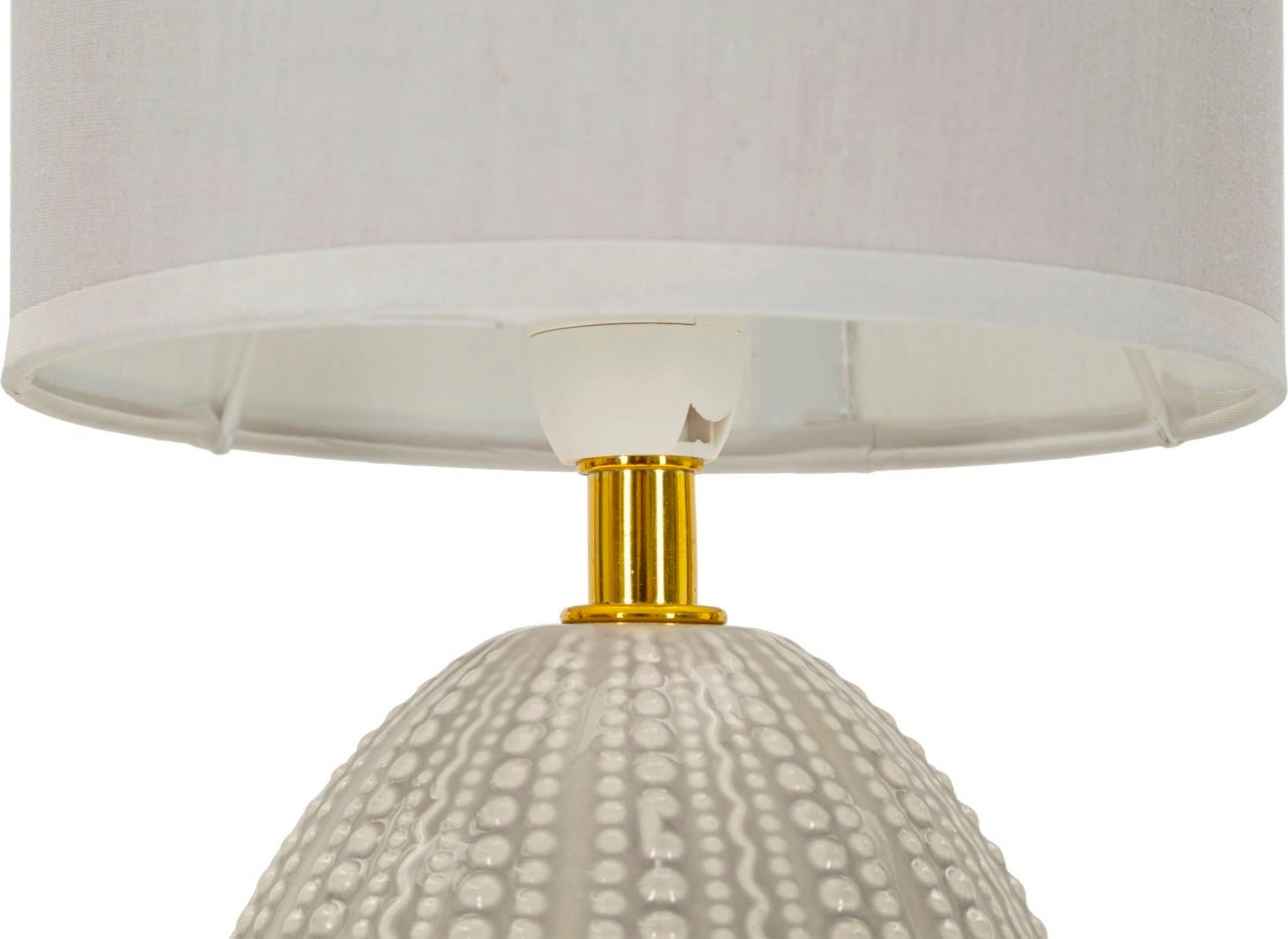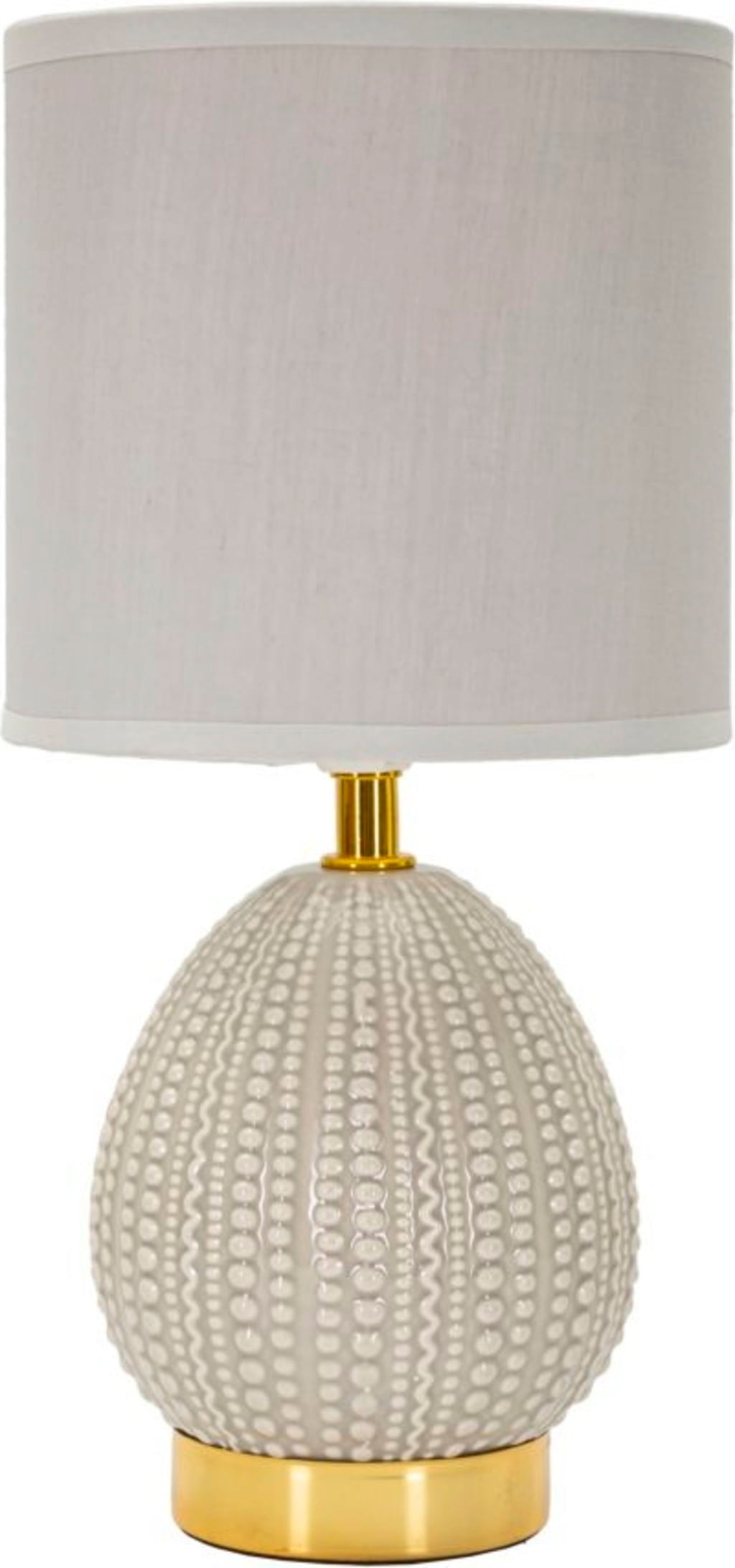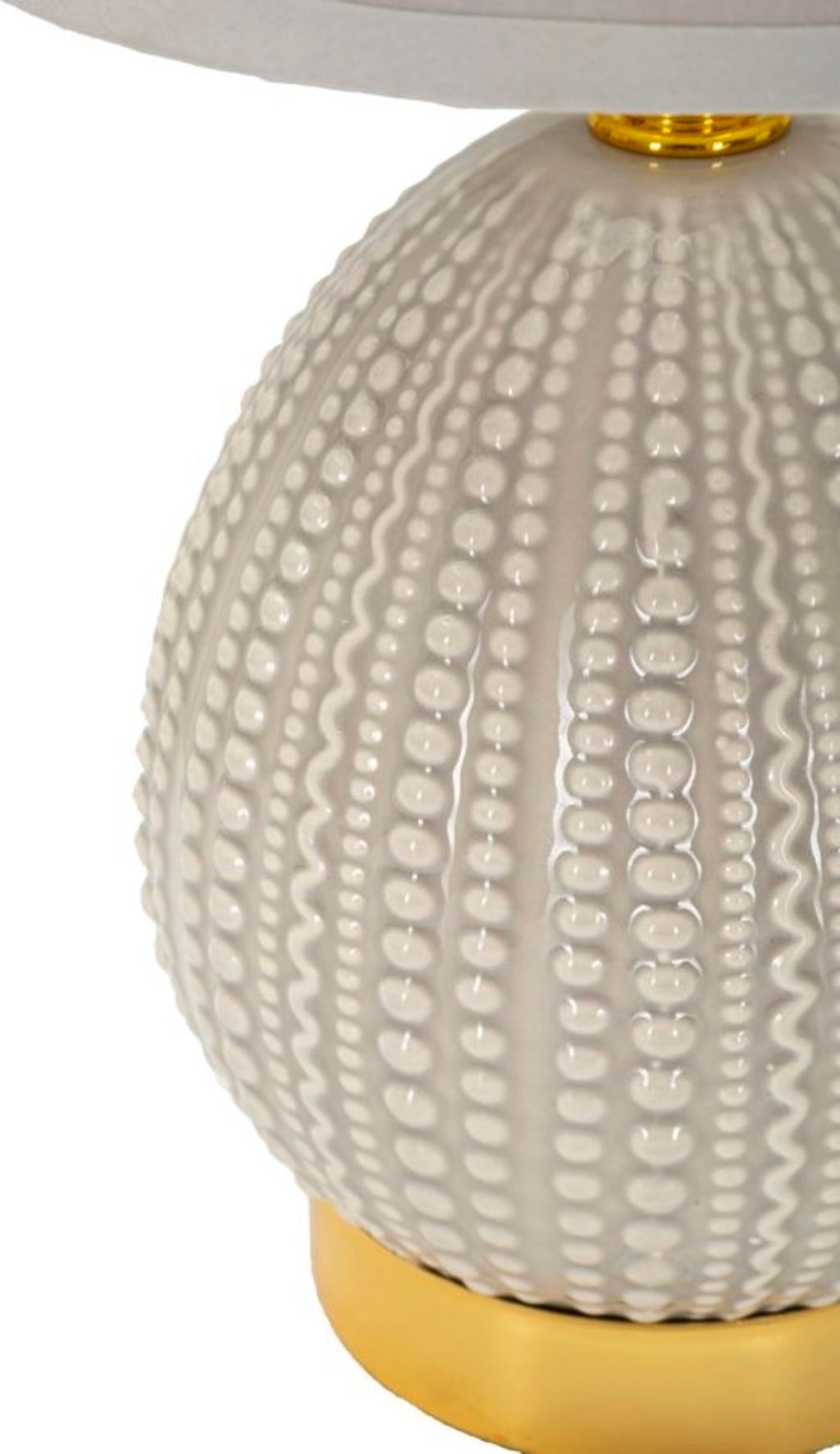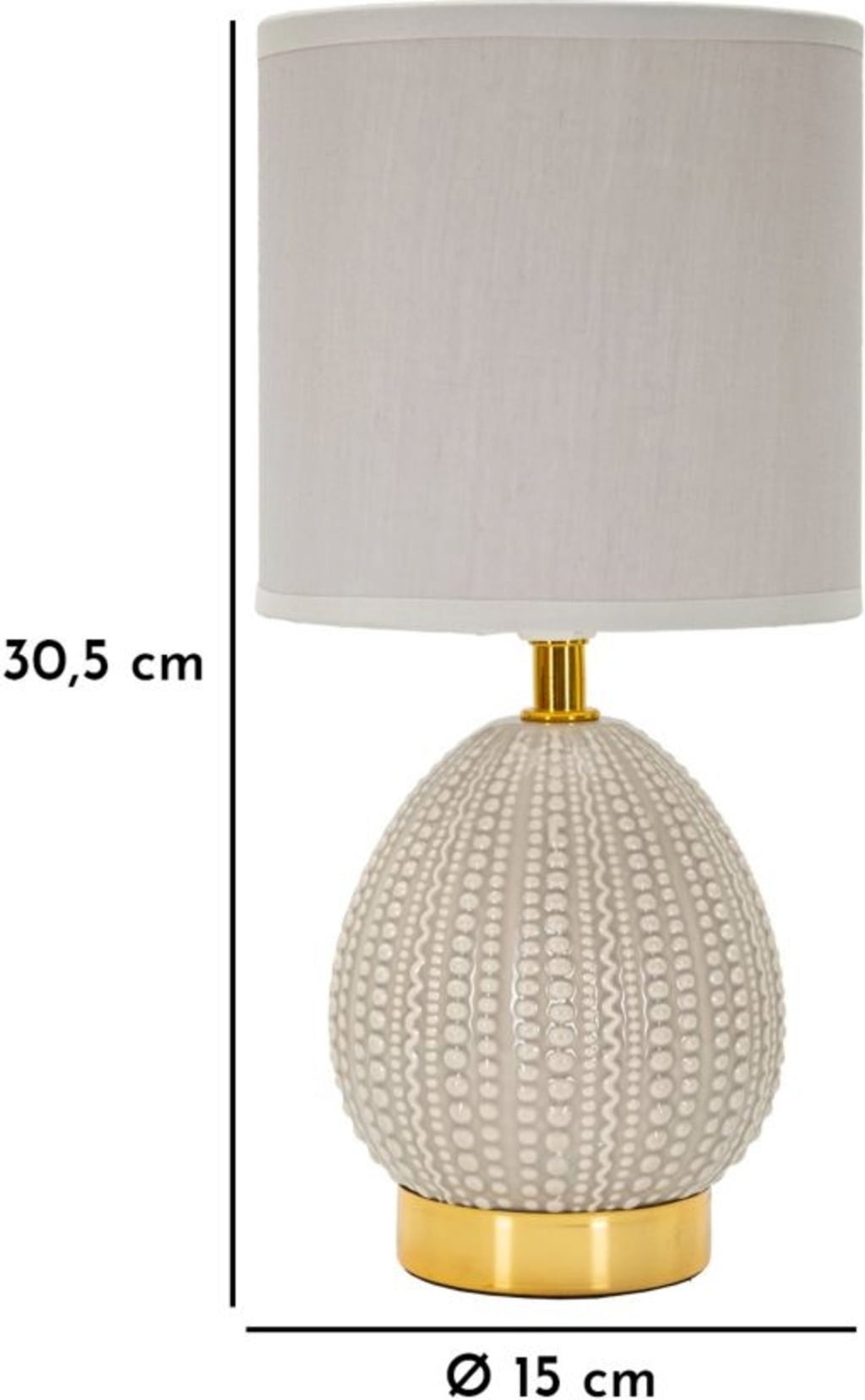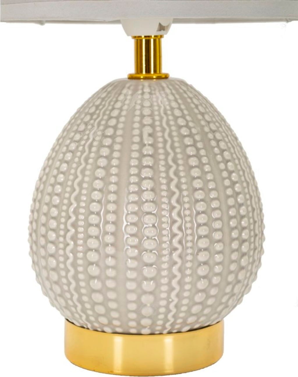 Verleihe deinem Zimmer mit dieser eleganten Nachttischlampe im Handumdrehen modernen Stil und subtile Helligkeit. Der Lampenfuß in hellem, zeitlosem Grau besticht durch eine einzigartige, feine Reliefverzierung aus unregelmäßigen Punkten. Diese unkonventionelle Textur sorgt für einen modernen, spürbaren Akzent, der dennoch Ruhe ausstrahlt.